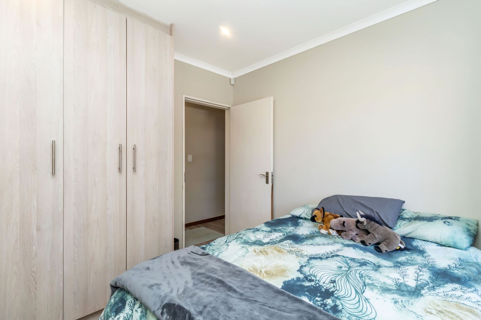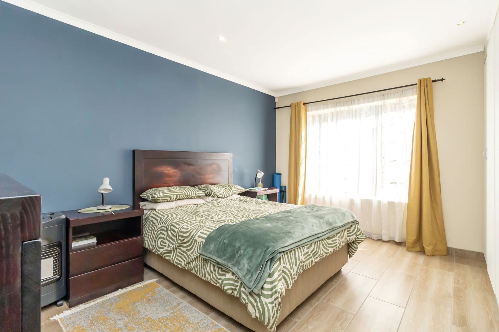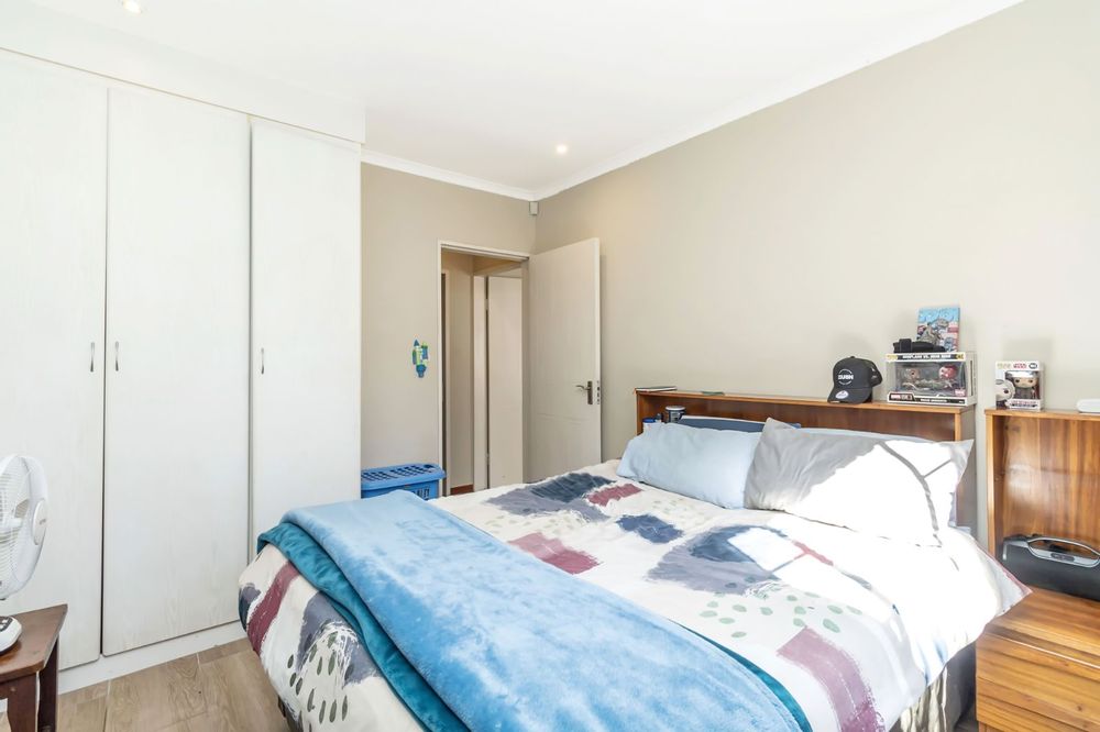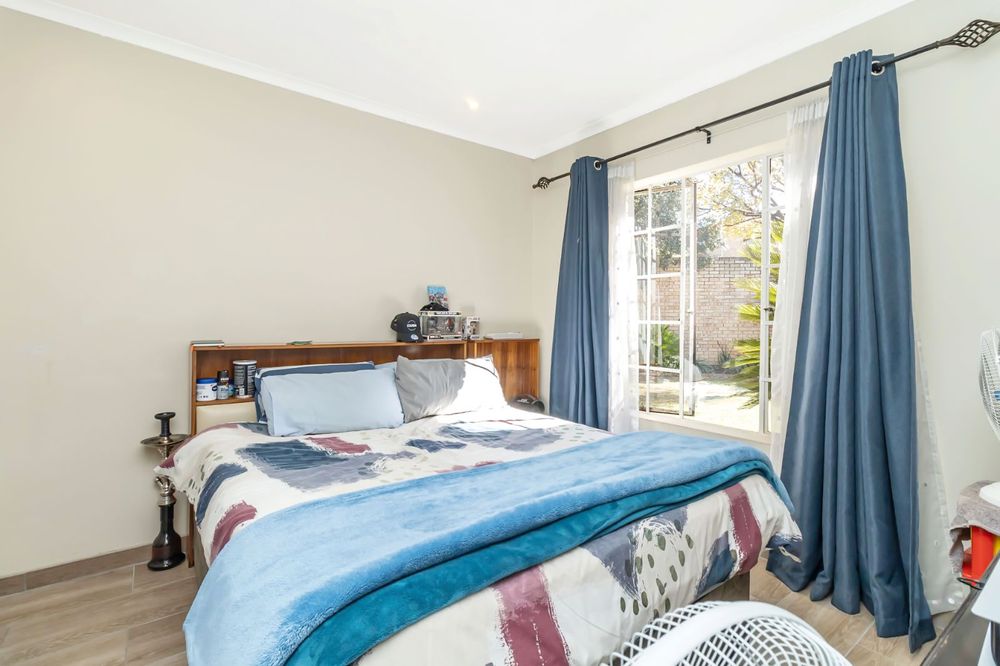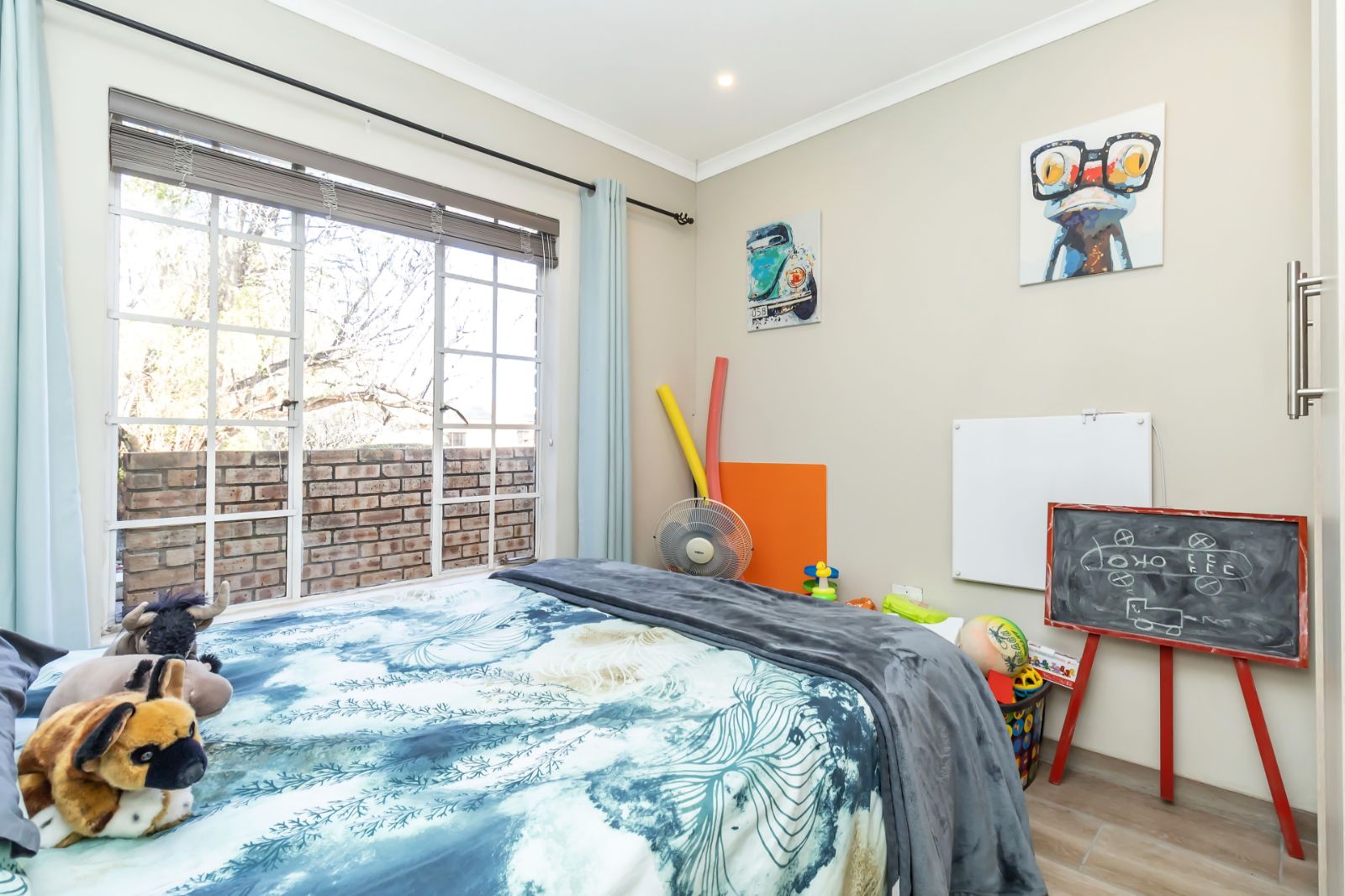 aluminium sliding doors overlooking a nice size garden, a built in braai and a sparkling swimming pool.