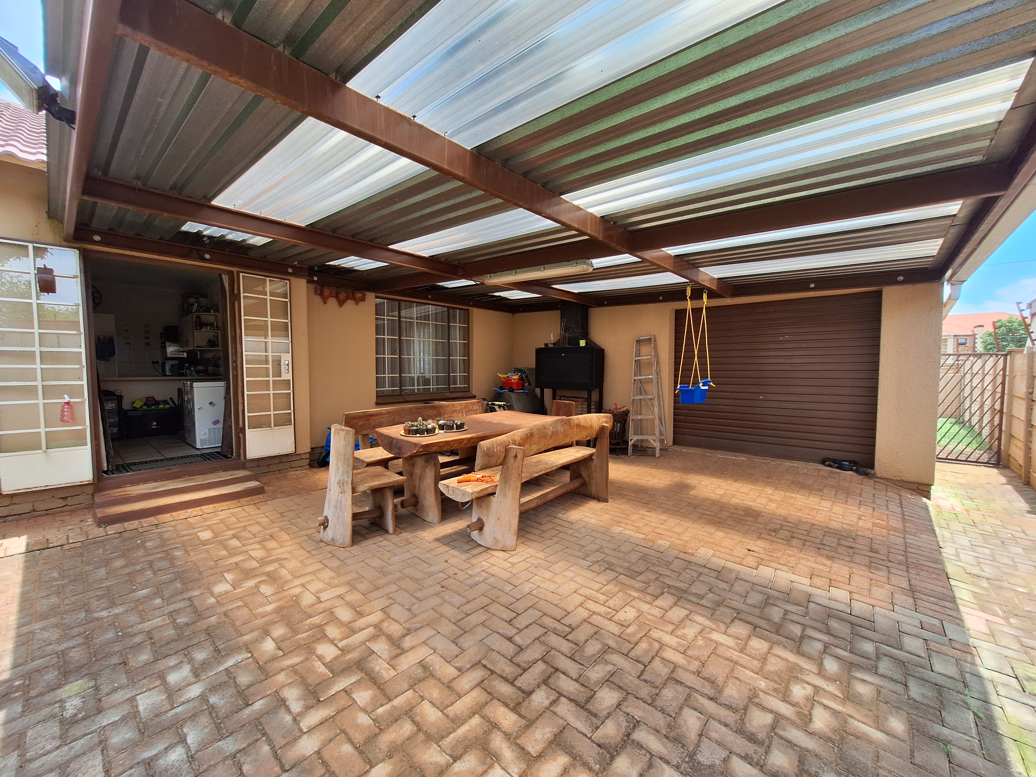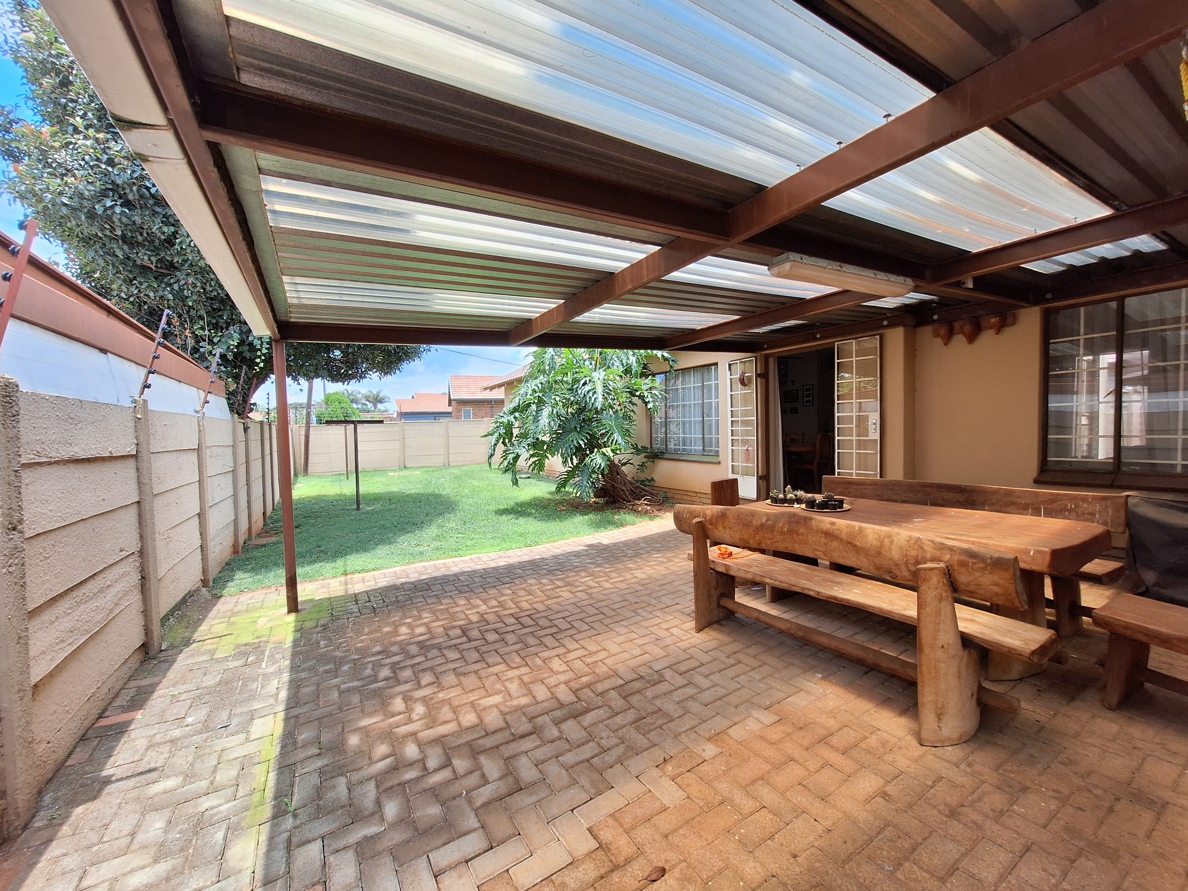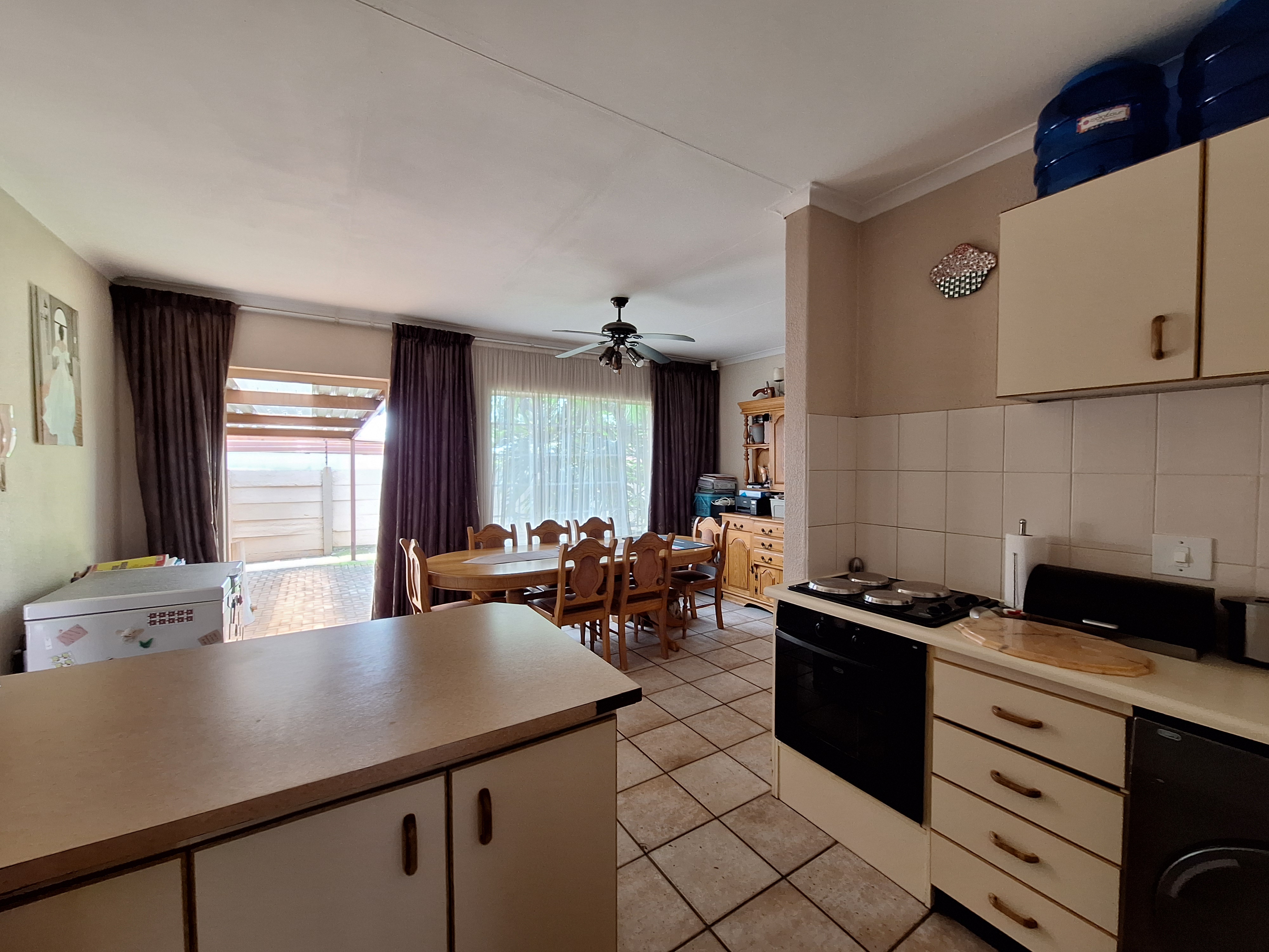 Step into a welcoming lounge that flows seamlessly into the dining area. Double doors open onto an undercover patio with a built-in braai, perfect for relaxed family living and entertaining. The open-plan kitchen features a breakfast counter, space for one appliance, and is complemented by a separate scullery/laundry for added convenience.
