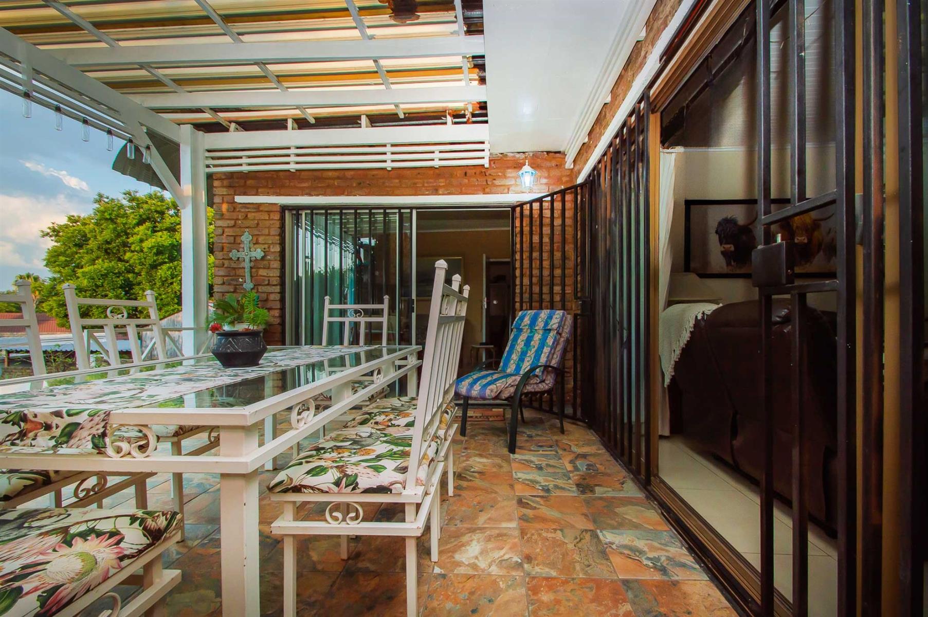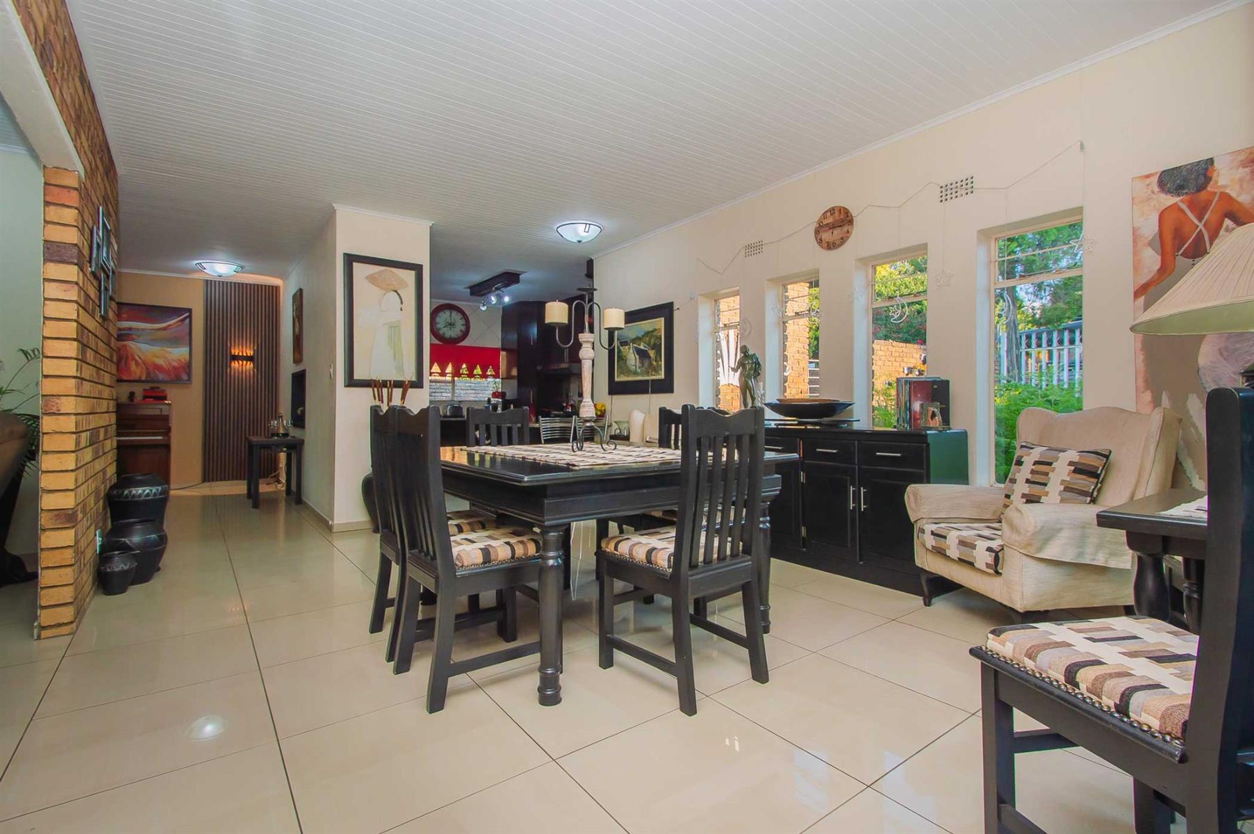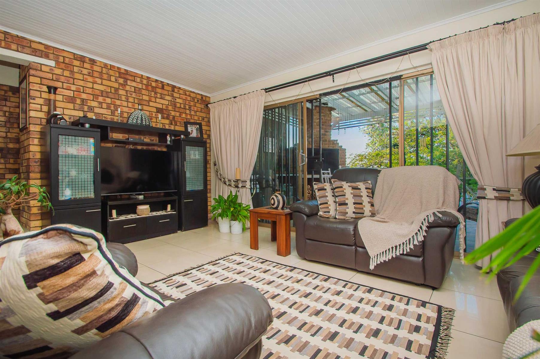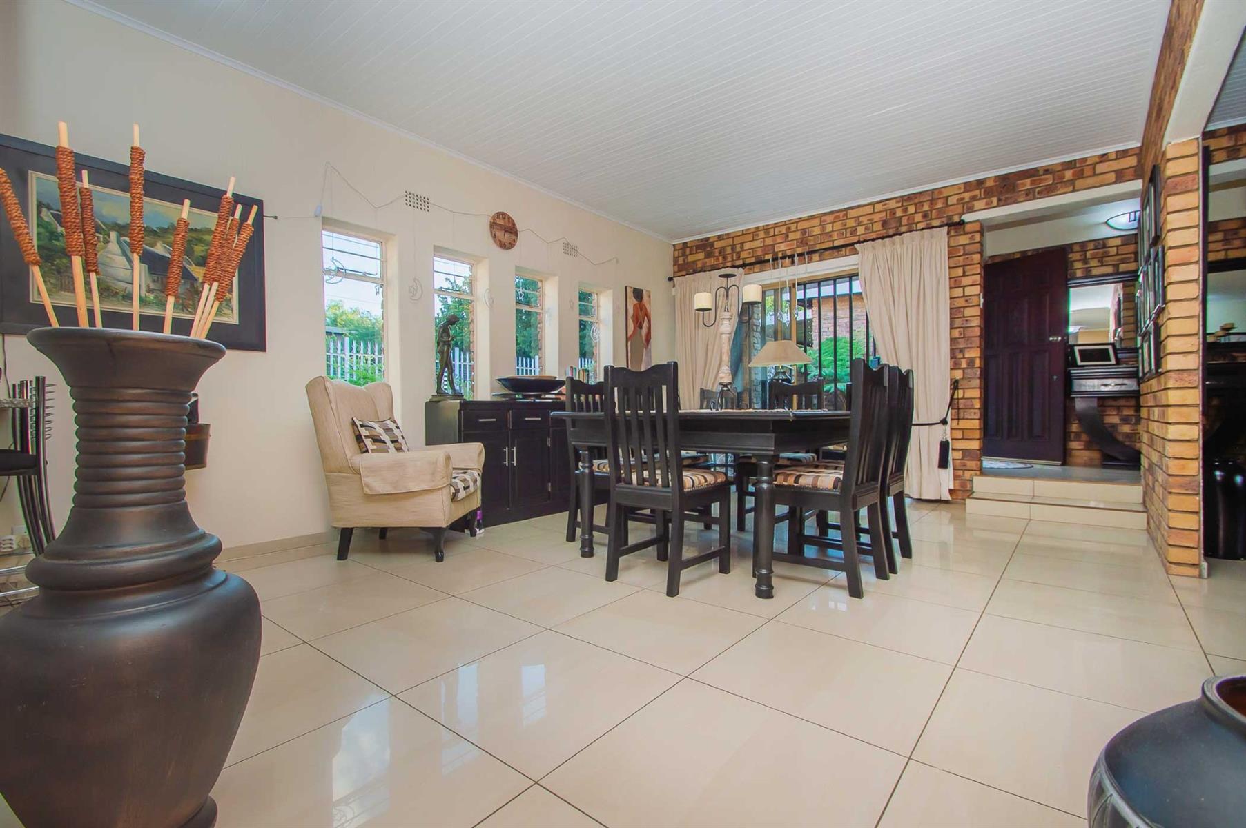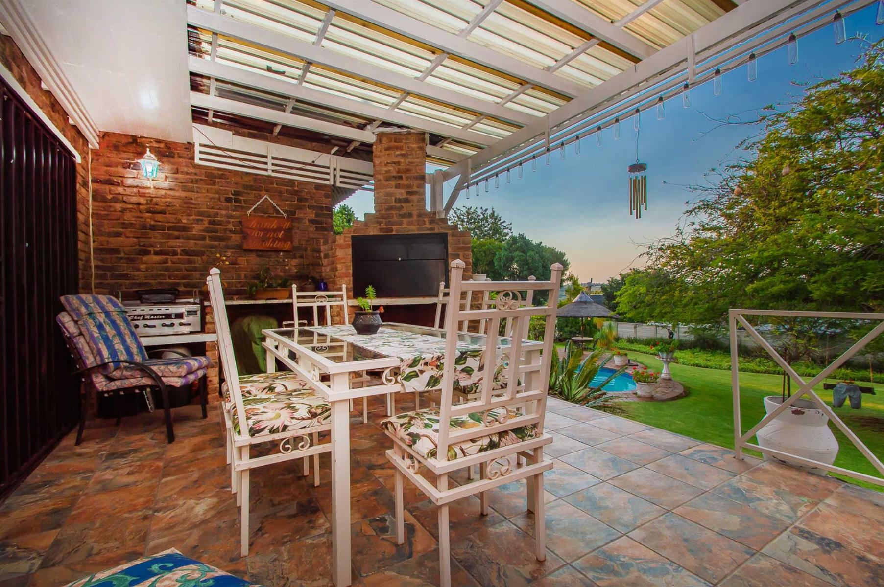 A generously sized and versatile family room opens onto a charming, covered patio with a built-in braai — an ideal setting for relaxed gatherings with family and friends. From here, enjoy views of the sparkling swimming pool and manicured, low-maintenance garden where children and pets can play freely and safely.