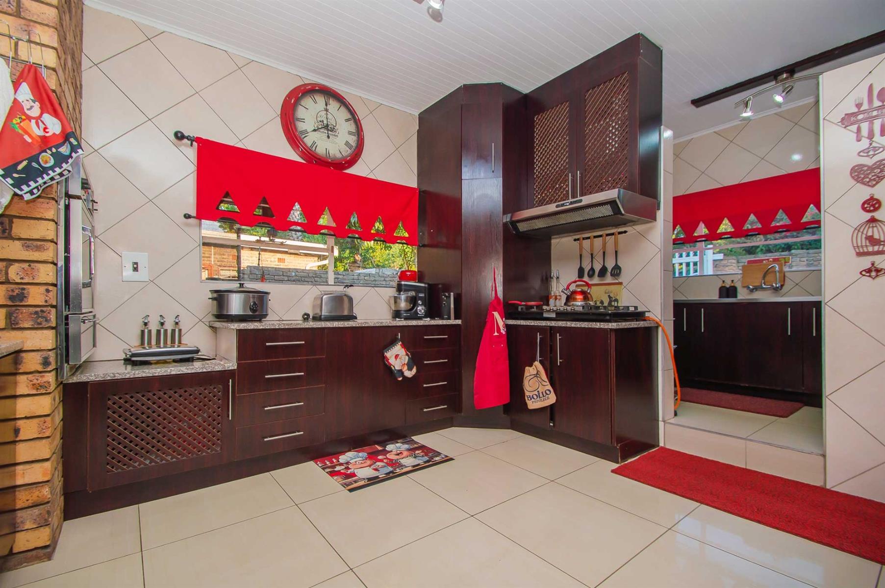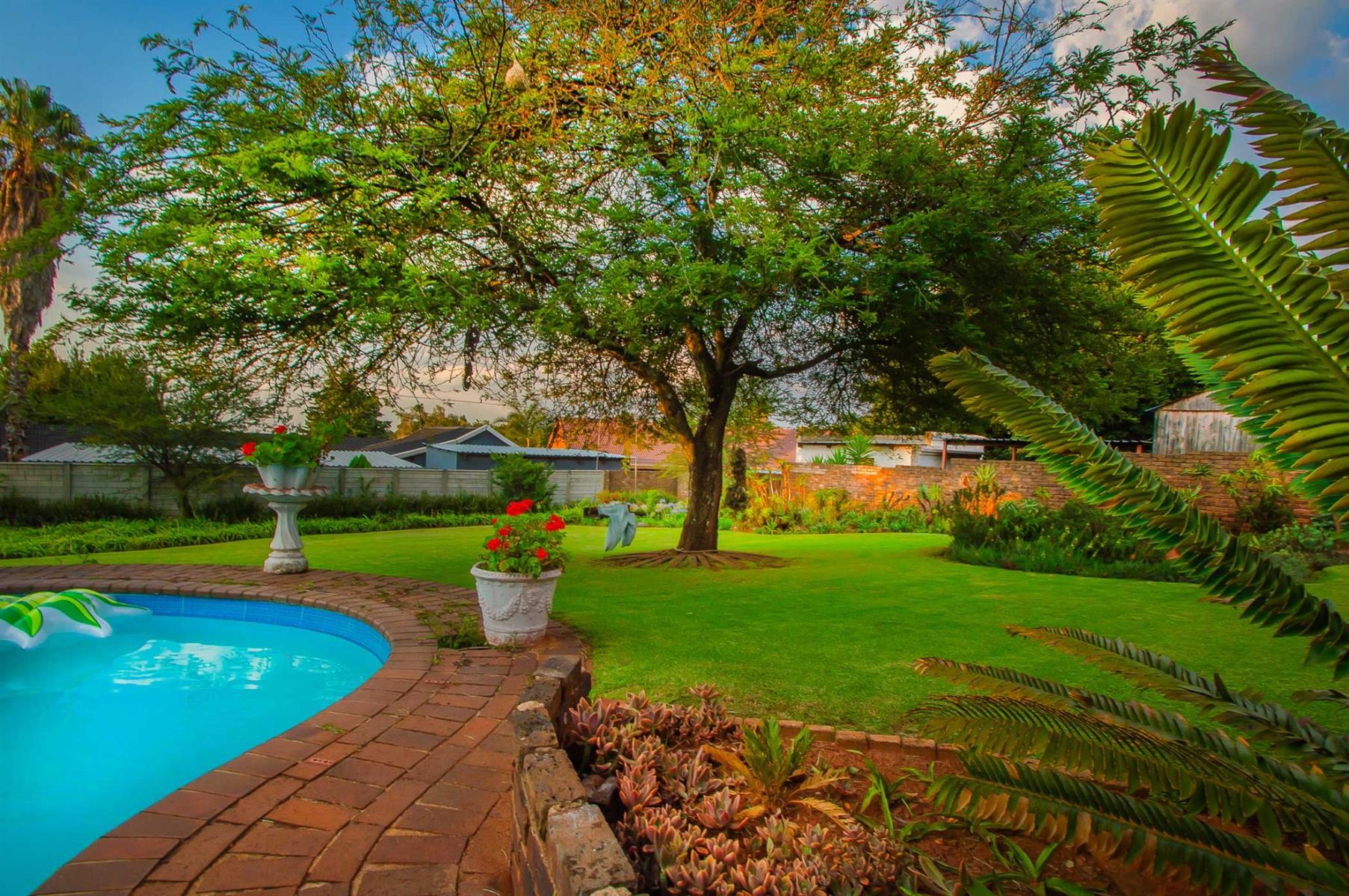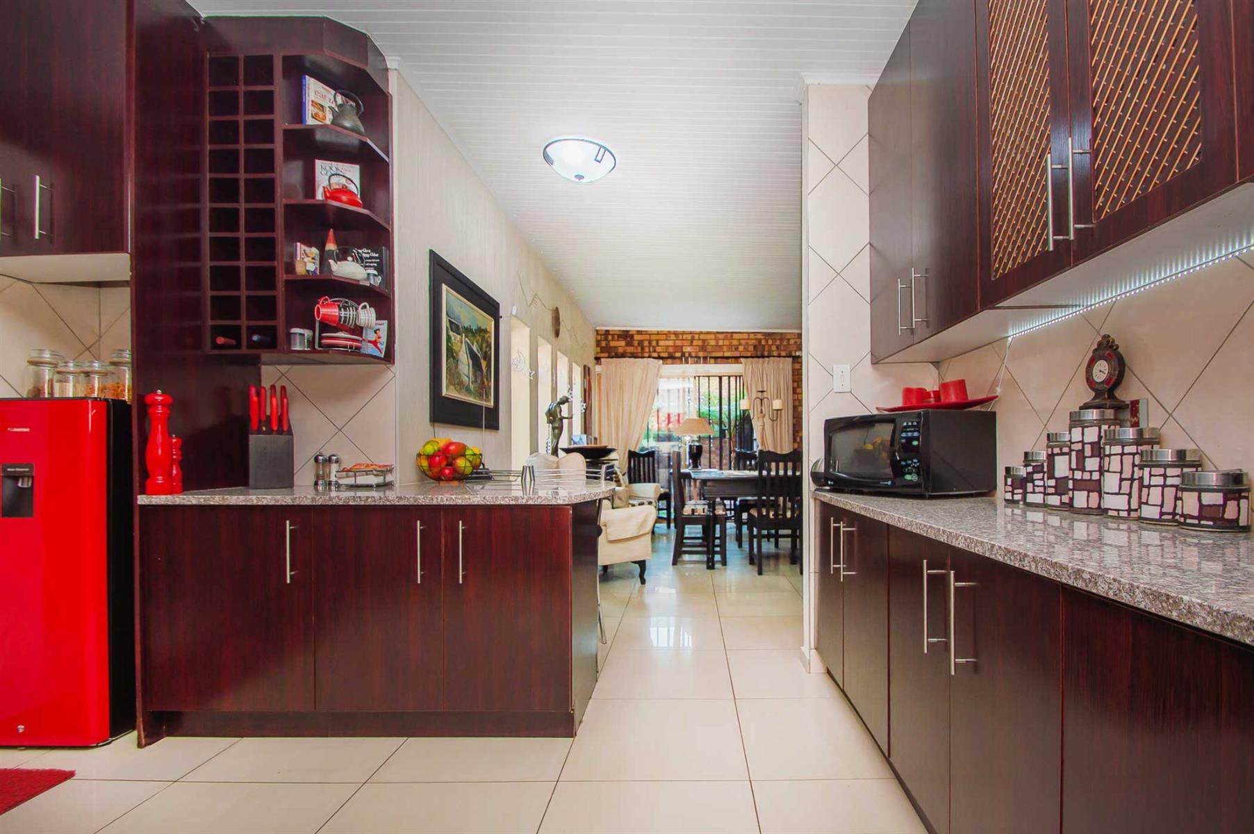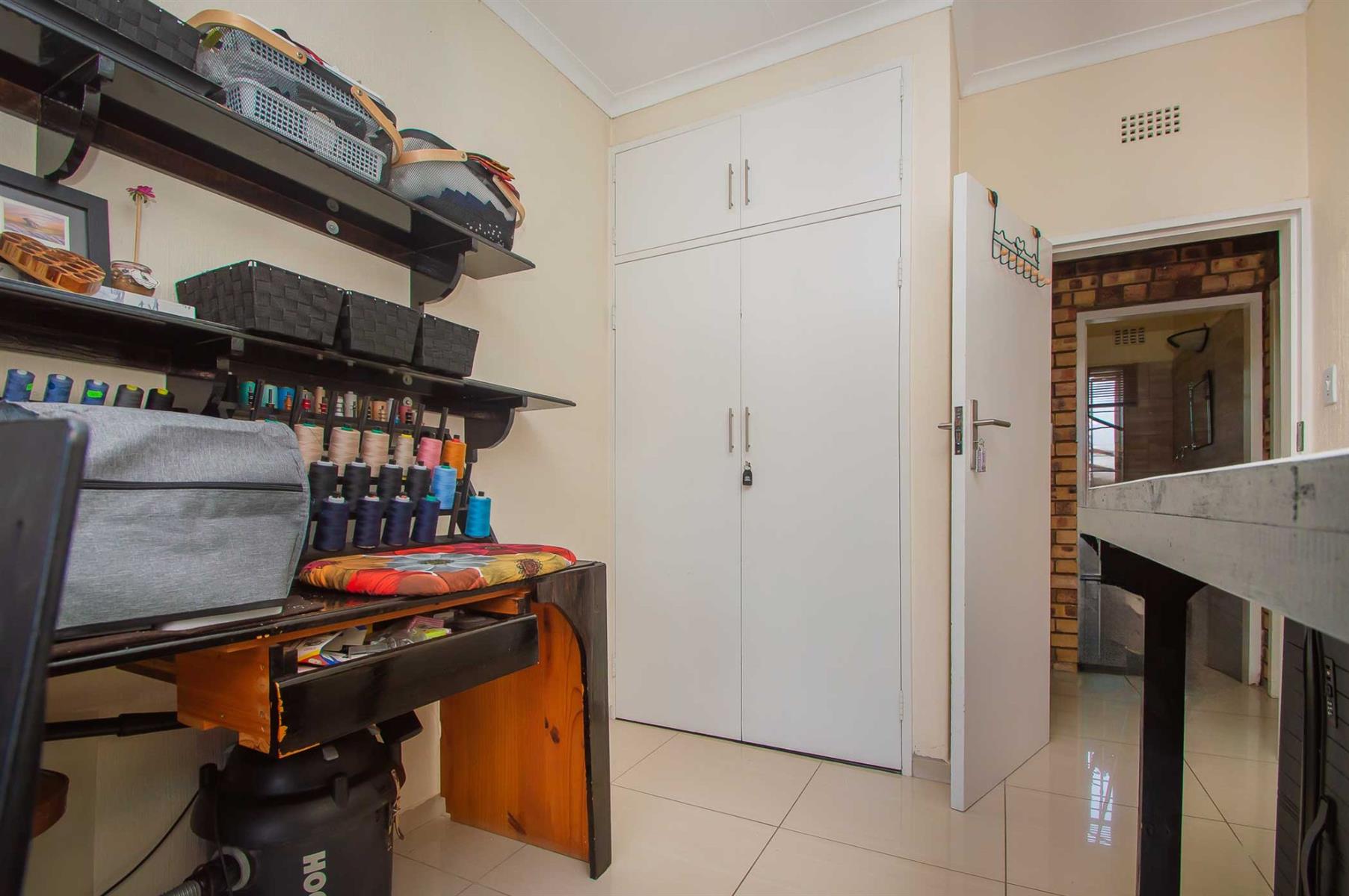 A generously sized and versatile family room opens onto a charming, covered patio with a built-in braai — an ideal setting for relaxed gatherings with family and friends. From here, enjoy views of the sparkling swimming pool and manicured, low-maintenance garden where children and pets can play freely and safely.