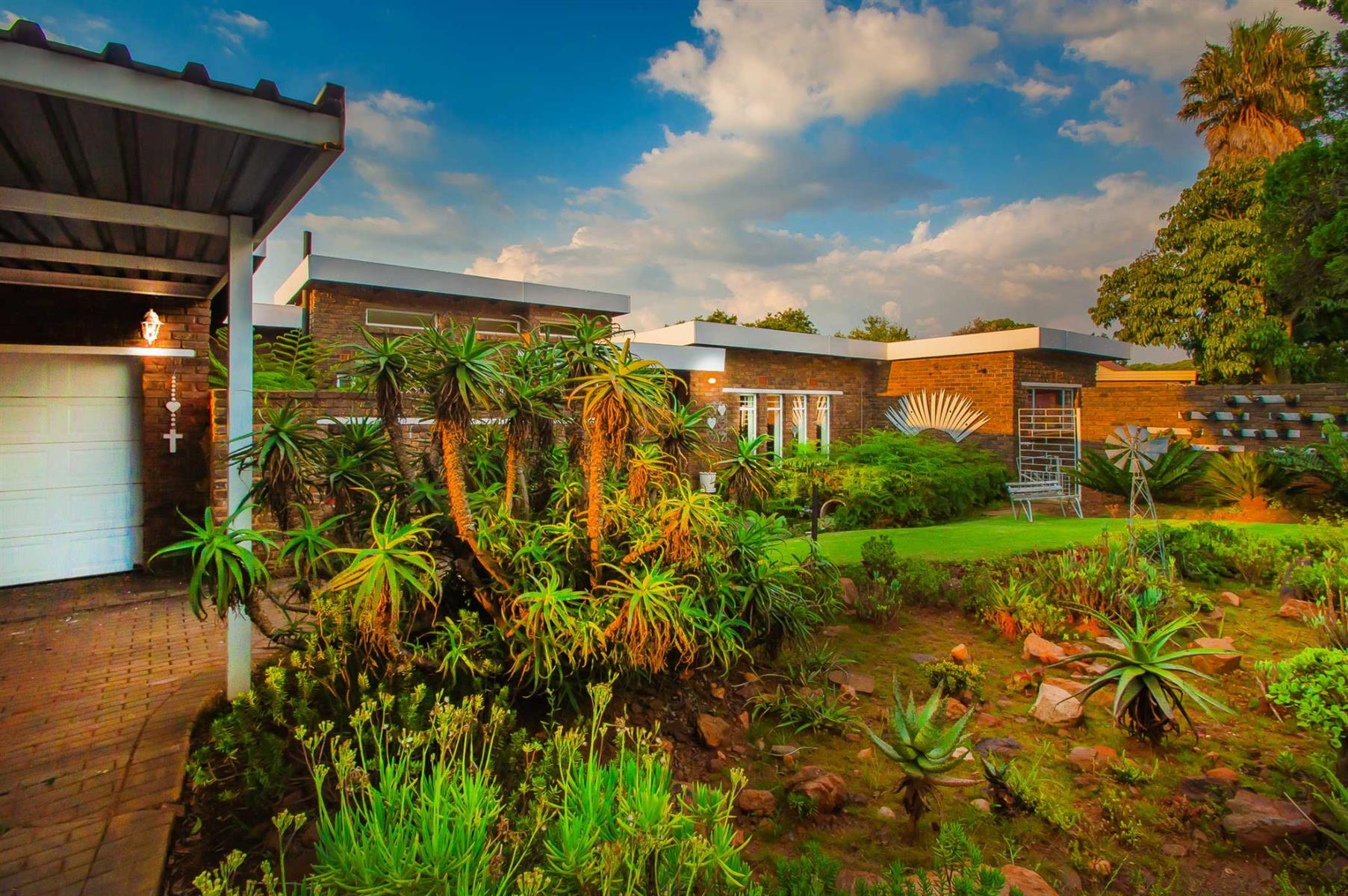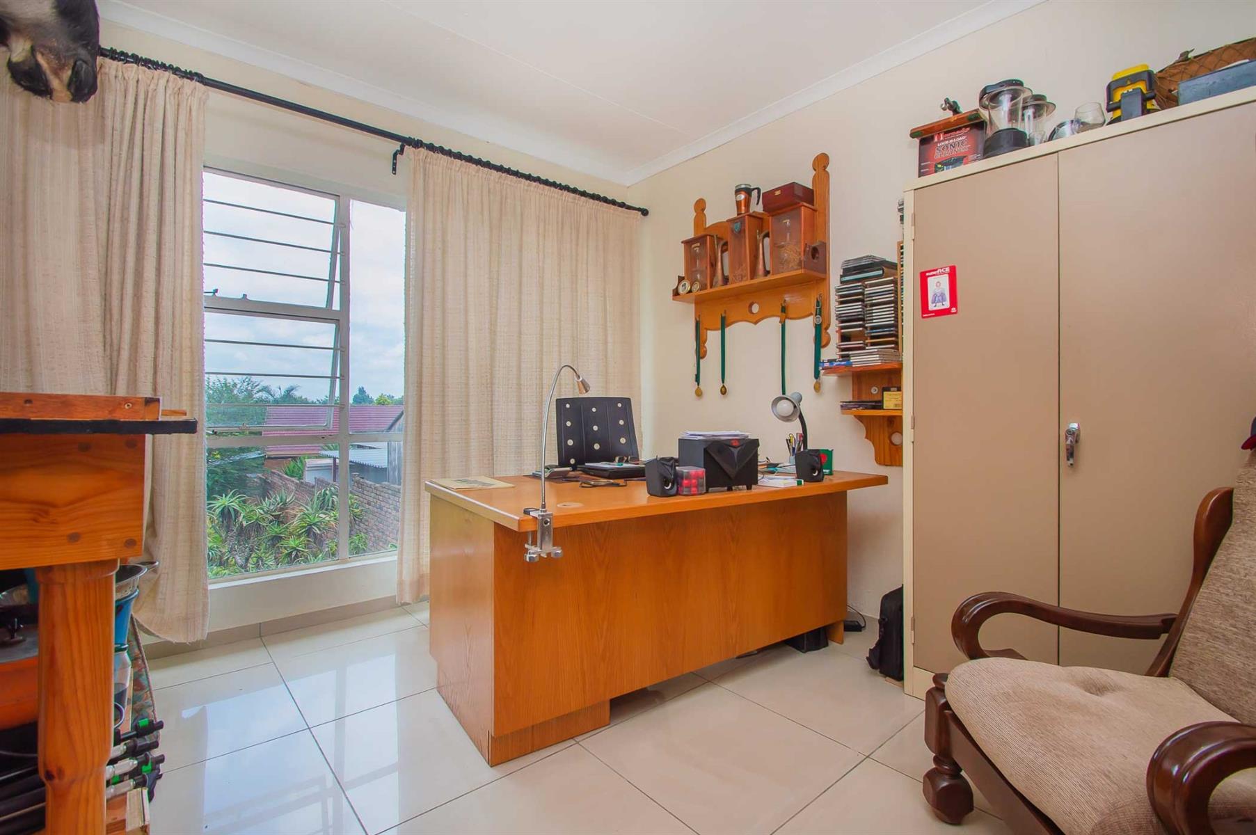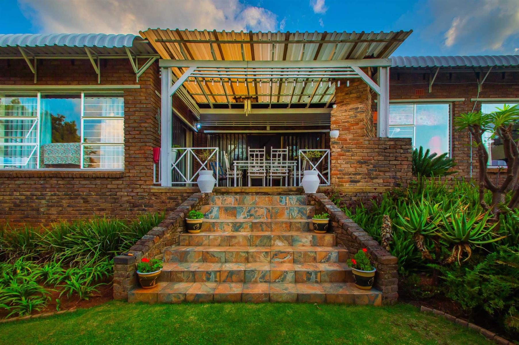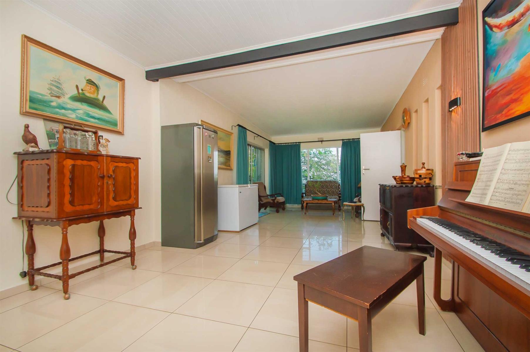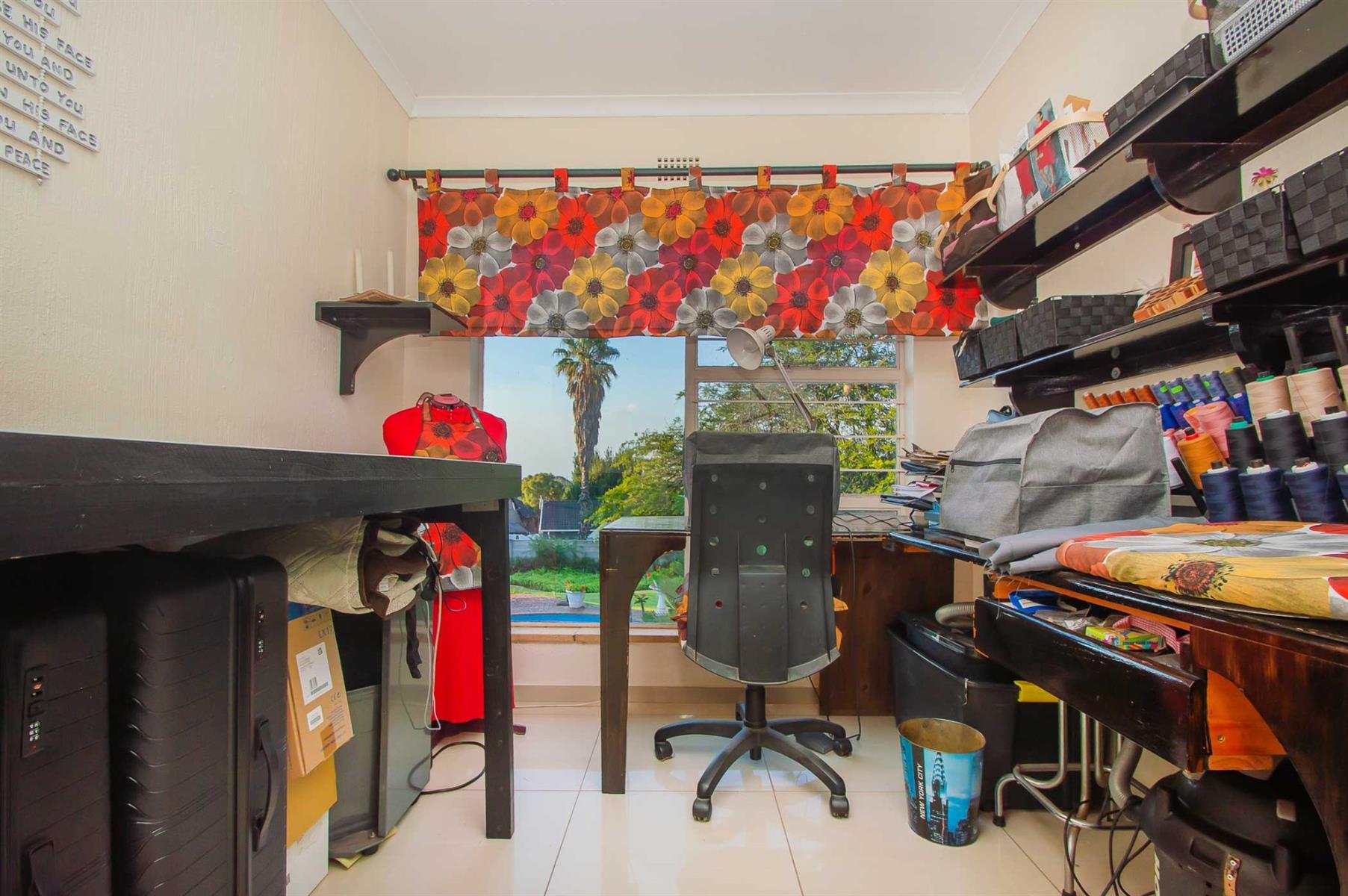 A generously sized and versatile family room opens onto a charming, covered patio with a built-in braai — an ideal setting for relaxed gatherings with family and friends. From here, enjoy views of the sparkling swimming pool and manicured, low-maintenance garden where children and pets can play freely and safely.