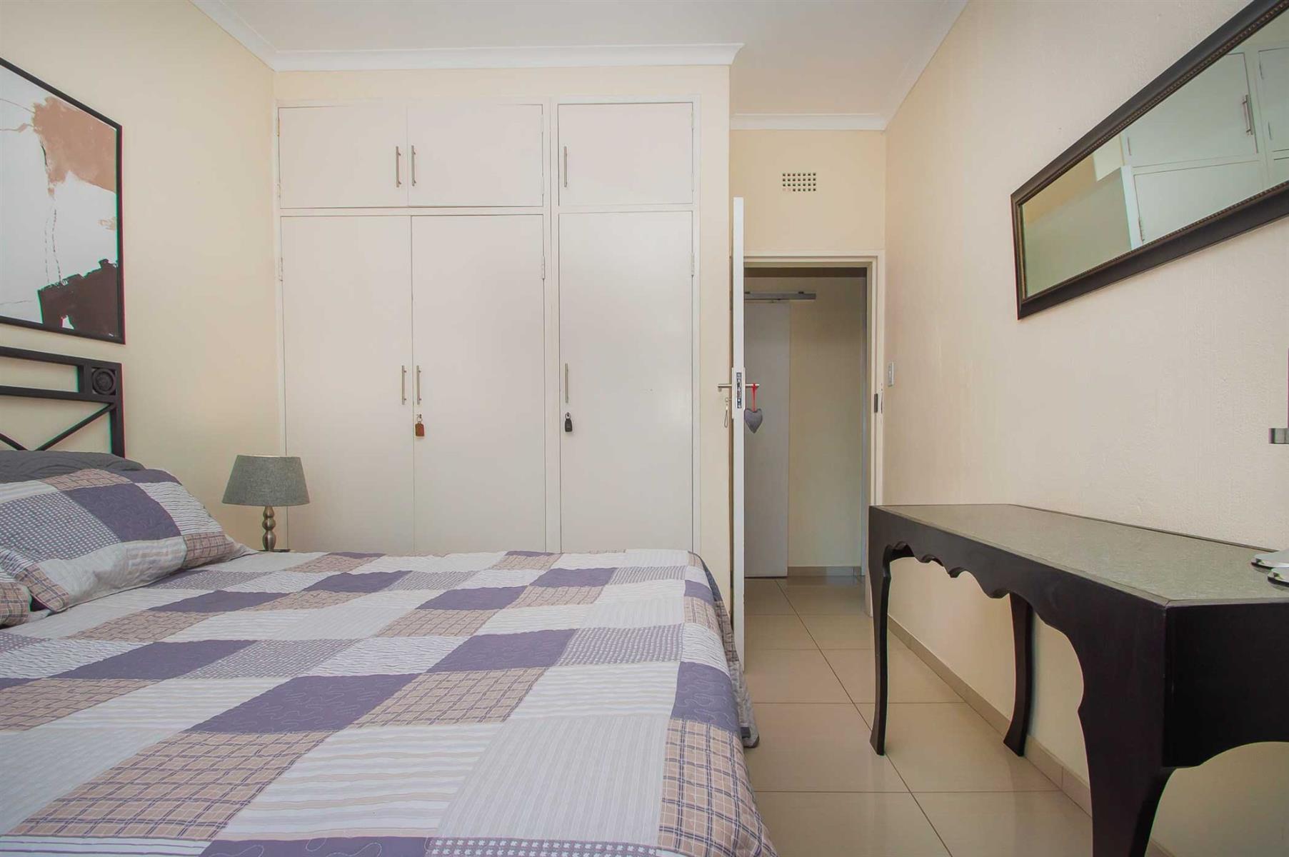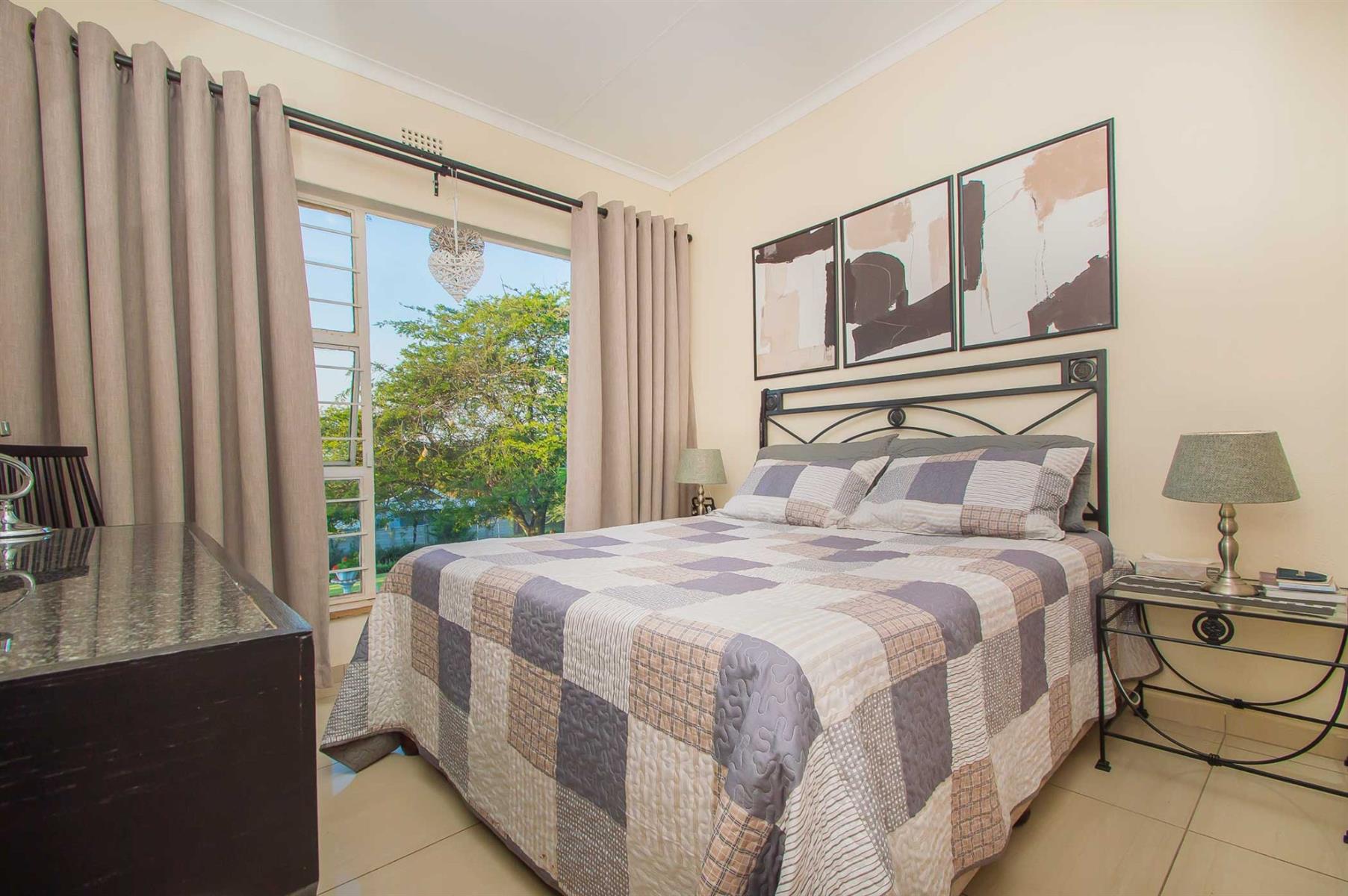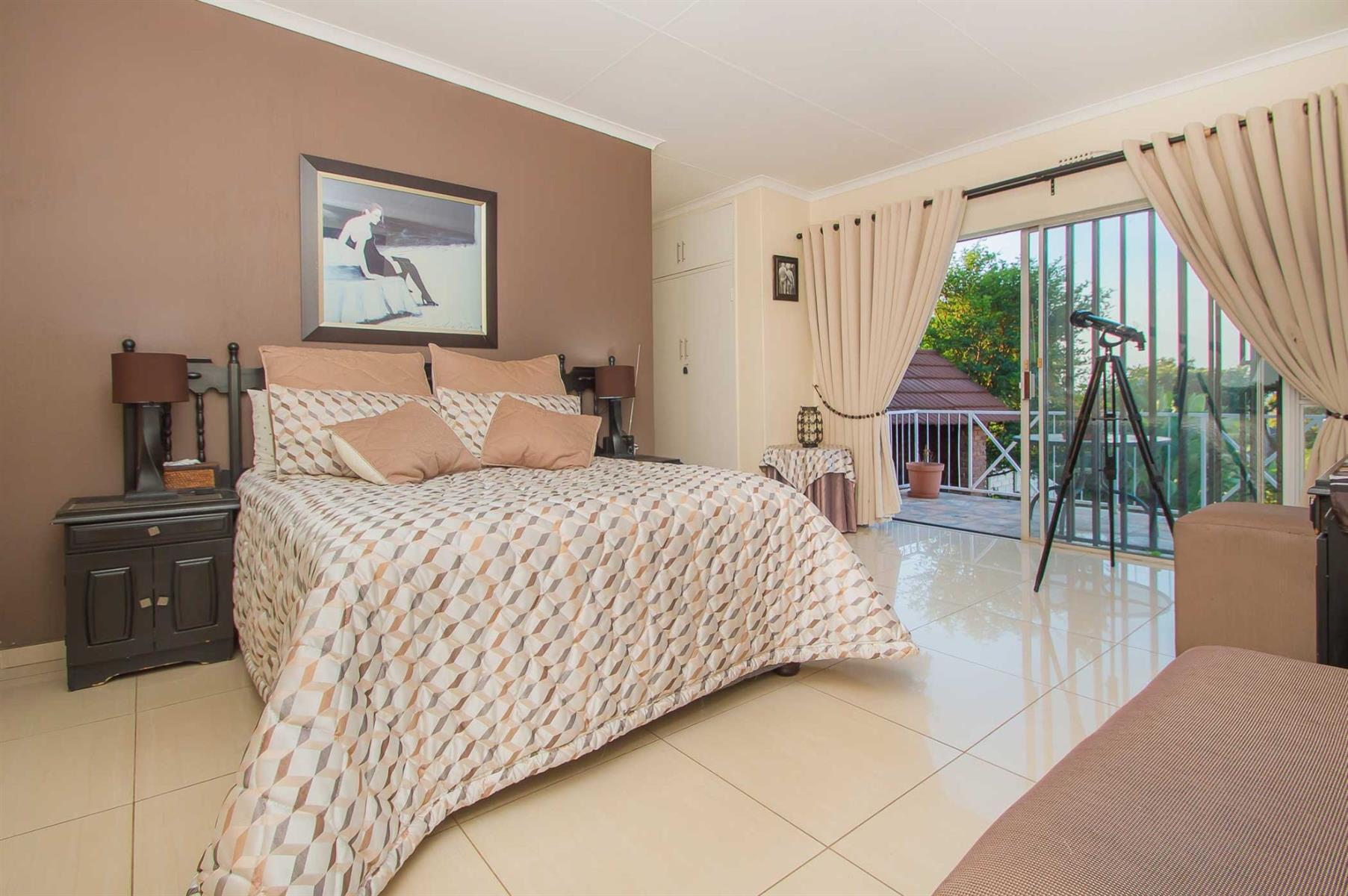 All bedrooms overlook the pool and garden, offering a wonderful sense of openness while maintaining privacy and security. The main bedroom is a true retreat, featuring a full en-suite bathroom, ample cupboard space, and sliding doors opening onto a private patio — perfect for enjoying a quiet morning coffee or unwinding with a cocktail after a long day.