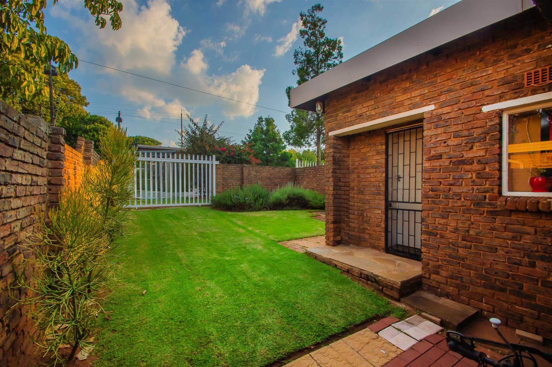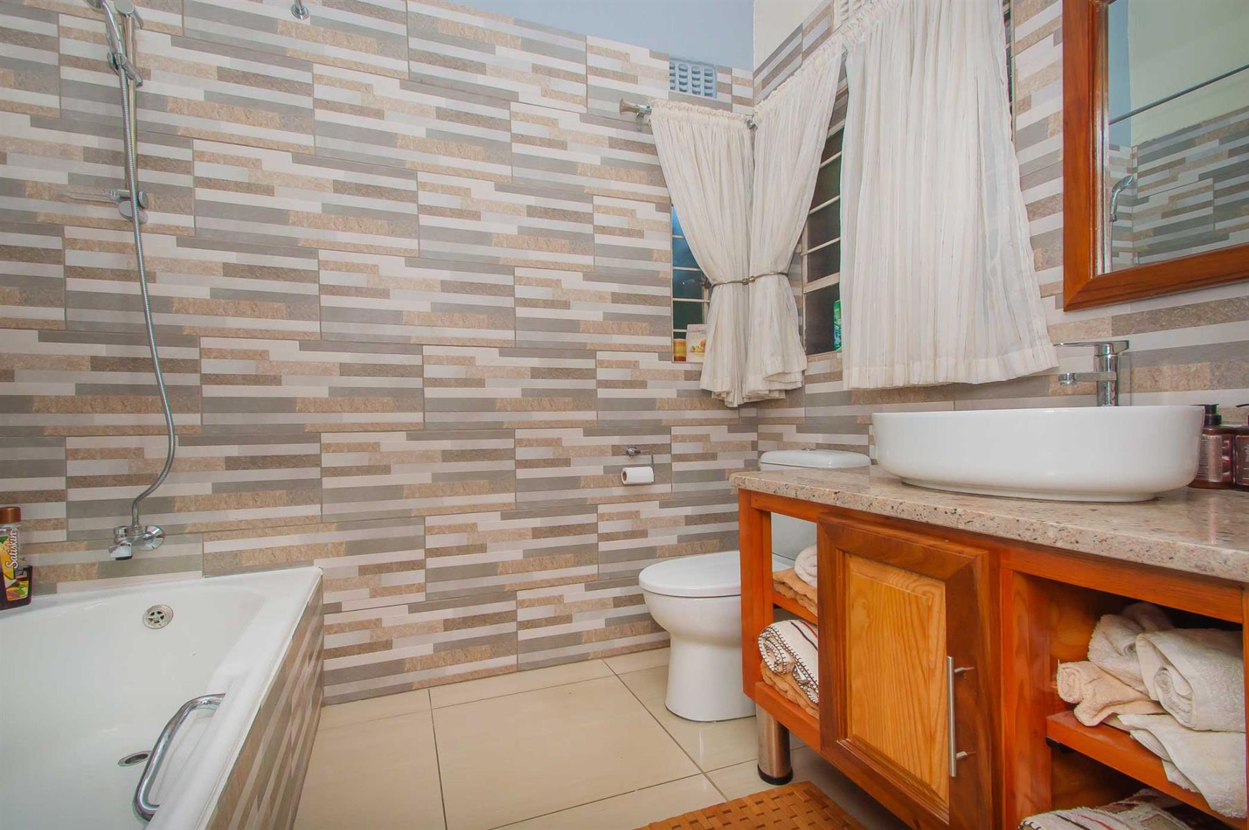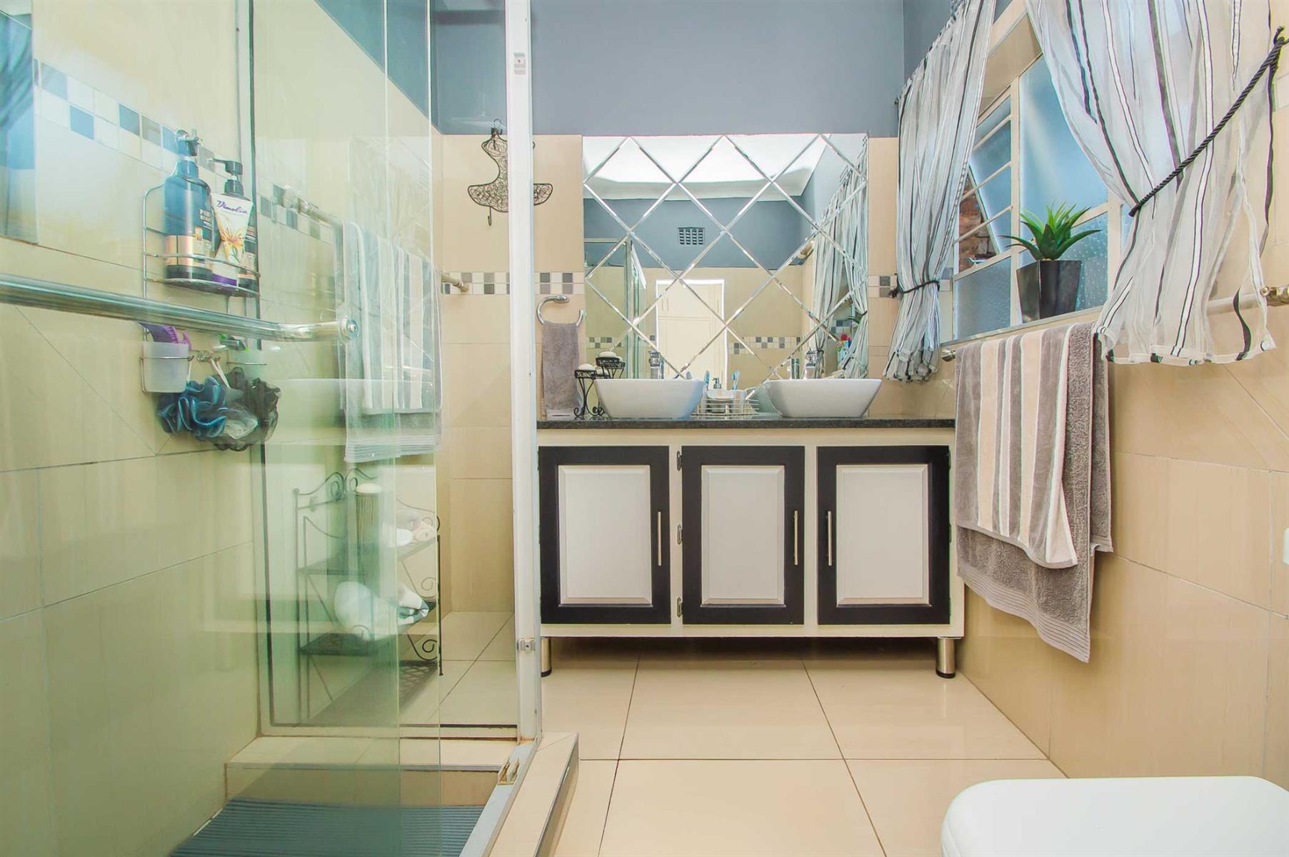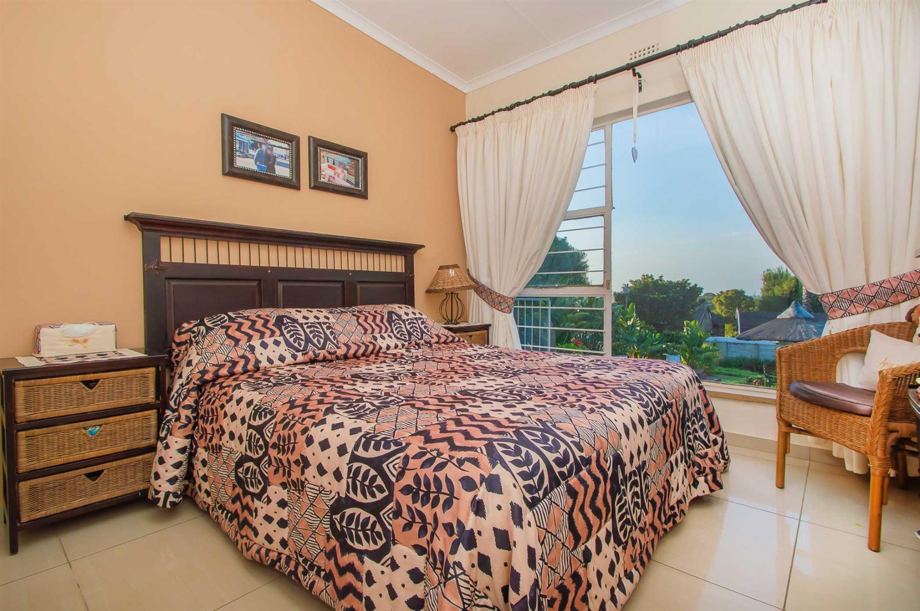 All bedrooms overlook the pool and garden, offering a wonderful sense of openness while maintaining privacy and security. The main bedroom is a true retreat, featuring a full en-suite bathroom, ample cupboard space, and sliding doors opening onto a private patio — perfect for enjoying a quiet morning coffee or unwinding with a cocktail after a long day.