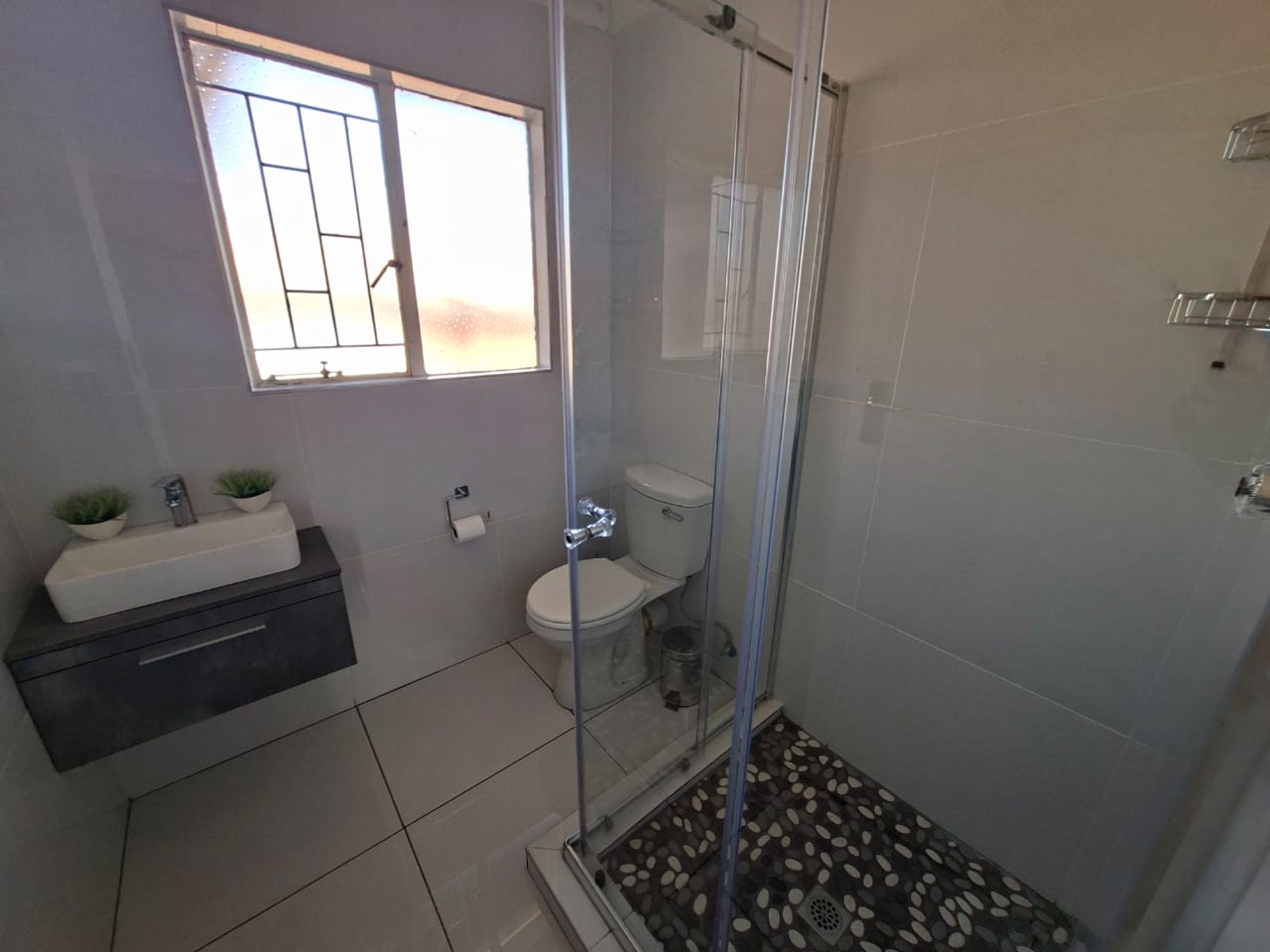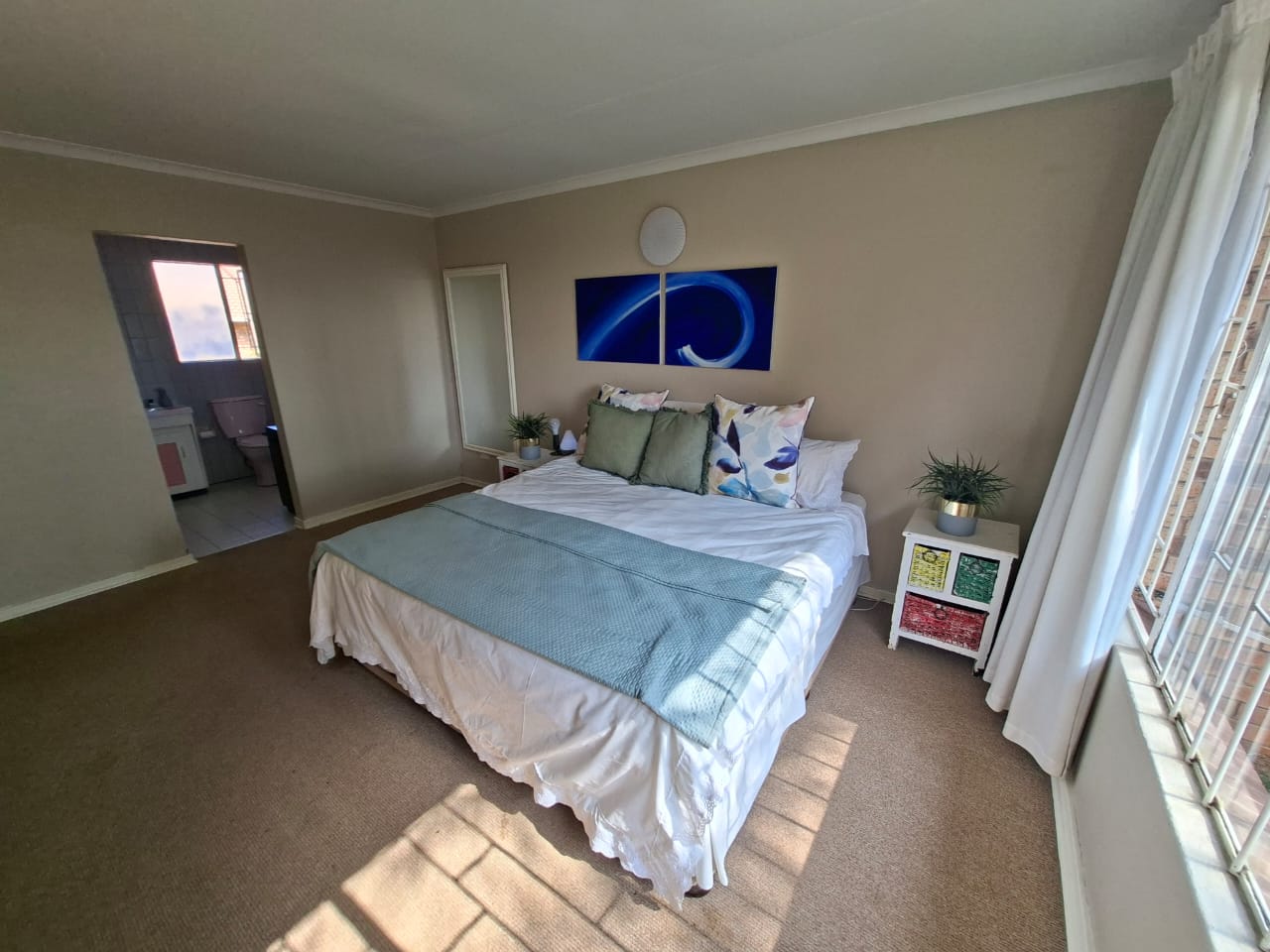 The home offers three sunny, well-sized bedrooms. Two bedrooms share a neat and modern bathroom with a shower, while the main bedroom boasts its own en-suite bathroom for added privacy and convenience.