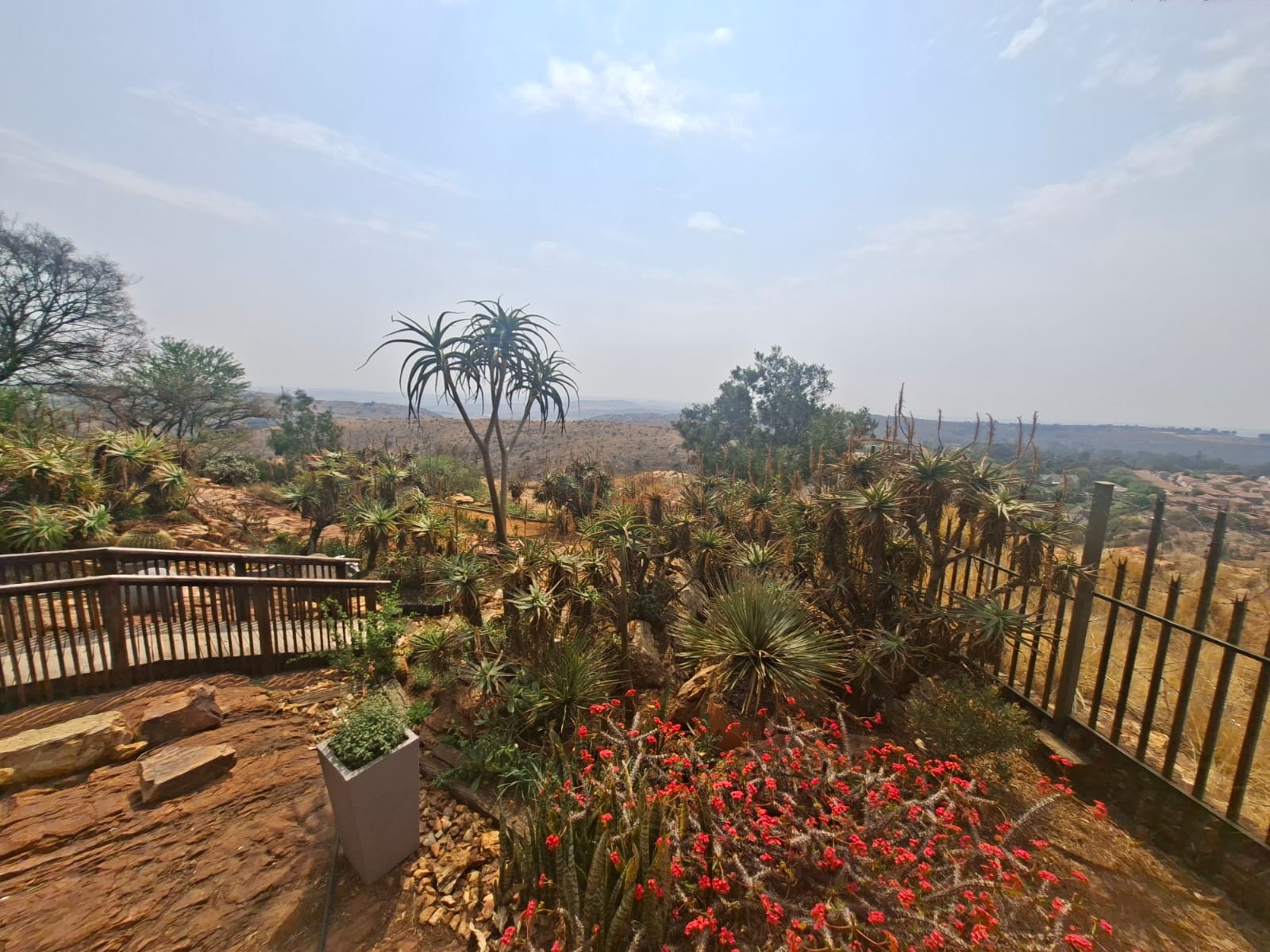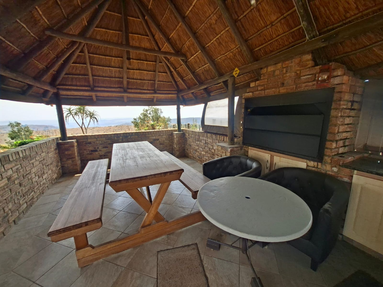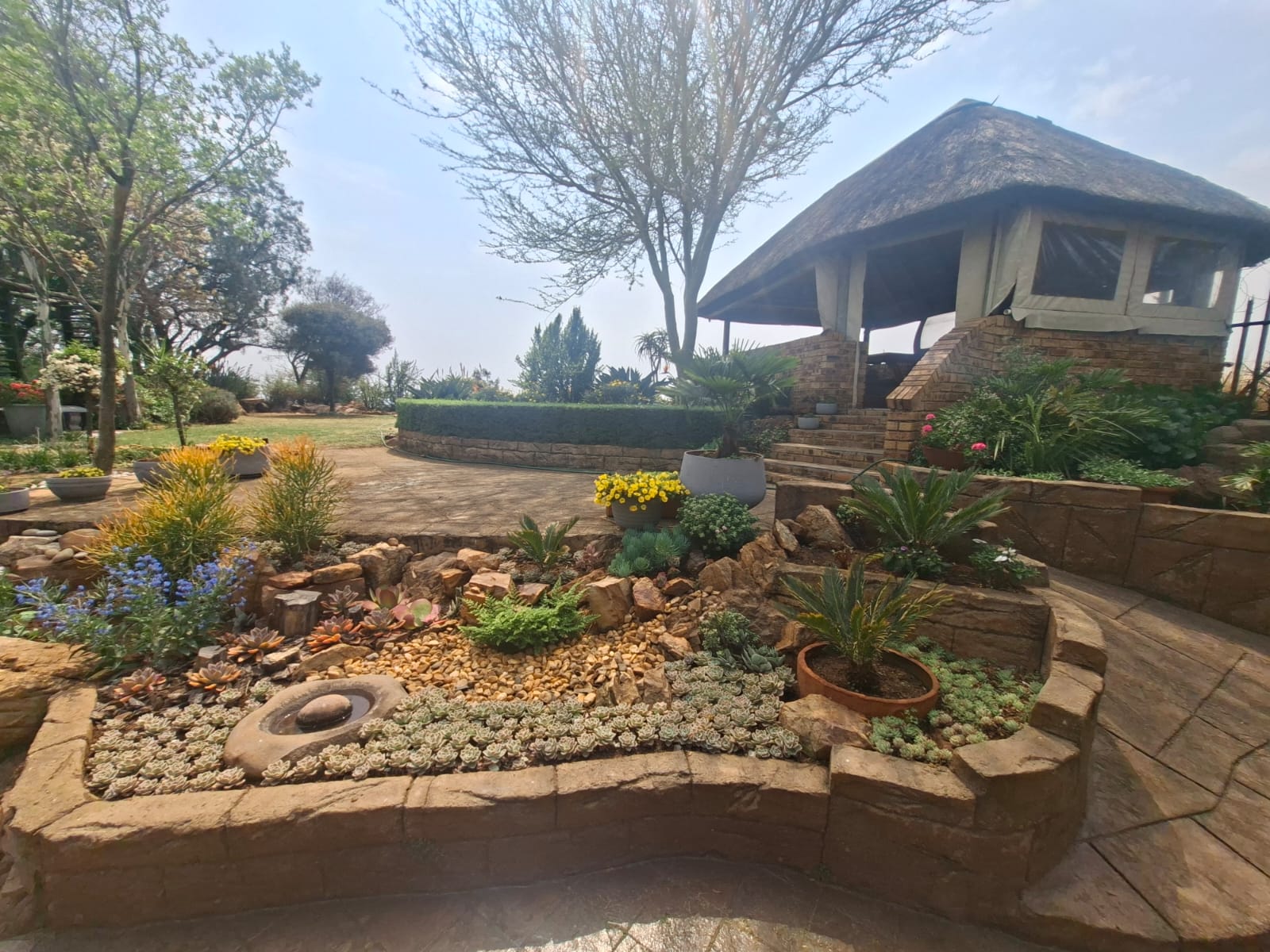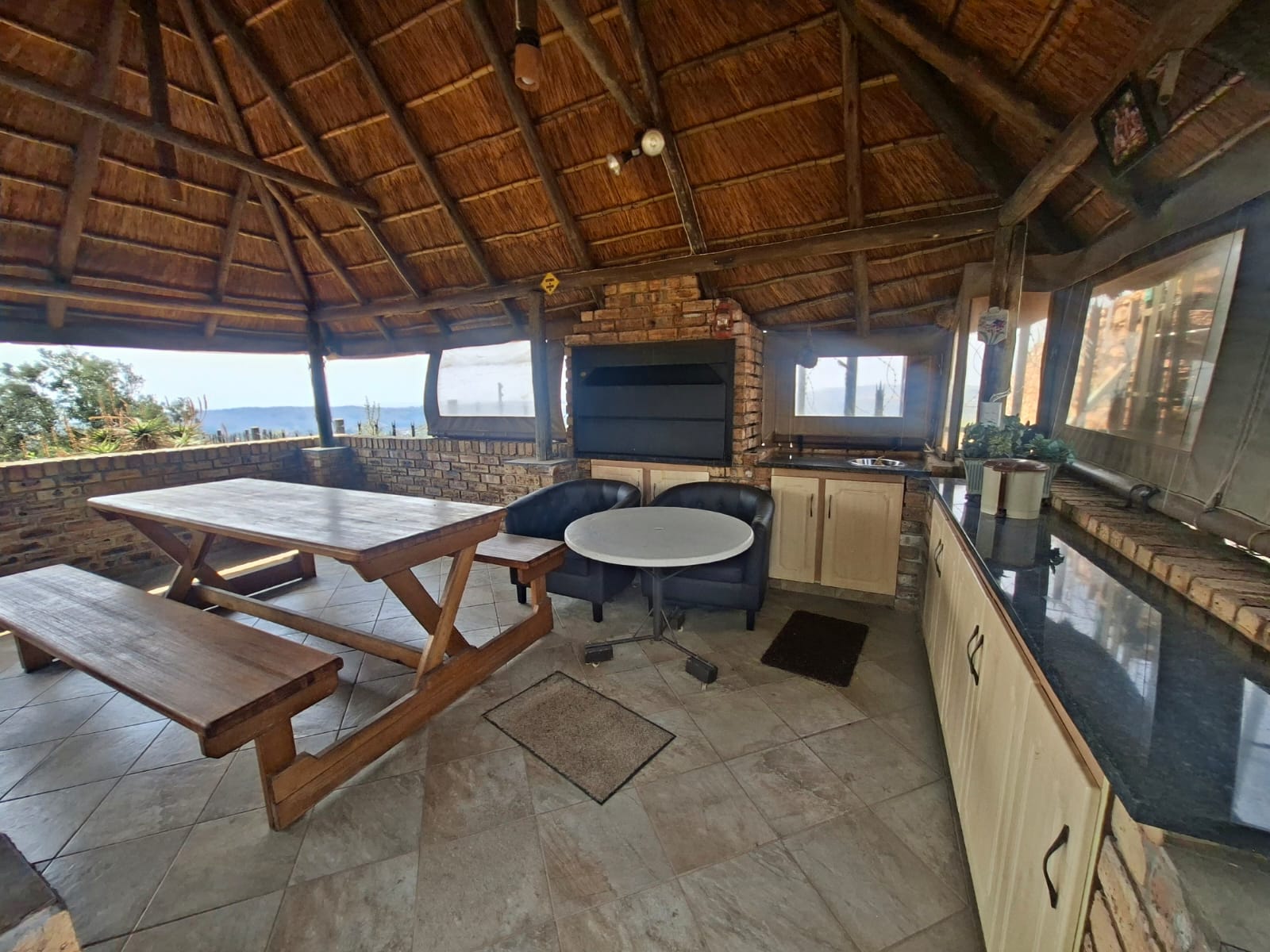 The property further includes a dedicated laundry area, storeroom, and staff quarters for added convenience. Entertaining is a delight, with sliding doors from the dining room opening onto a covered patio, while the lounge leads out to an expansive, landscaped garden. A thatched lapa with a built-in braai crowns this outdoor space, offering magnificent views.