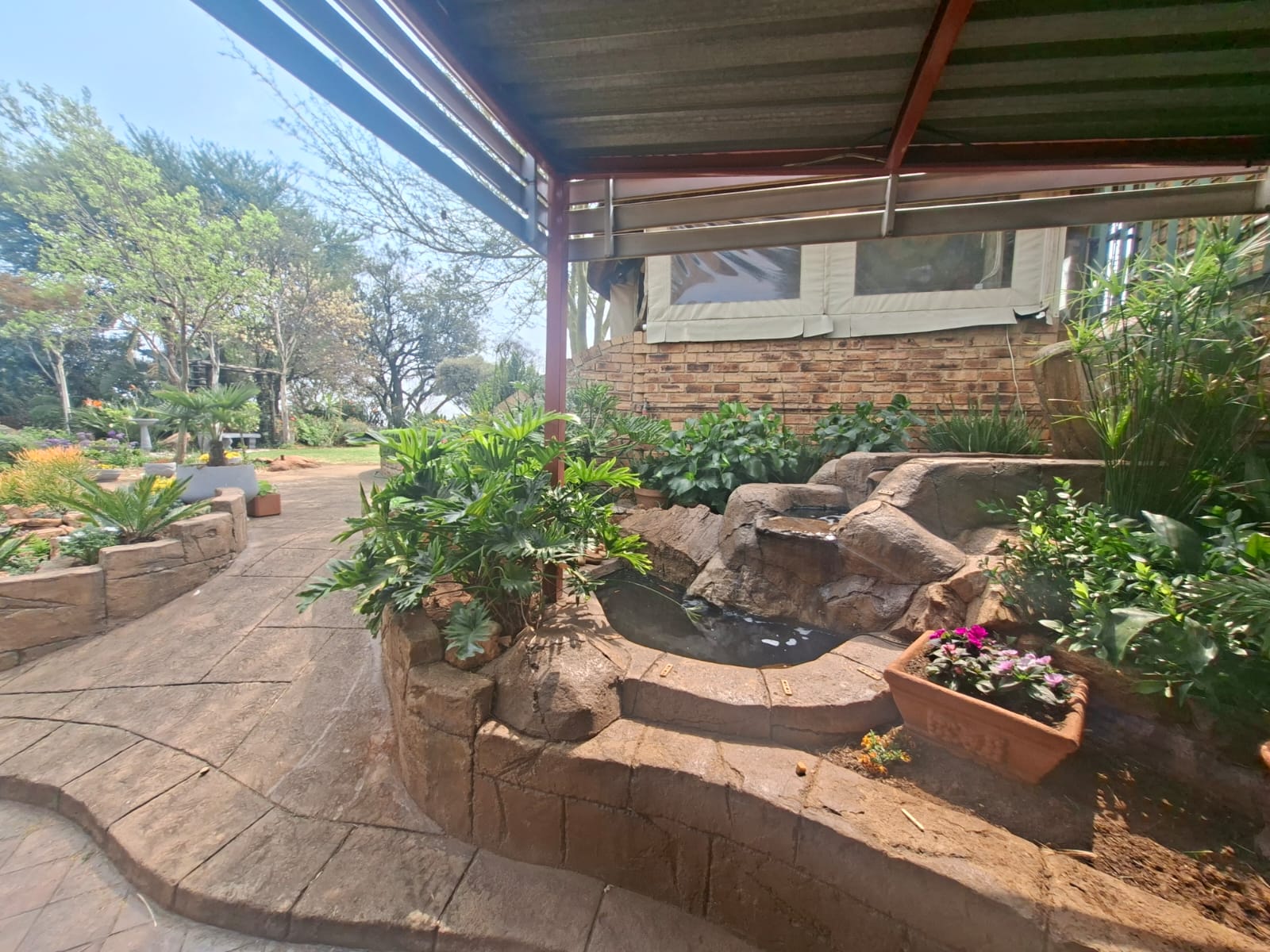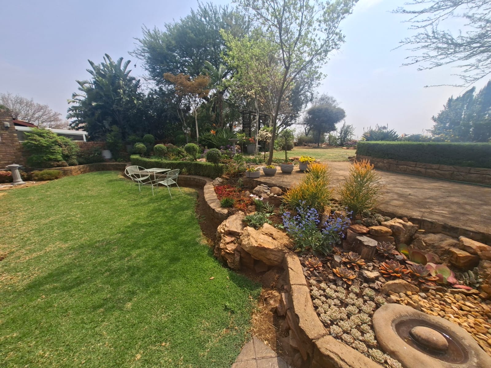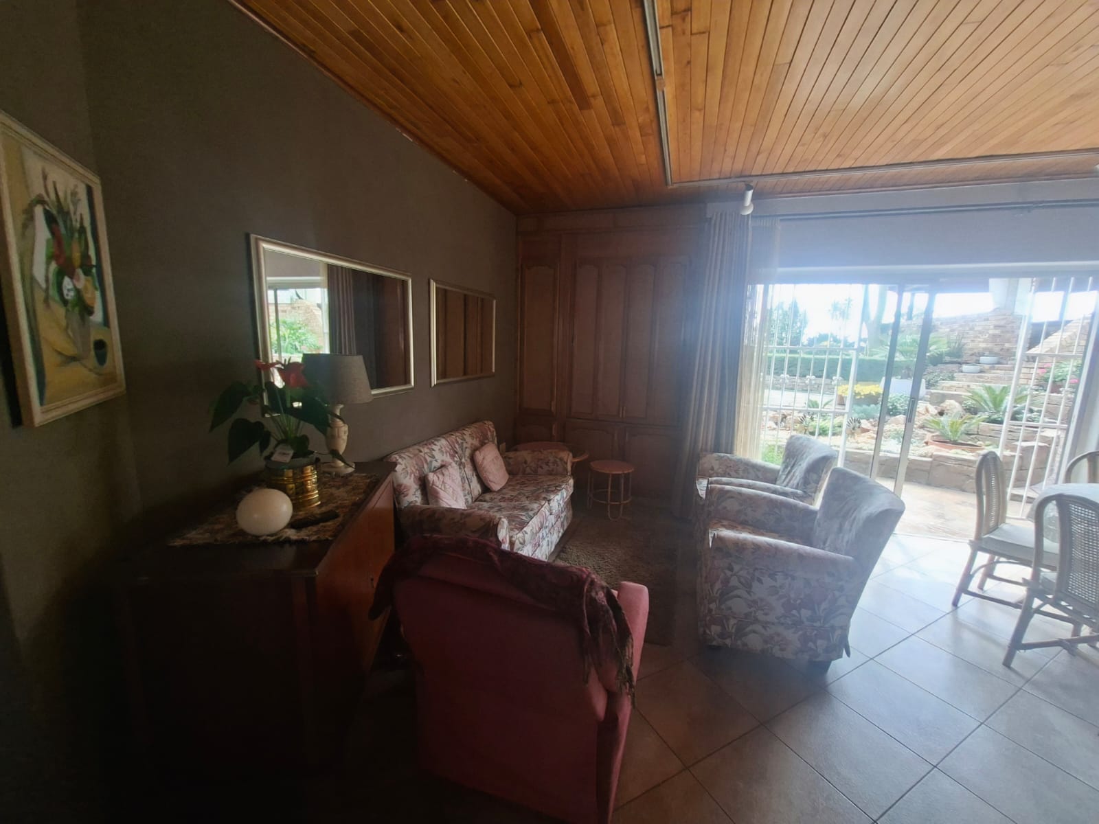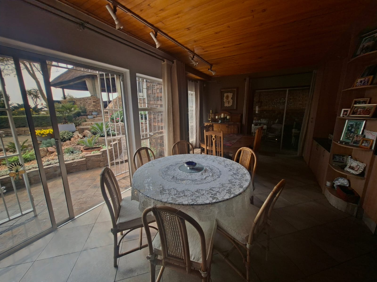 The property further includes a dedicated laundry area, storeroom, and staff quarters for added convenience. Entertaining is a delight, with sliding doors from the dining room opening onto a covered patio, while the lounge leads out to an expansive, landscaped garden. A thatched lapa with a built-in braai crowns this outdoor space, offering magnificent views.
