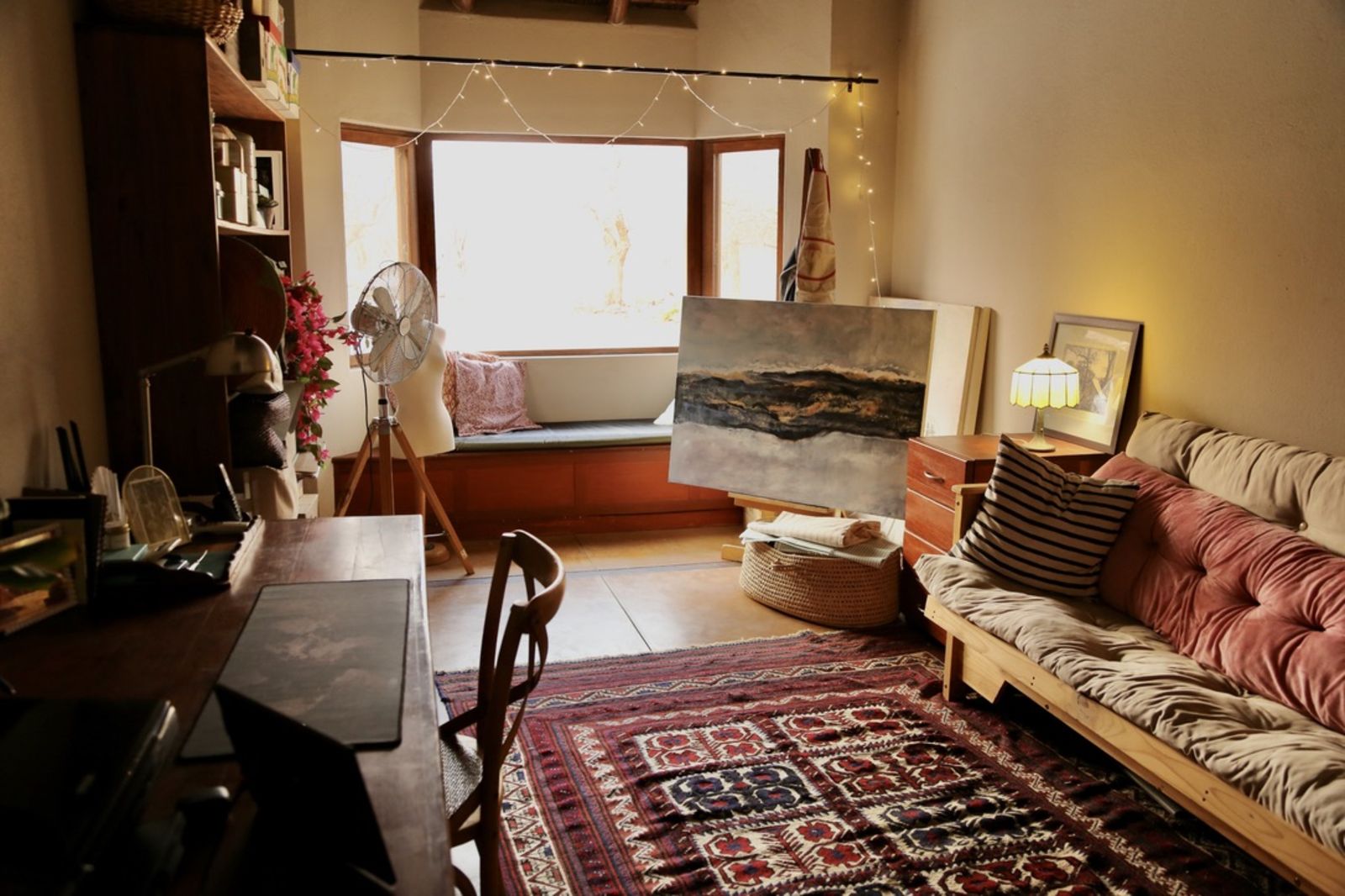 A dedicated studio with a charming bay window invites creativity, natural light, and peaceful views.