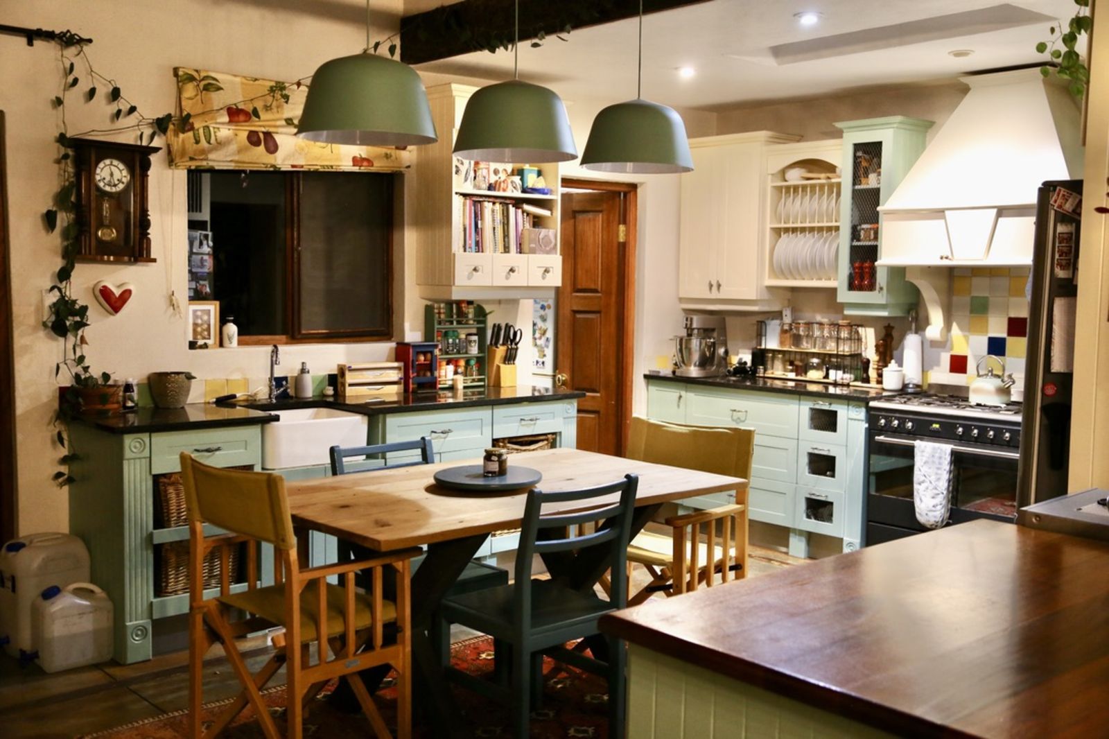 The kitchen, dining room, and lounge flow seamlessly together, anchored by a central fireplace that warms the heart of the home.