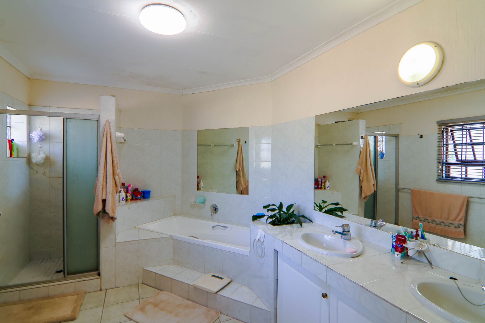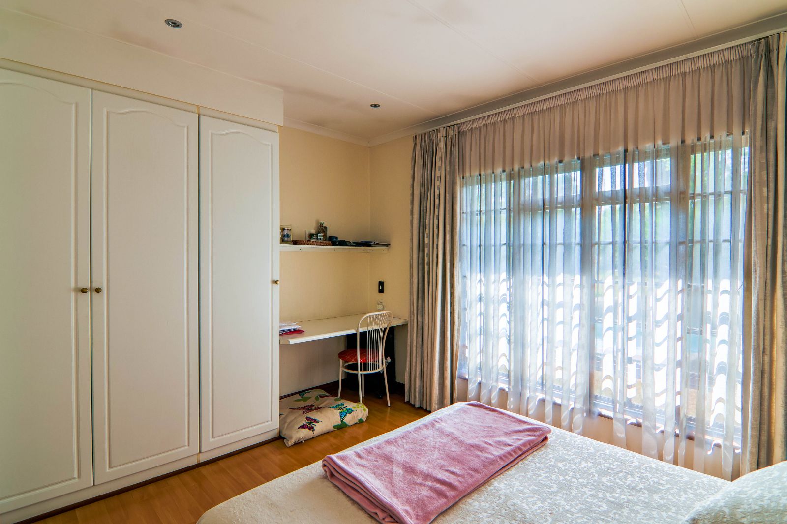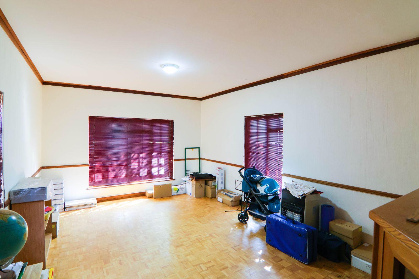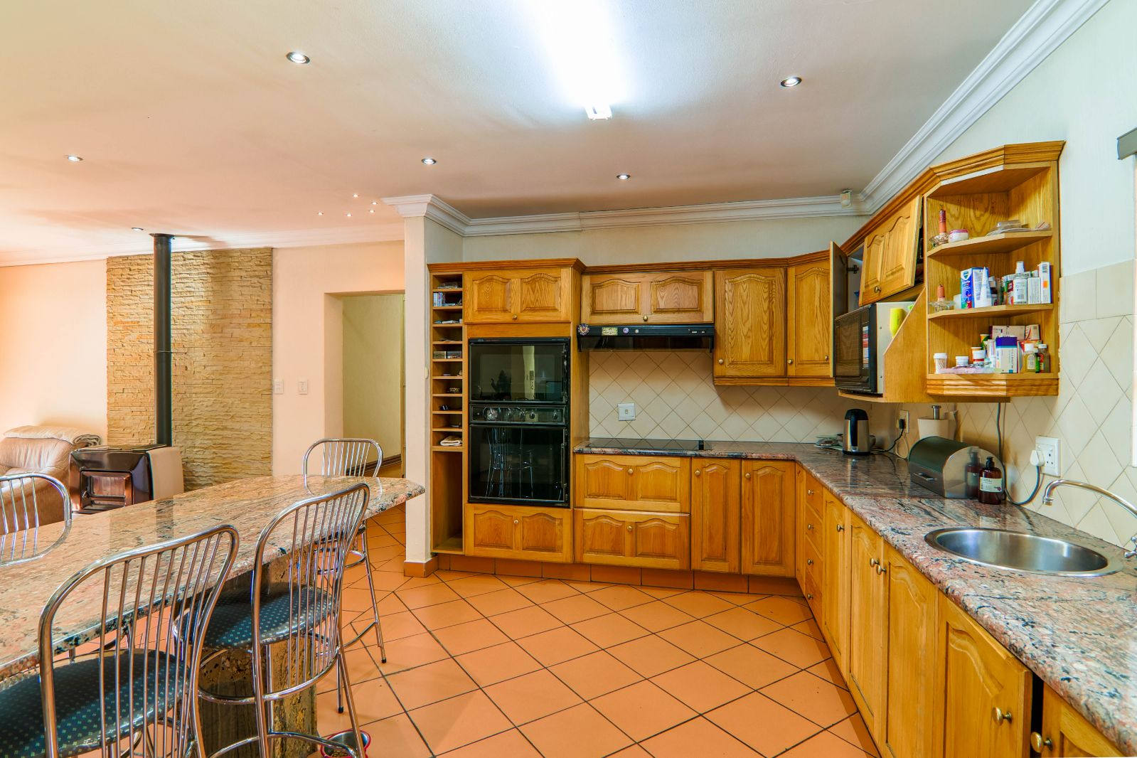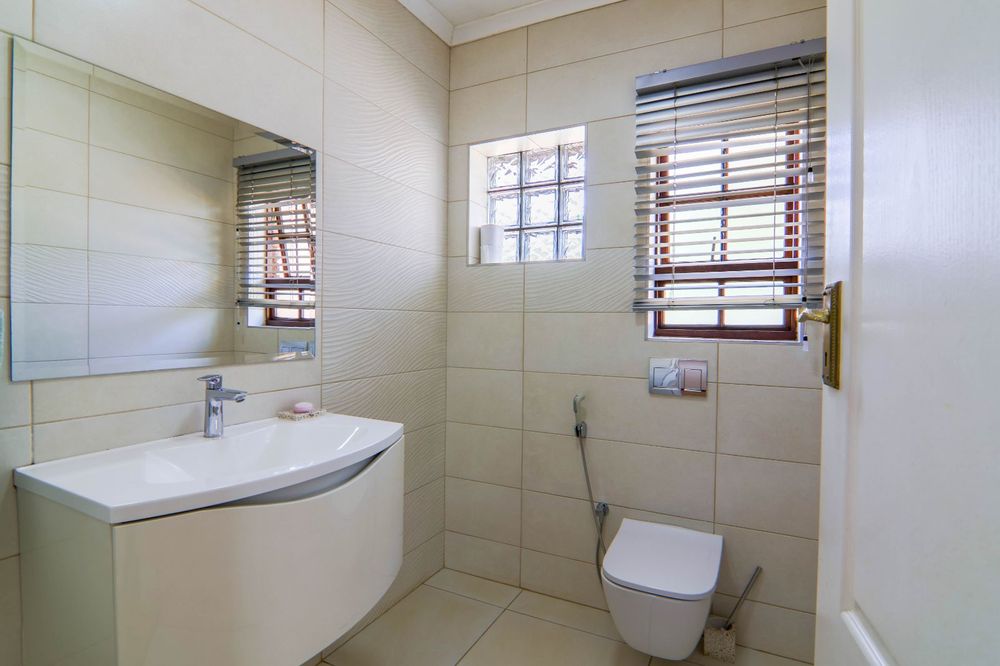The open-plan kitchen is positioned next to the family room and leads directly to a beautiful braai area, an entertainer’s dream. The kitchen is well-equipped with both an electric and gas stove, oven, and prep bowl. A separate scullery provides ample space for all your appliances and includes a laundry basin. Adjacent to the kitchen is a versatile storeroom that can be used for multiple purposes.