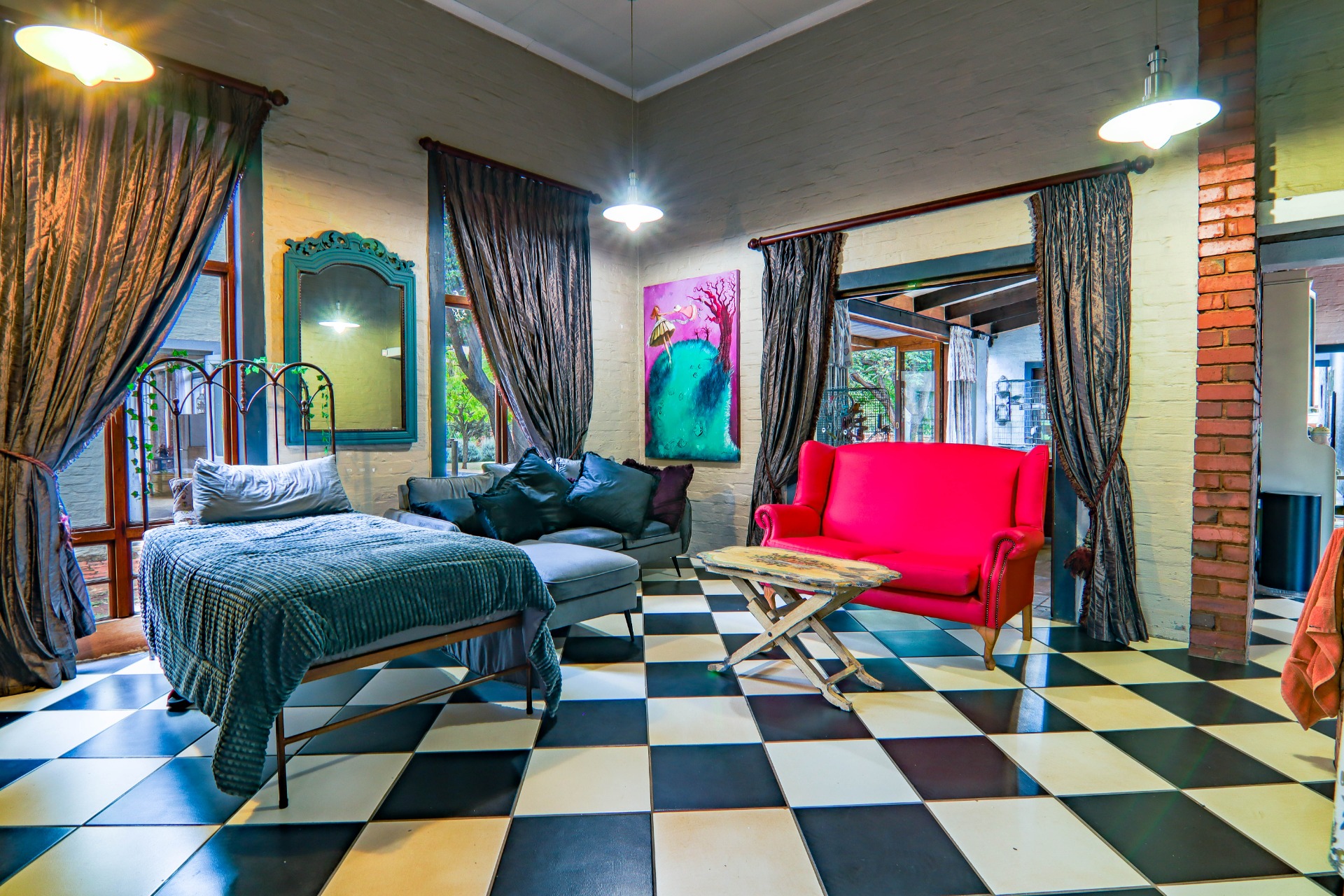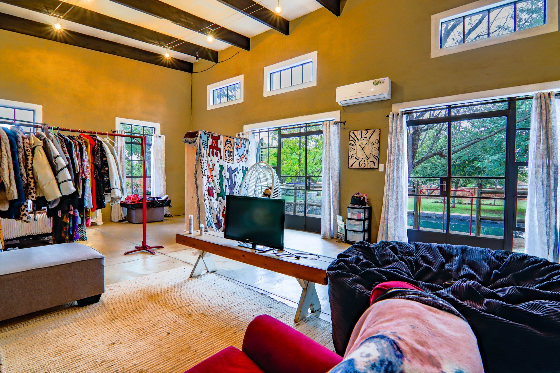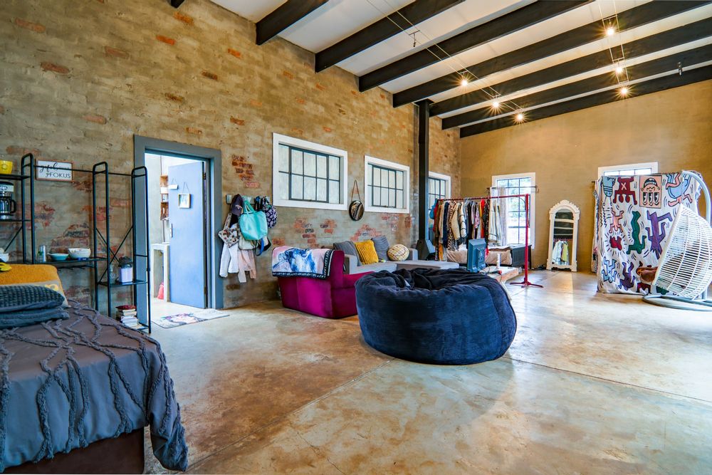 This property also boasts a modern, industrial-style studio with a bathroom, kitchenette, and doors leading to the pool area—a perfect space for guests or as a rental opportunity.