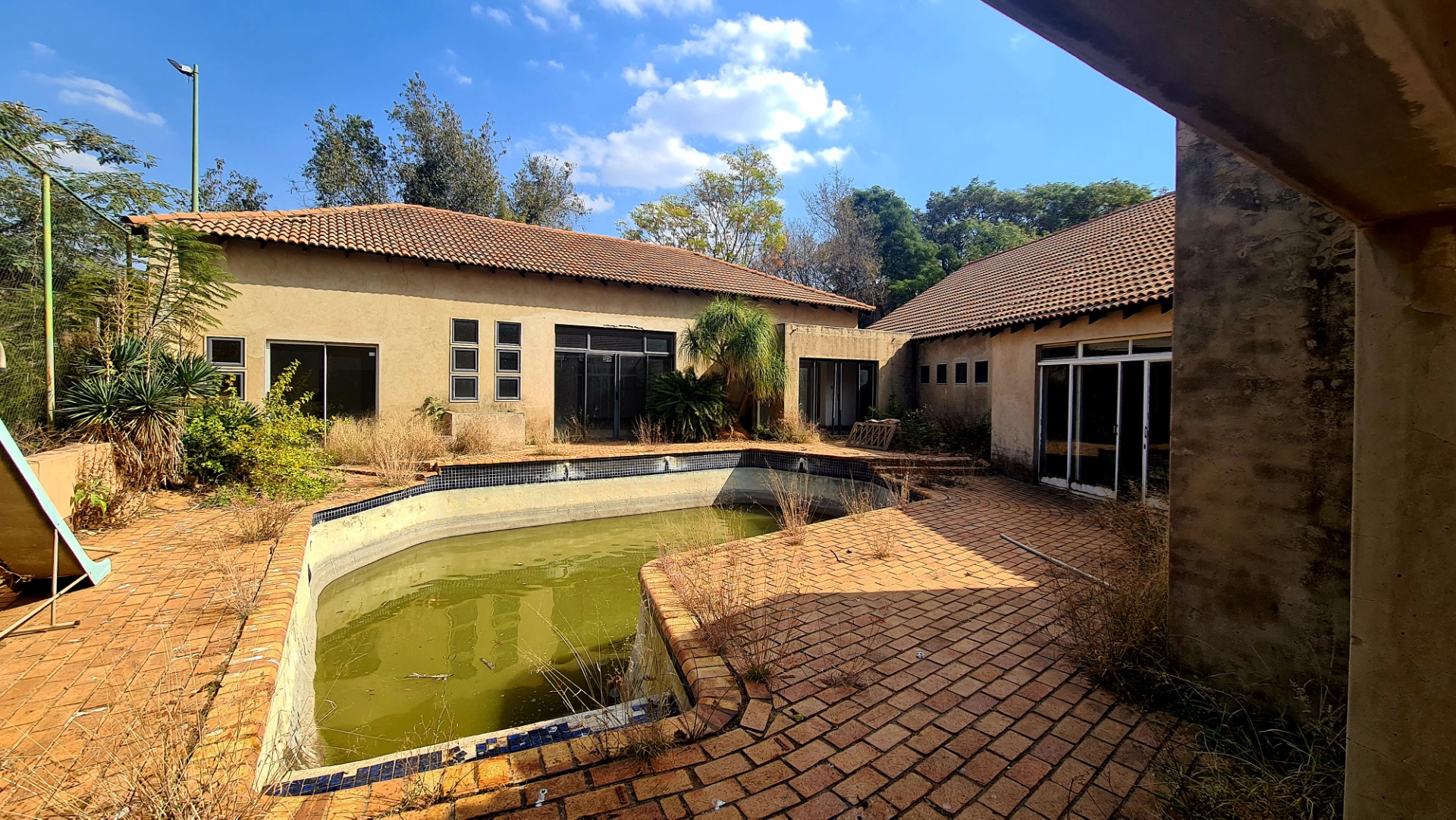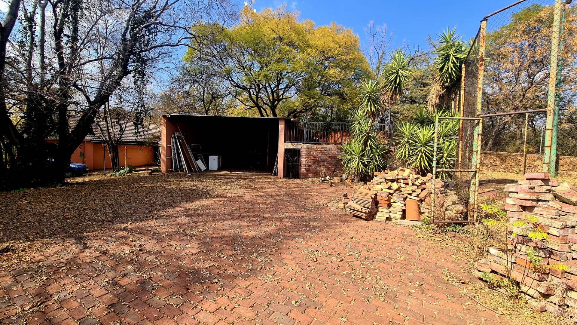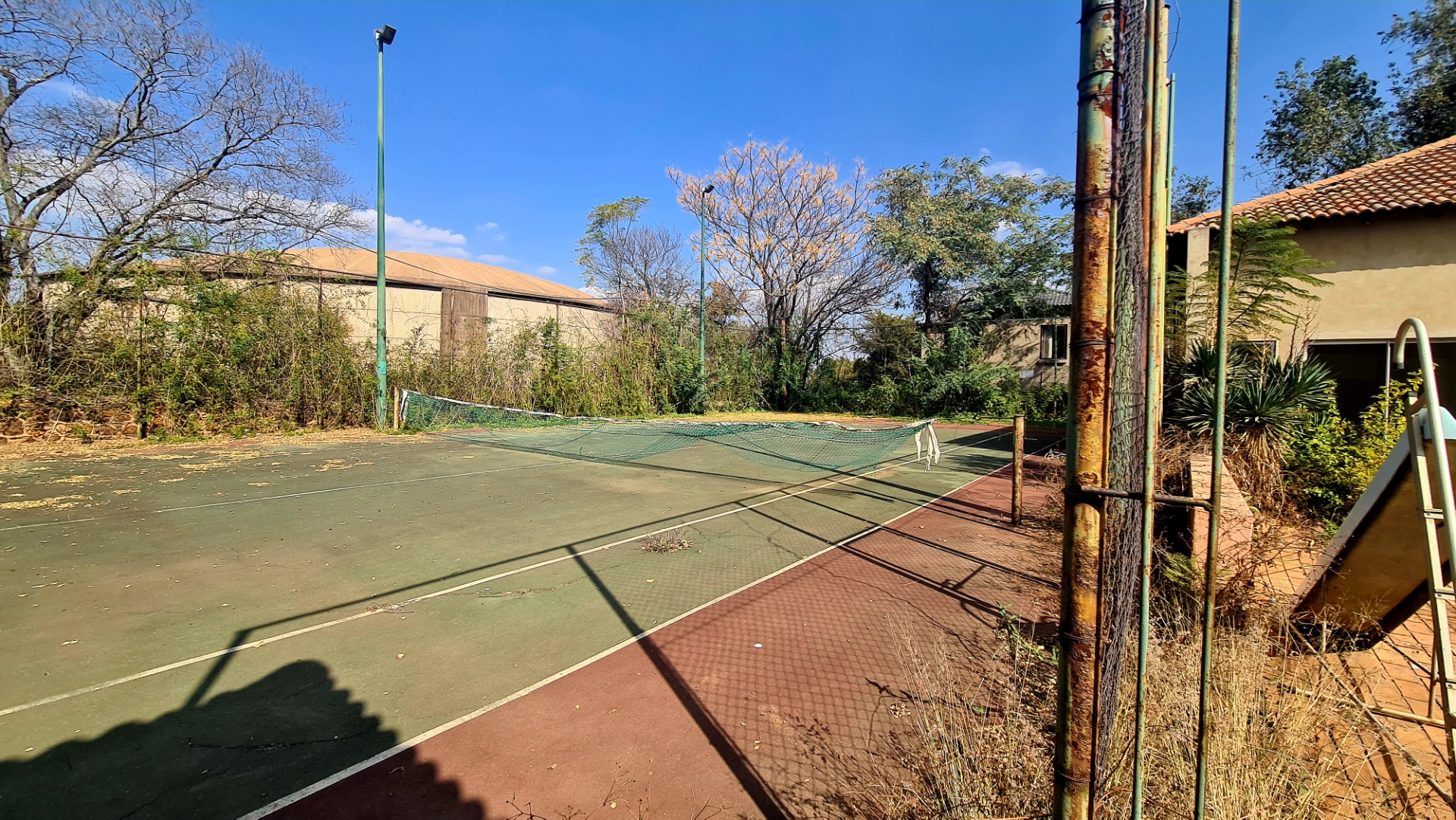 Big large stand with a tennis court and outbuildings.