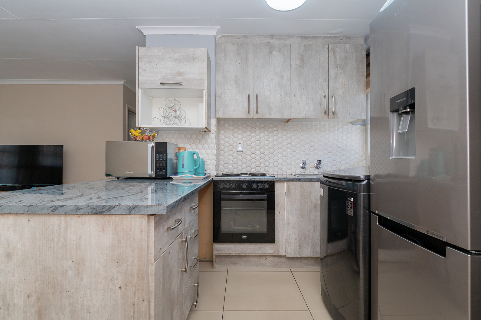 - Modern kitchen with elegant countertops and ample cupboard space, four plate stove and under counter oven as well as enough space for your refrigerator and dishwasher or washing machine.