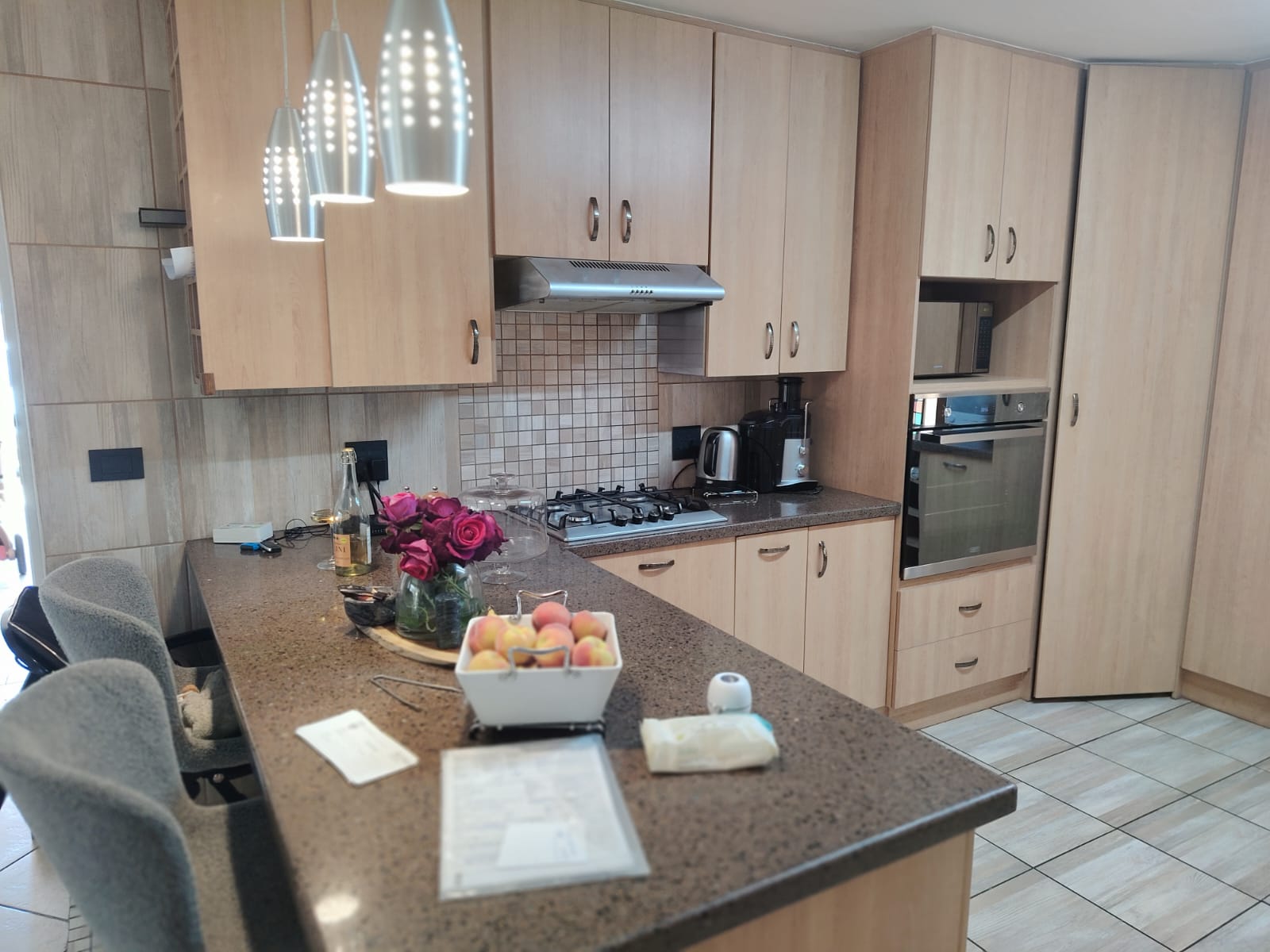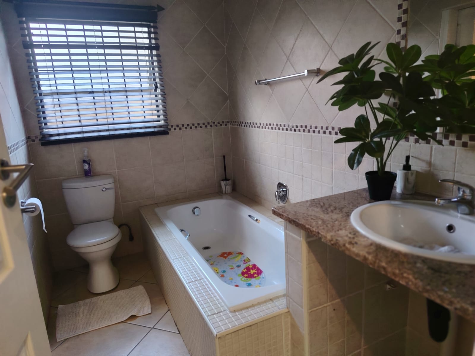 Main Bedroom: Spacious, tiled, with blinds, ample cupboards, and a modern en-suite bathroom featuring a shower, bath, and double basin.