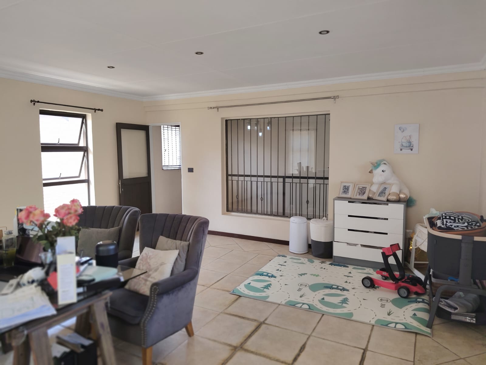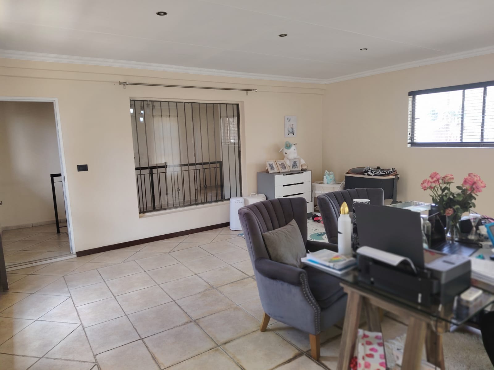 4th Bedroom/Flexible Space: A massive room with air conditioning, tiled floors, and endless possibilities – perfect as a study, pajama lounge, gym, or additional bedroom.
