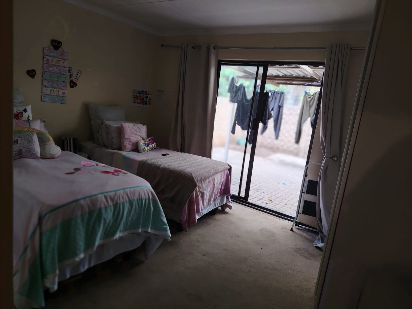 2 Bedrooms: Both carpeted with built-in cupboards. One fits a double bed; the second is generously sized with an en-suite bathroom (shower).