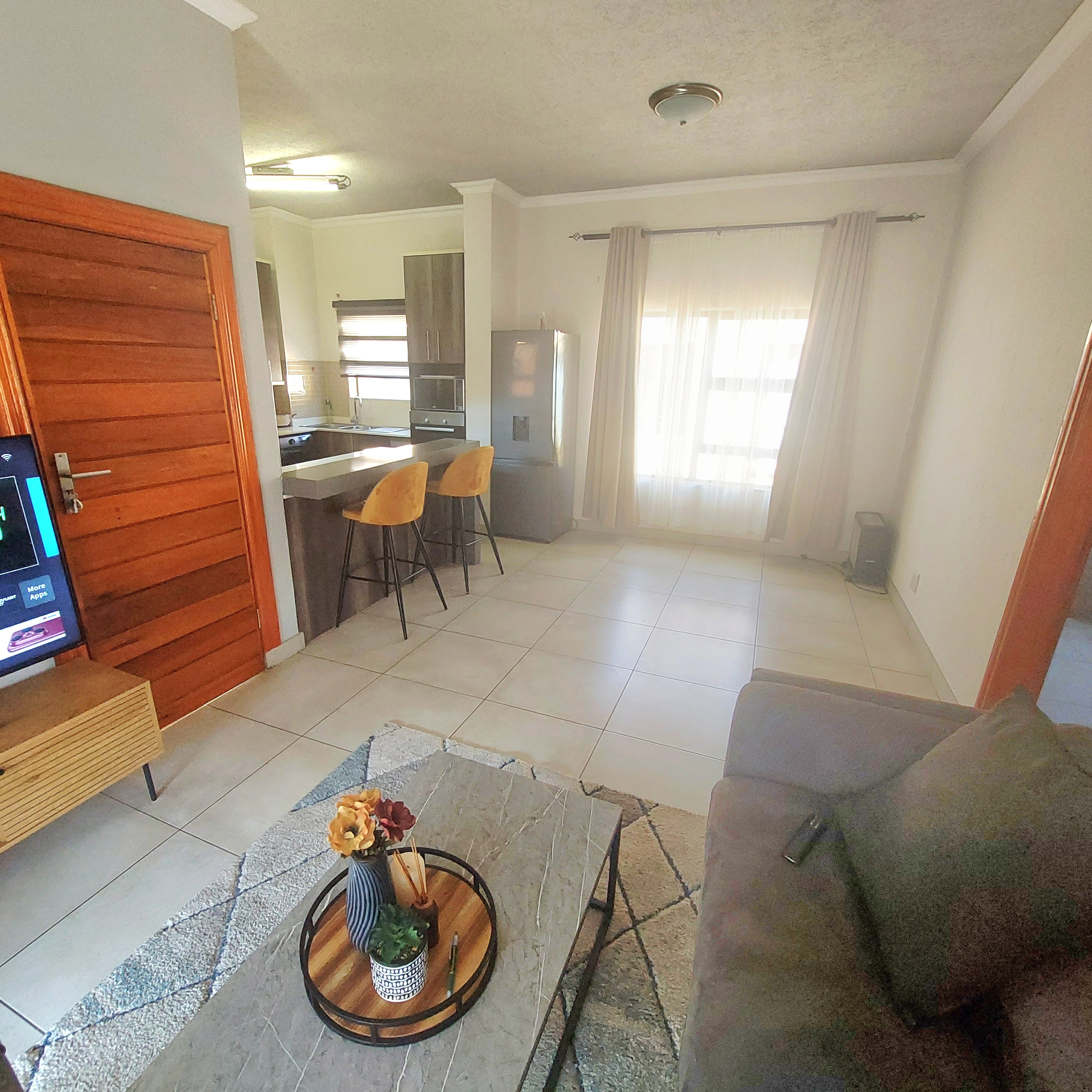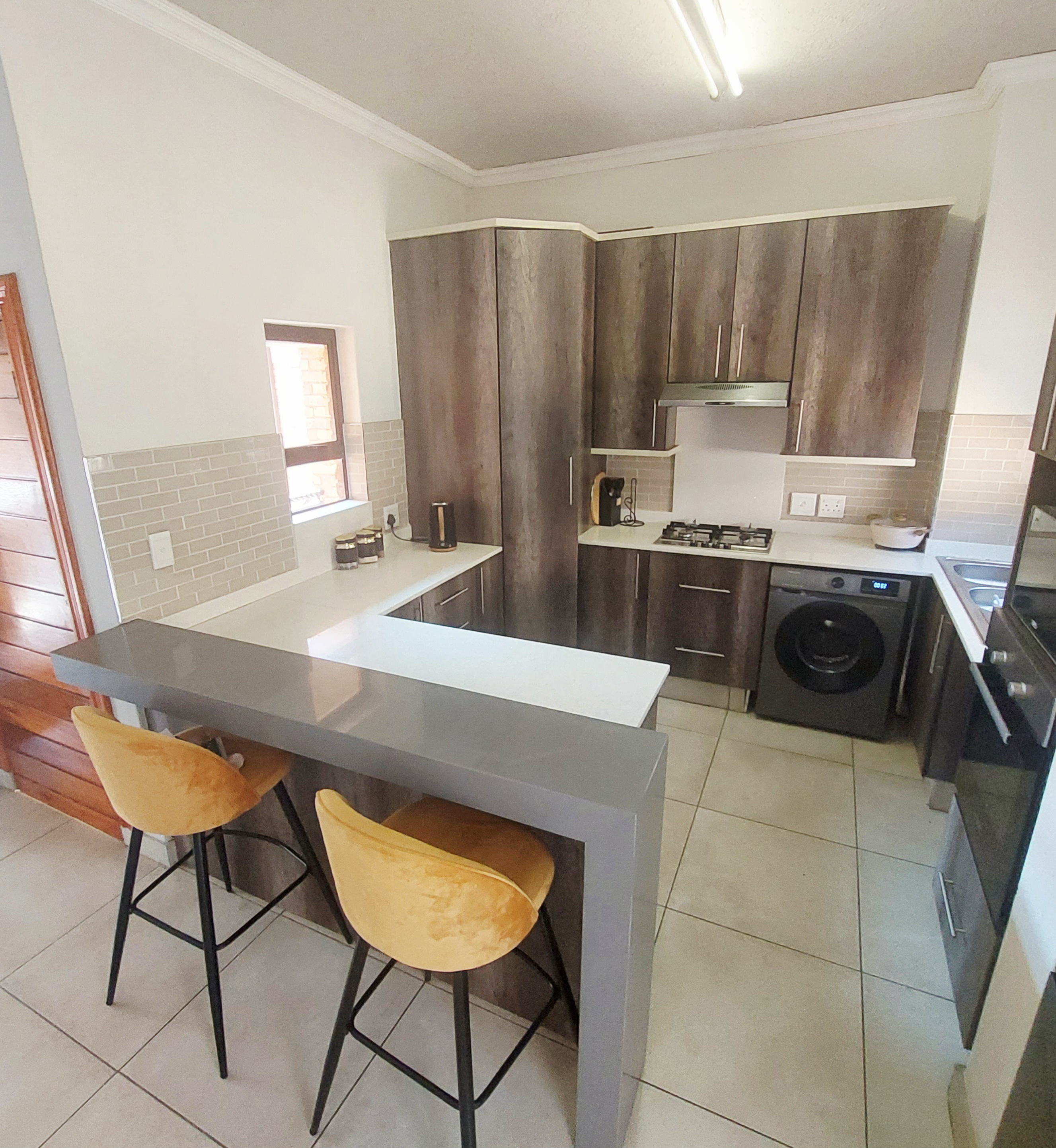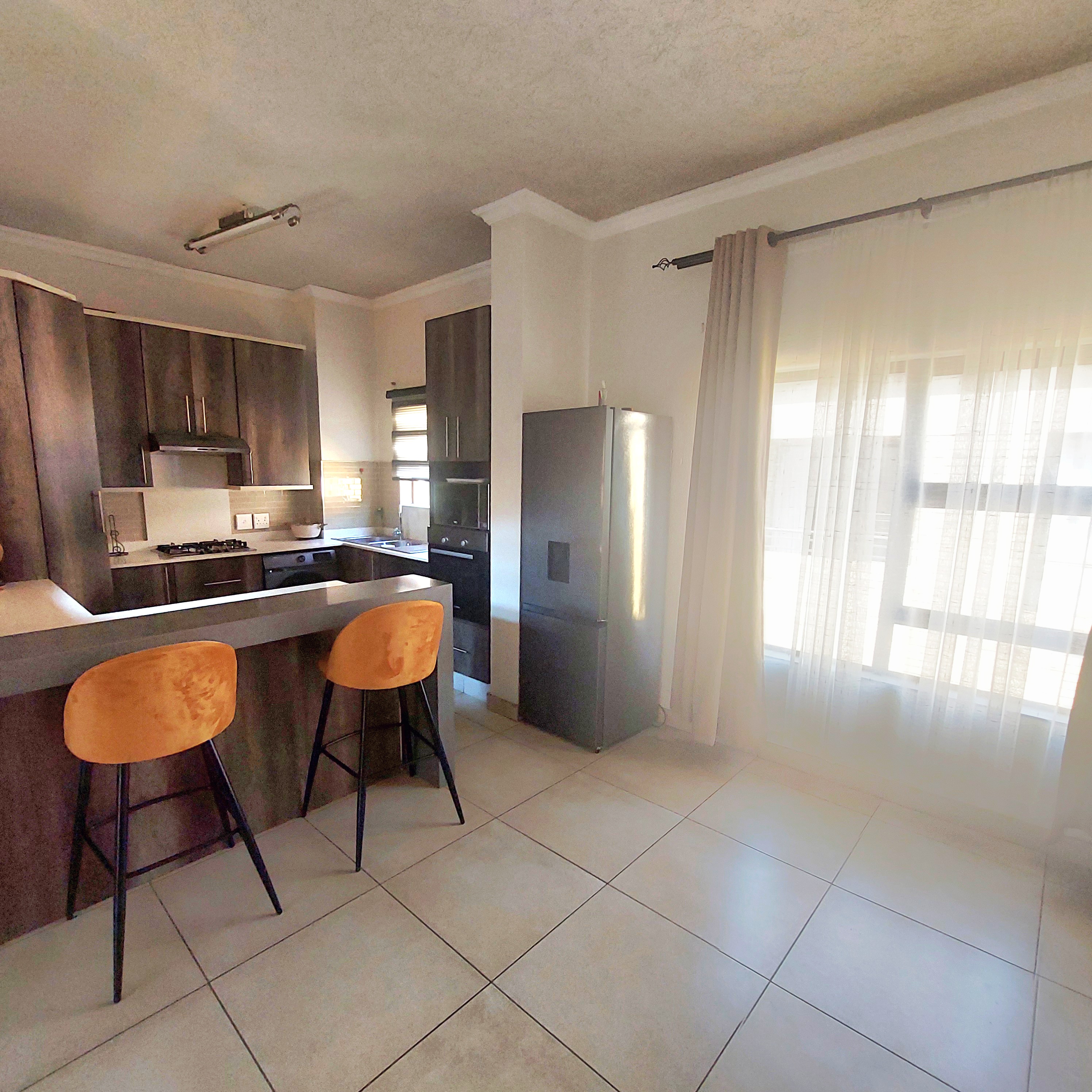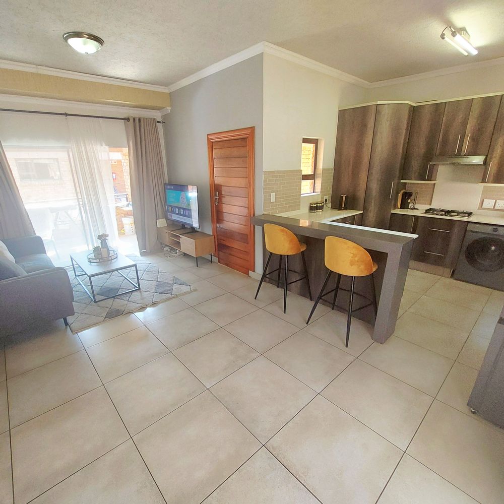 Offering 2 spacious bedrooms and 2 elegant bathrooms, the home is designed with high ceilings and generously sized rooms throughout, creating a light and airy feel. The contemporary kitchen features Caesar stone countertops, a gas cooker, and ample cupboard space, flowing seamlessly into the large dining area and open-plan lounge. From here, sliding doors open onto a spacious balcony with a built-in braai area – perfect for entertaining.