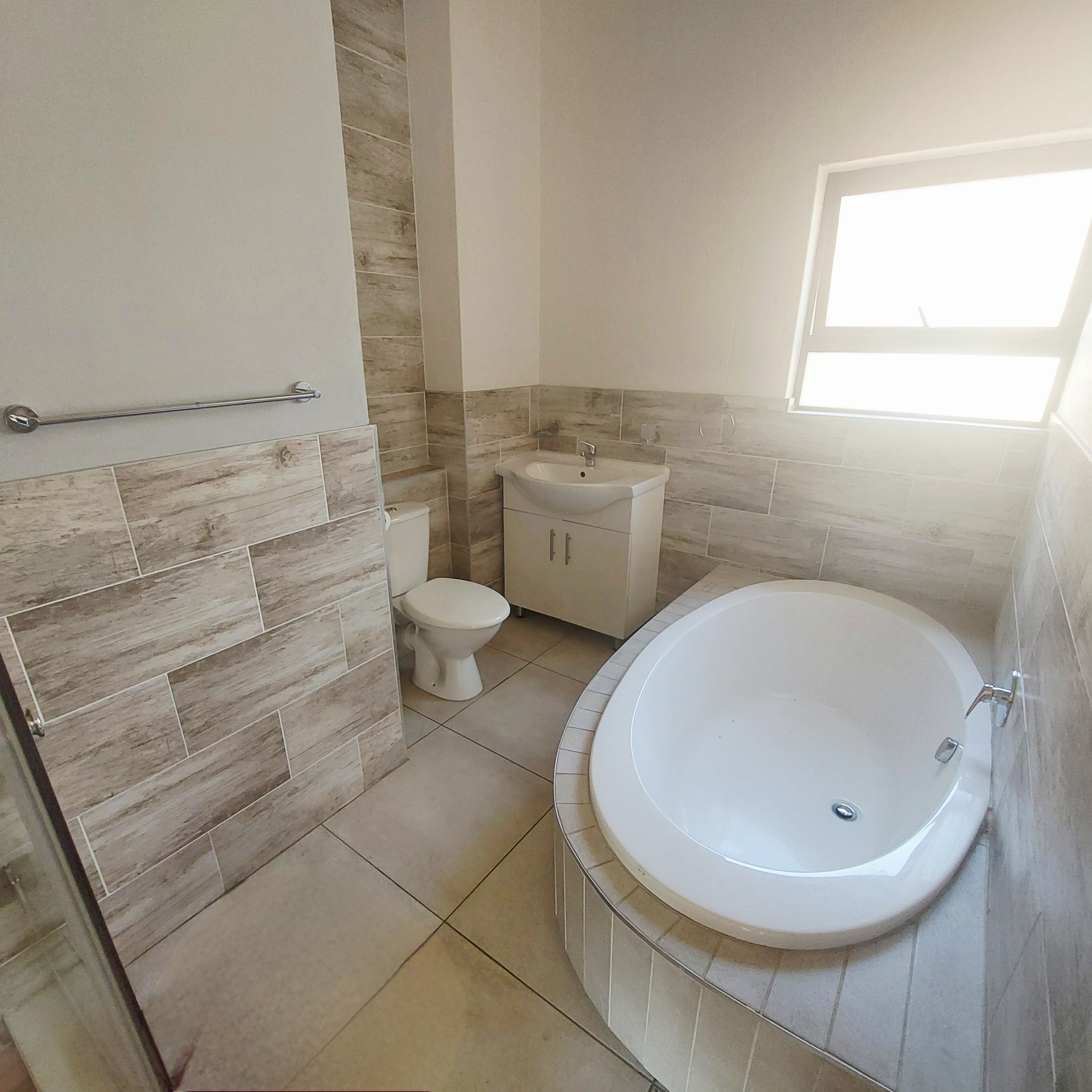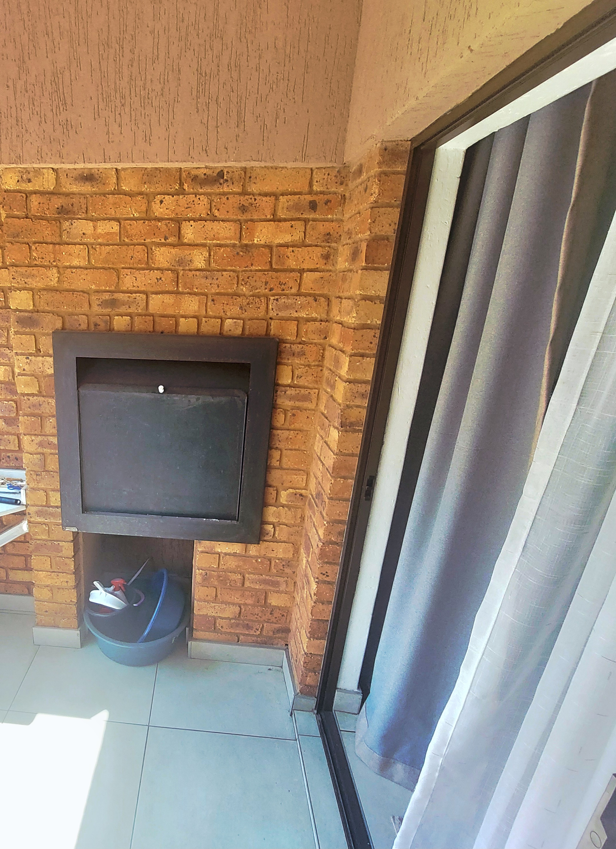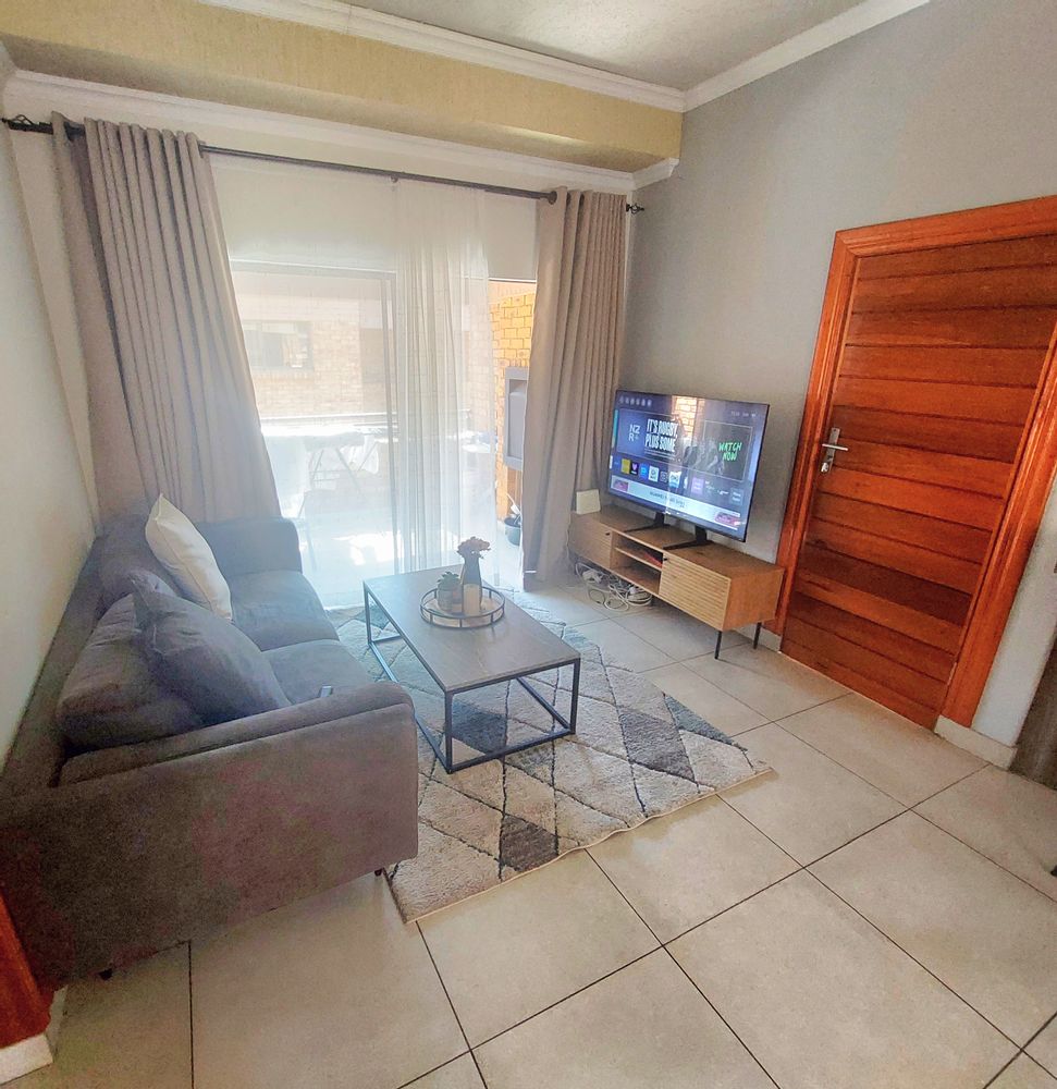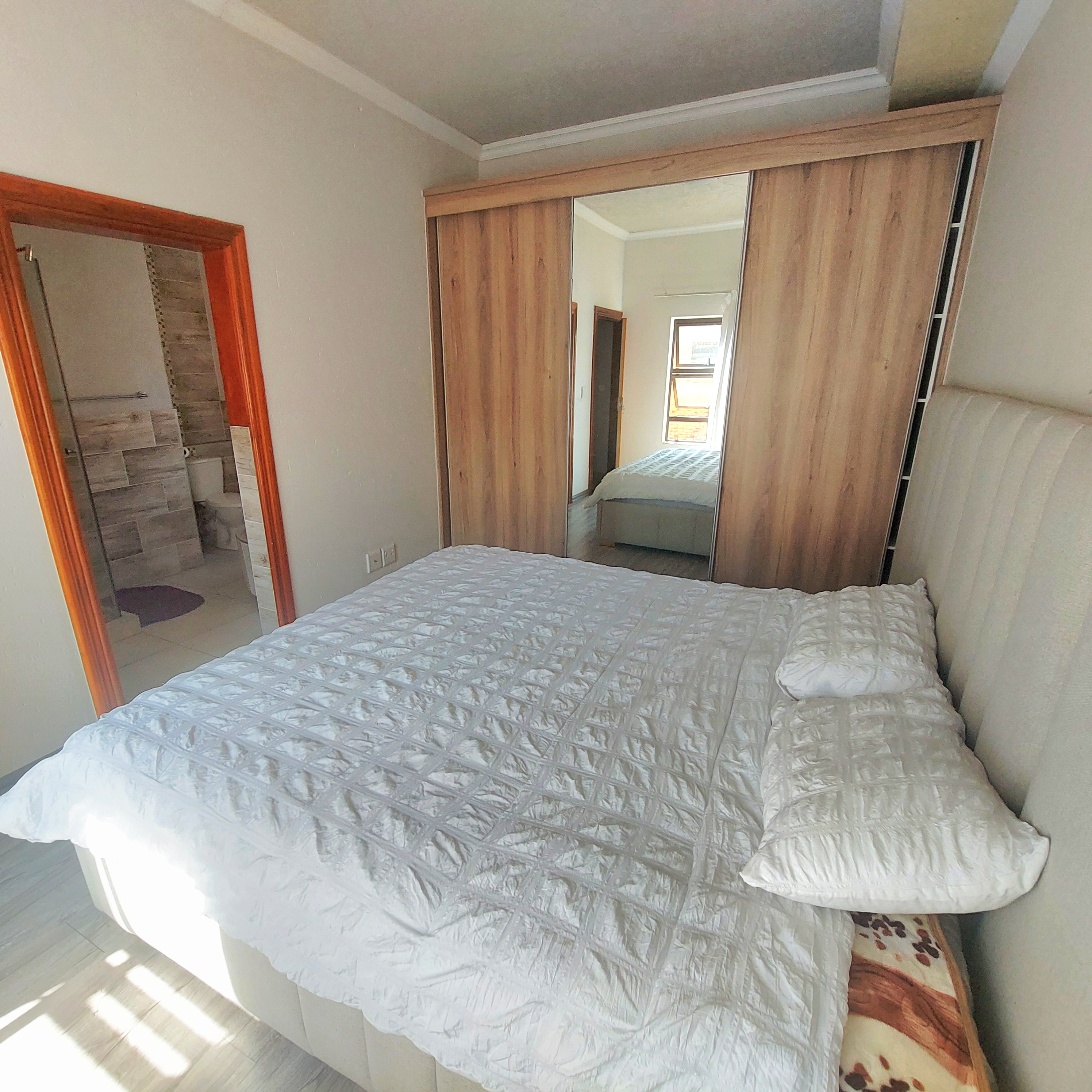 Offering 2 spacious bedrooms and 2 elegant bathrooms, the home is designed with high ceilings and generously sized rooms throughout, creating a light and airy feel. The contemporary kitchen features Caesar stone countertops, a gas cooker, and ample cupboard space, flowing seamlessly into the large dining area and open-plan lounge. From here, sliding doors open onto a spacious balcony with a built-in braai area – perfect for entertaining.