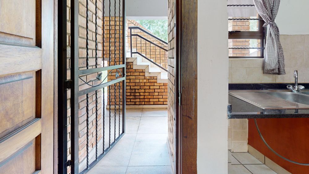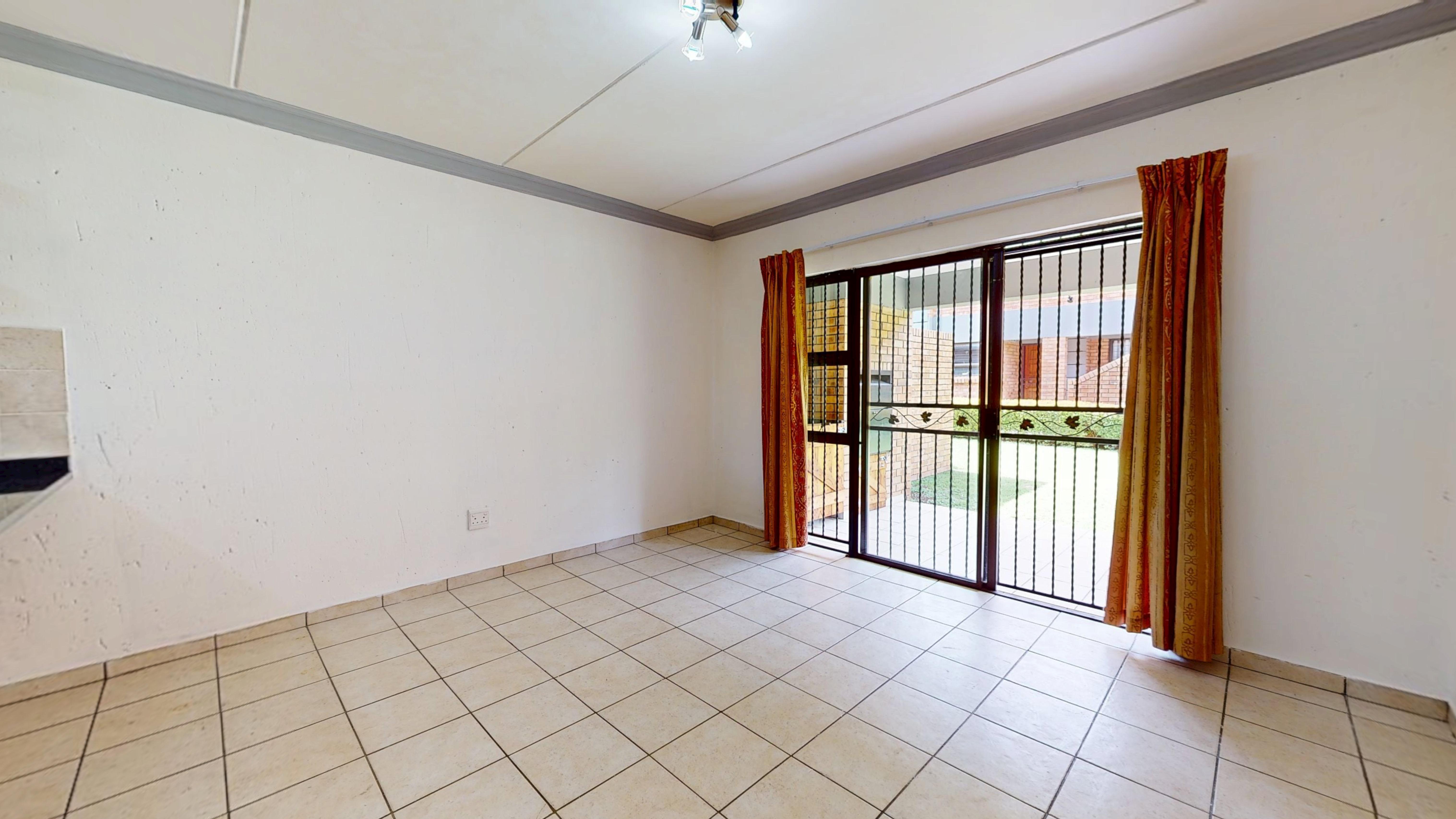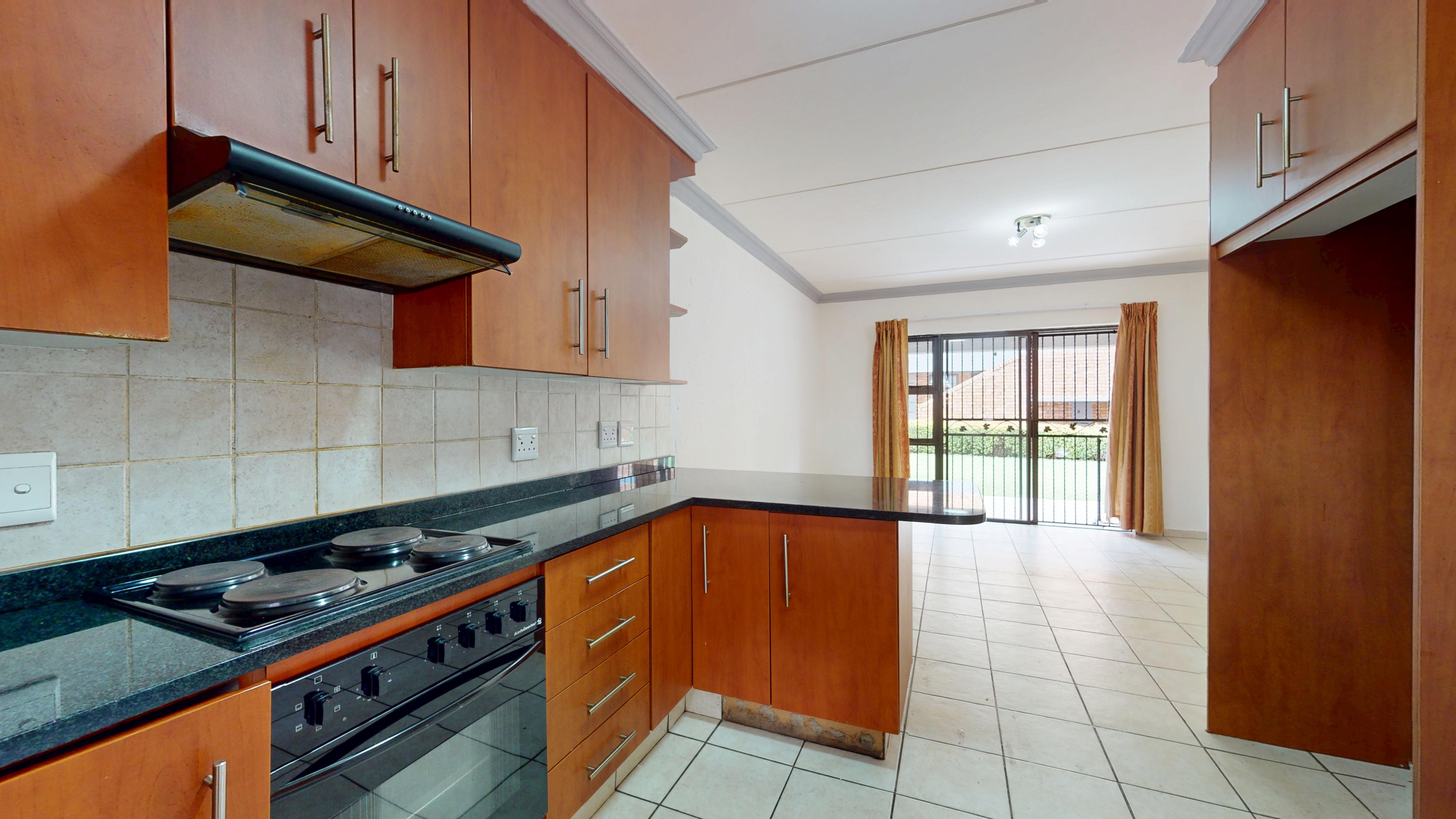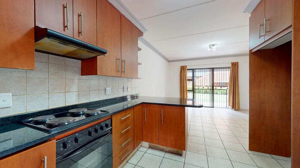 Discover this neat-as-a-pin ground floor unit located in the highly sought-after Ravenswood Mews. The welcoming, practical kitchen features built-in cupboards and tiled flooring. It flows seamlessly into the open-plan lounge, creating a warm and functional living space. Sliding doors lead to a covered porch with a built-in braai, overlooking the well-kept green lawn.