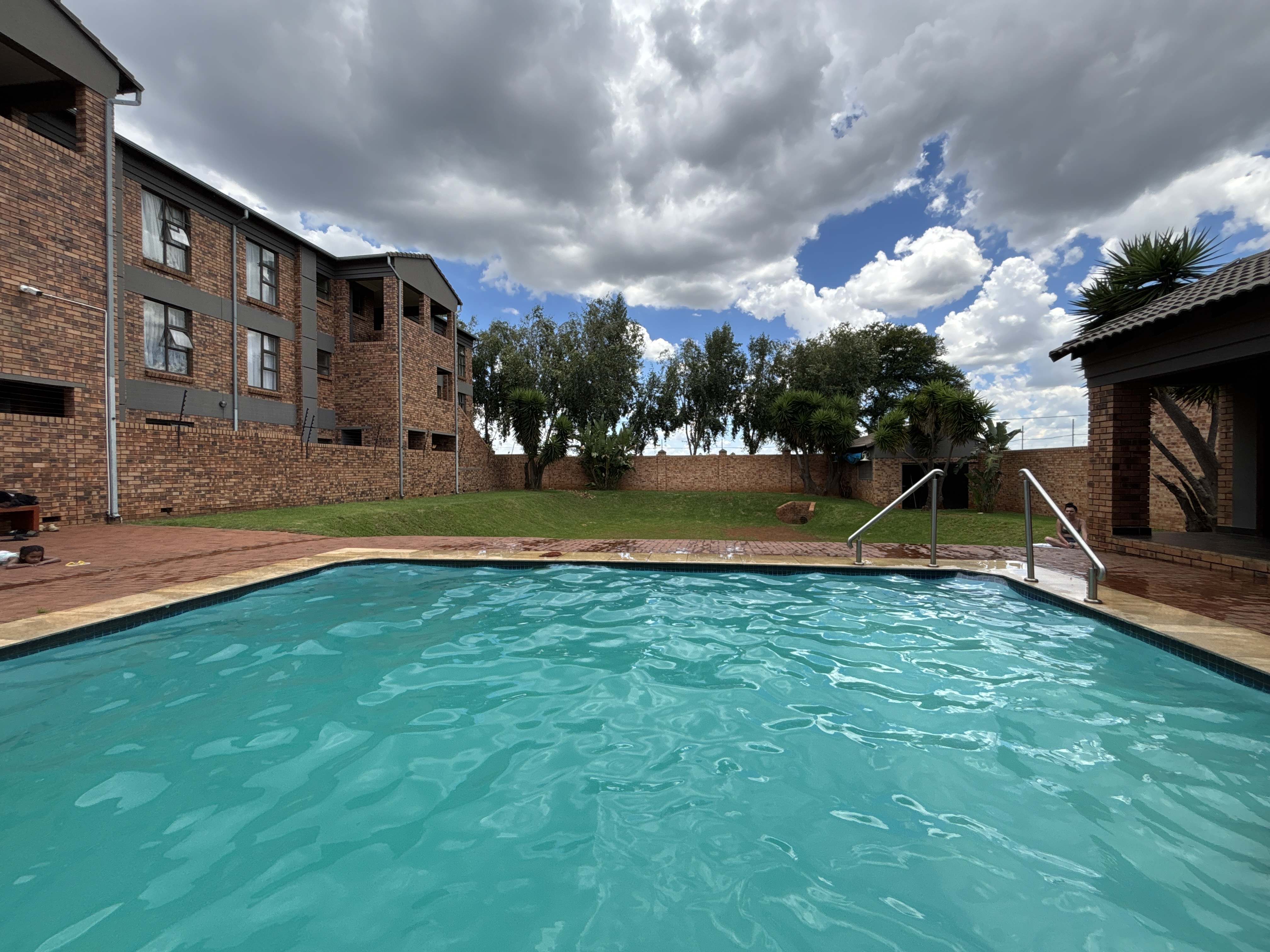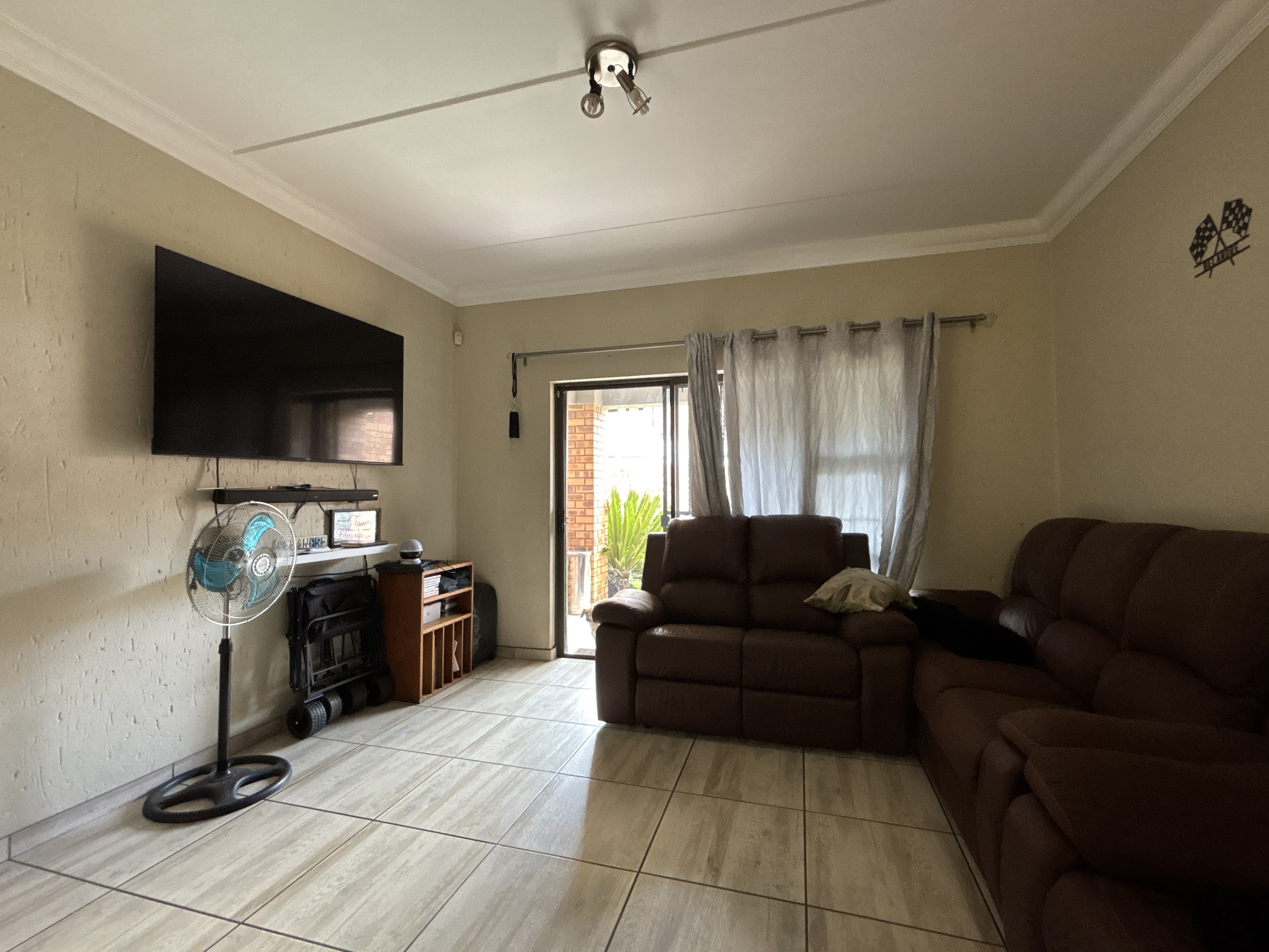 The open-plan living area flows seamlessly onto a private patio with built-in braai, overlooking a private garden – perfect for entertaining or relaxed outdoor living. The complex is well managed and offers excellent lifestyle features including a swimming pool and generator backup, ensuring peace of mind during power outages.