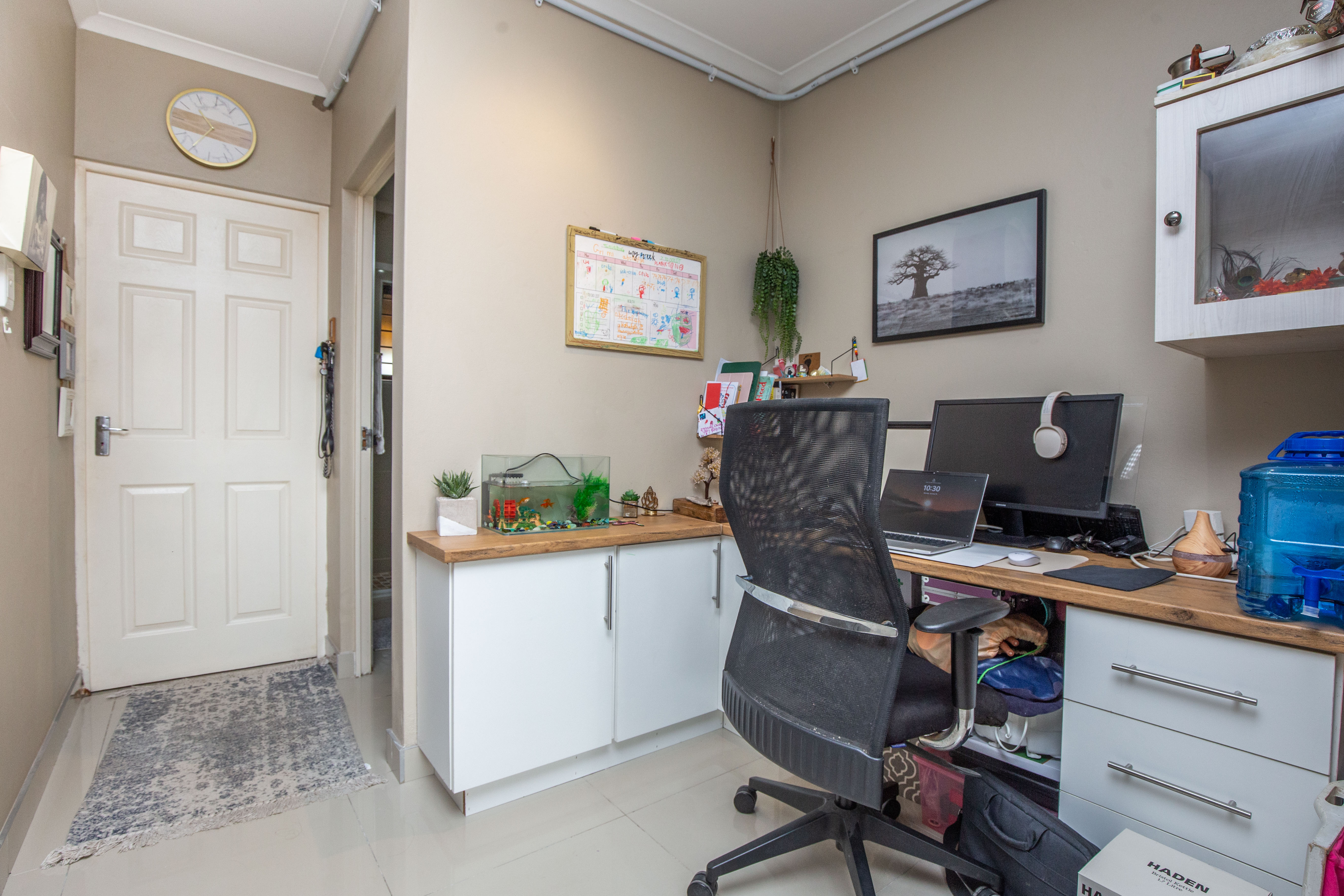 Situated on the ground floor, the apartment features a modern bathroom with a sleek glass shower, a dedicated office space ideal for working from home, and added convenience with a private washing line and an outdoor washing basin
