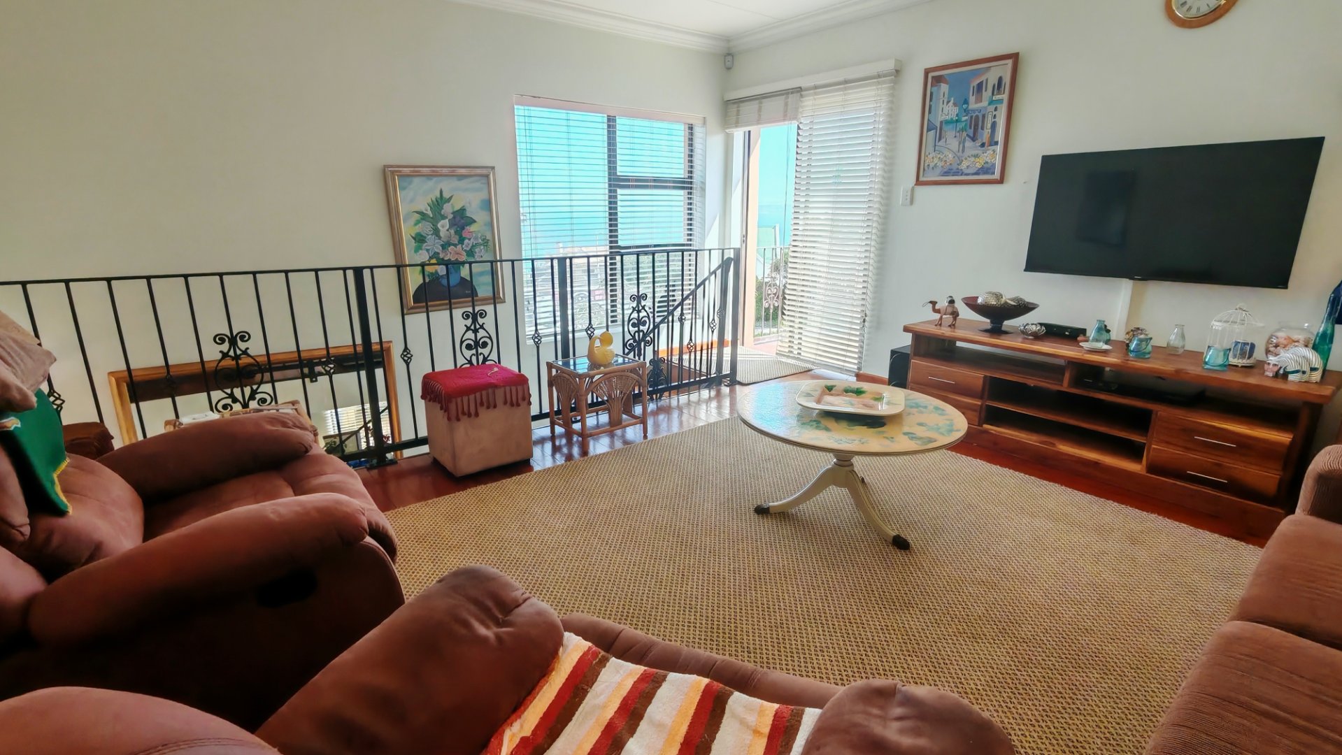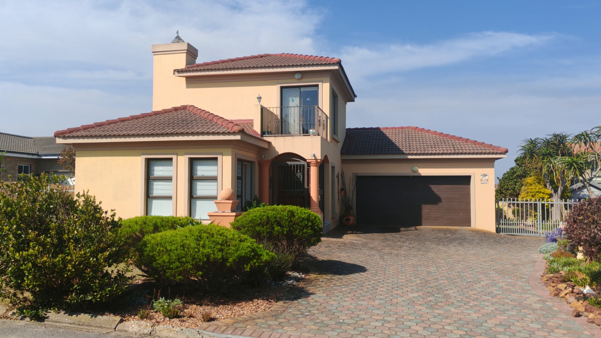 This elegant Tuscan-style residence offers comfort, functionality and refined design. A welcoming entrance leads to an open-plan living area comprising a lounge, dining room, and a well-appointed kitchen with a separate scullery for added convenience. The home features three spacious bedrooms and three bathrooms, of which two are en-suite. Two bedrooms are located on the ground floor, while the third bedroom/family room upstairs includes a private balcony with a sea view, creating an ideal retreat. Additional features include a double garage with direct access to the house, ample additional parking, and a low-maintenance, neatly landscaped garden.