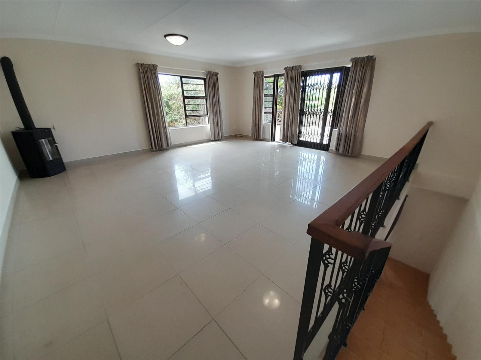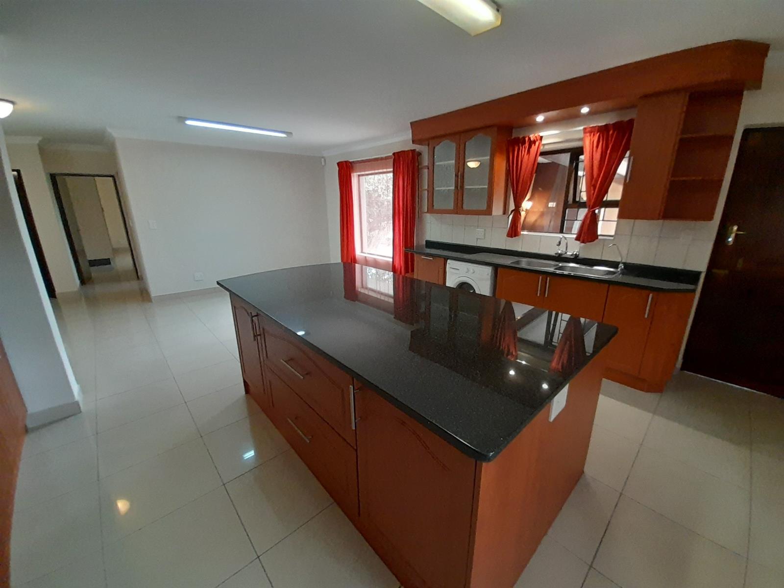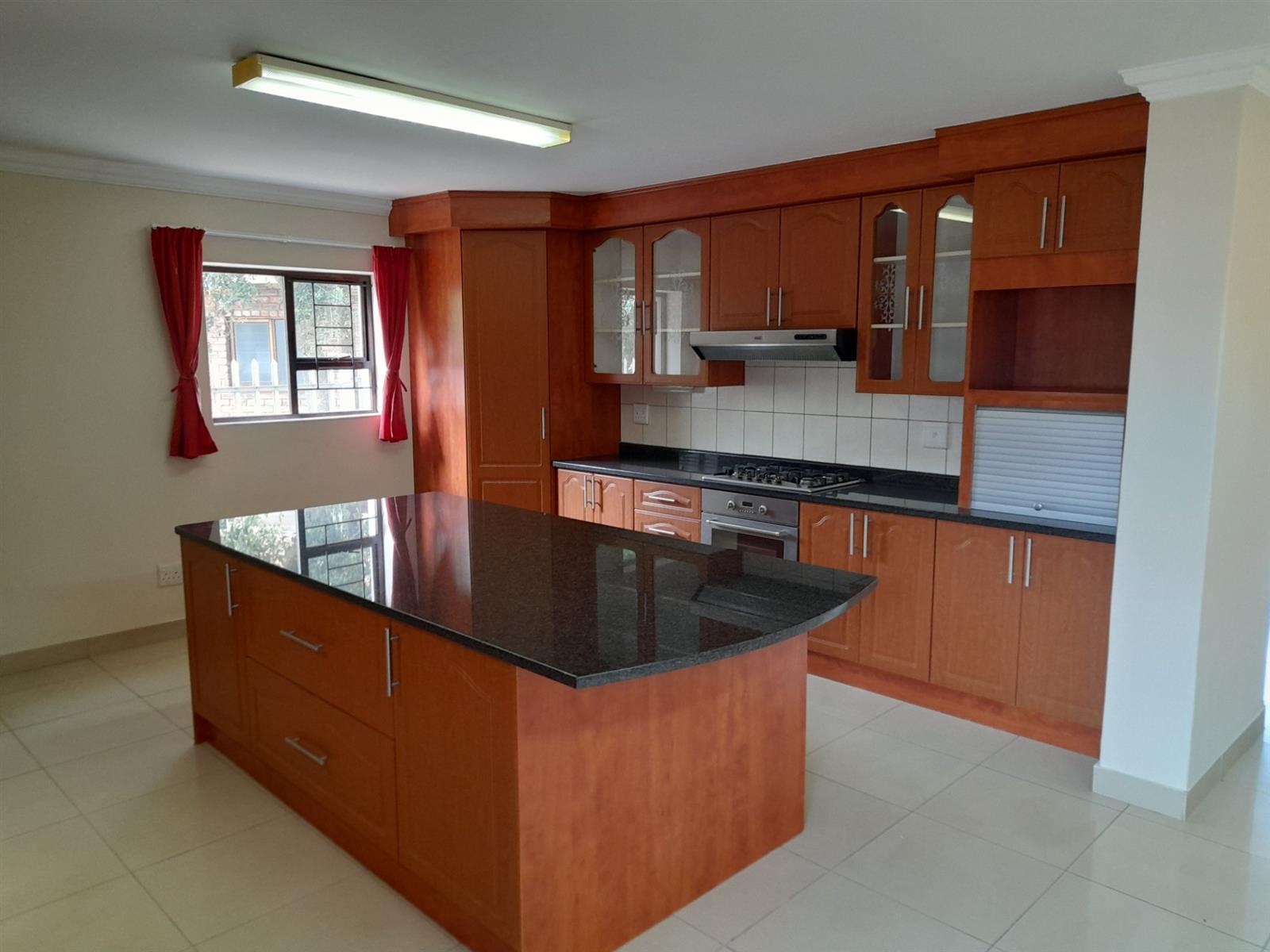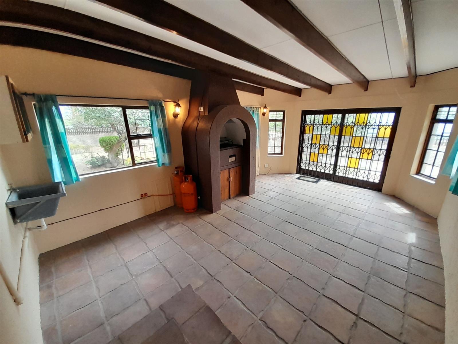 The ground floor welcomes you into a spacious open-plan living and dining area that flows seamlessly into a stylish, practical kitchen. The kitchen is well equipped with ample cabinetry, a corner pantry, gas hob with extractor, under-counter oven, space for an under-counter washing machine and a large central island providing additional storage and preparation space. From the kitchen, a back door leads into a large, light-filled braai room with windows allowing natural light and a sliding door opening directly onto the rear garden, ideal for relaxed, all-season entertaining.