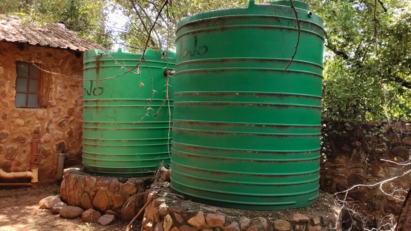 2 × 5,000L JoJo tanks for rainwater backup and 2 × 10,000L JoJo tanks for borehole supply.