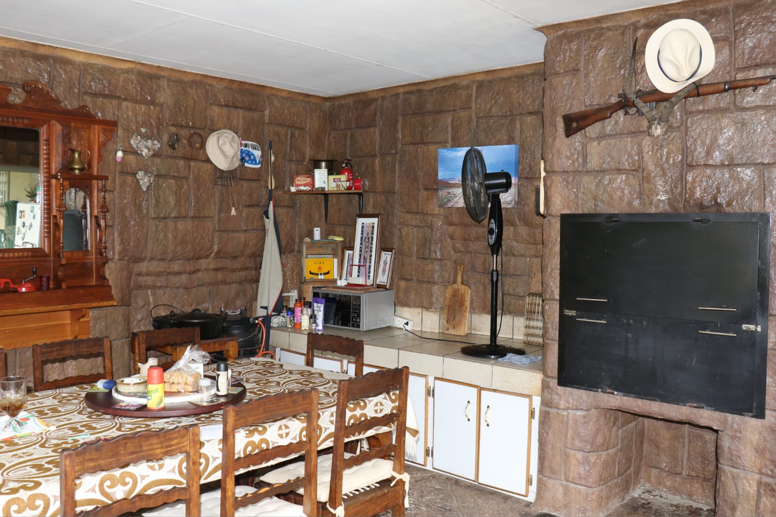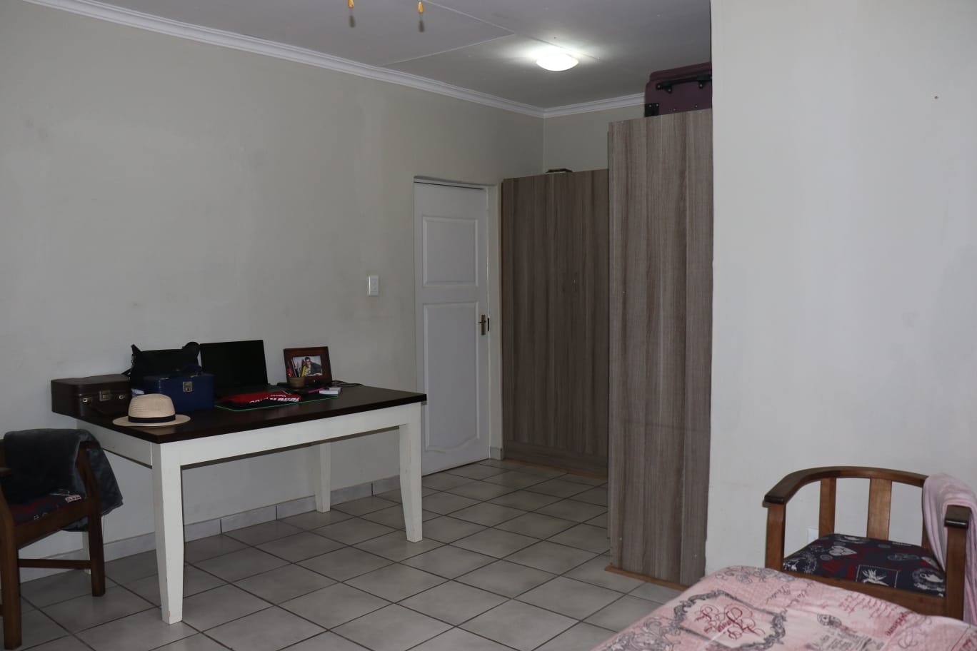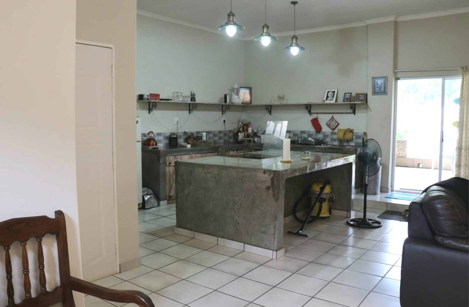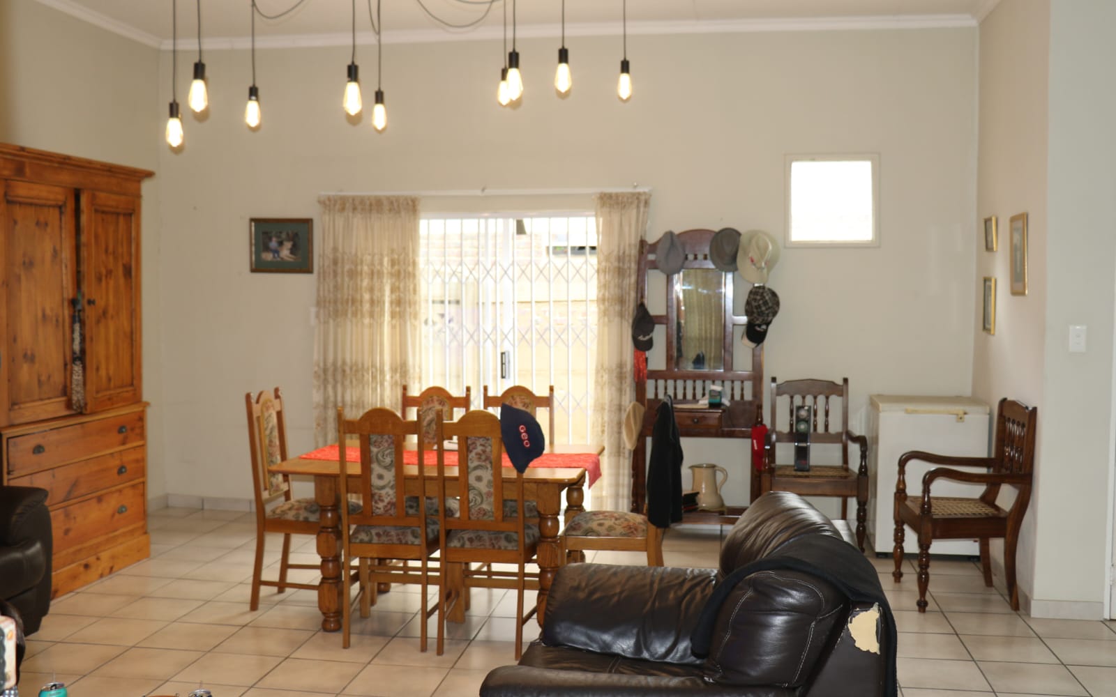The home also boasts a dedicated dining room, perfect for family meals and entertaining. Flowing from the kitchen, the built-in braai area is ideally positioned just outside the kitchen door to the right and overlooks the neatly kept garden and swimming pool—creating a relaxed space for outdoor entertaining and family gatherings. The main house is completed by a double garage, with double undercover carports located directly in front, providing ample parking.