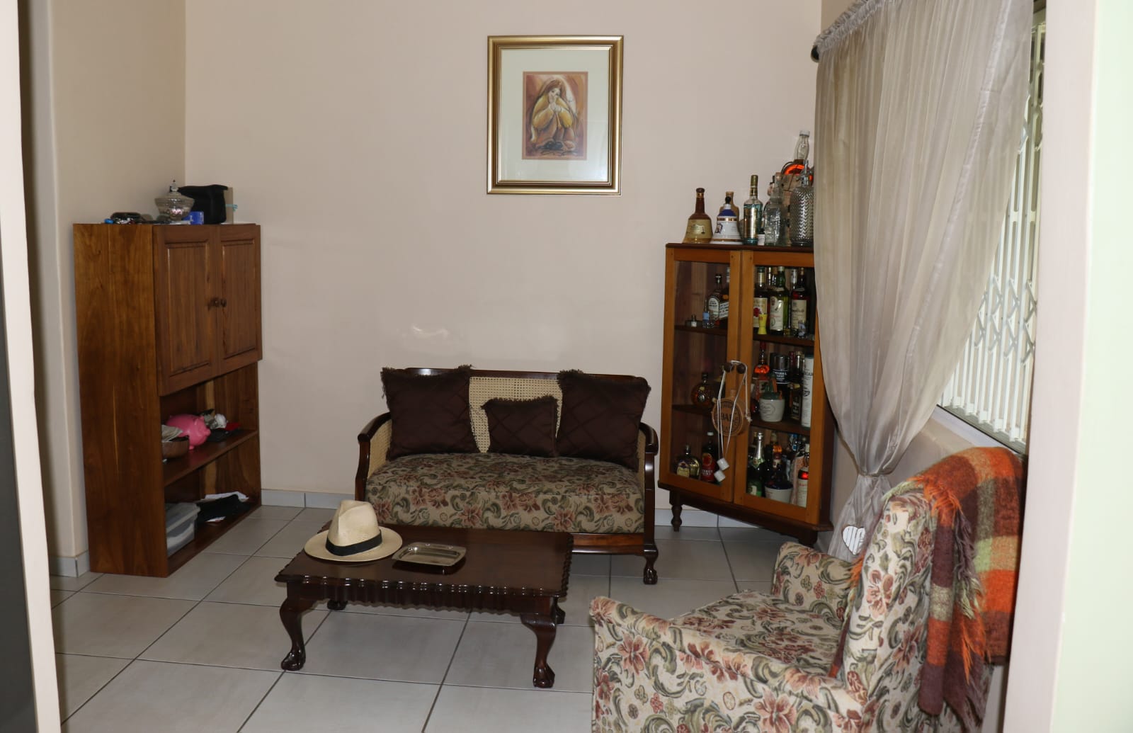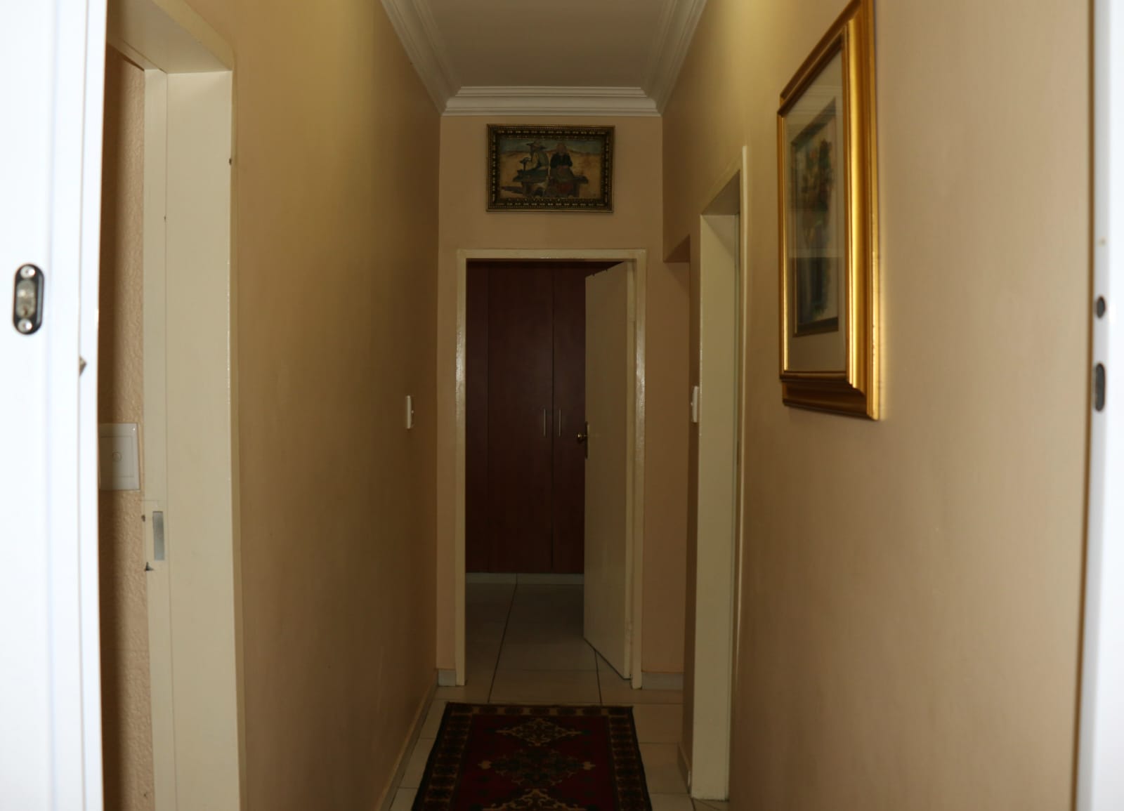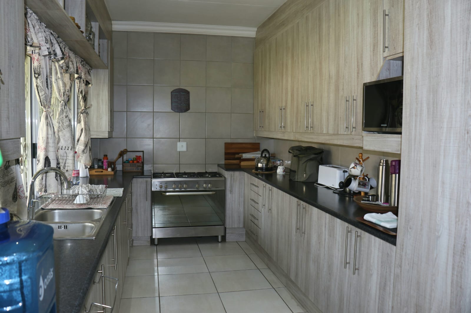 The home also boasts a dedicated dining room, perfect for family meals and entertaining. Flowing from the kitchen, the built-in braai area is ideally positioned just outside the kitchen door to the right and overlooks the neatly kept garden and swimming pool—creating a relaxed space for outdoor entertaining and family gatherings. The main house is completed by a double garage, with double undercover carports located directly in front, providing ample parking.