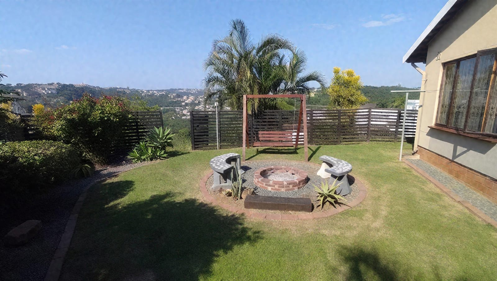 Outside, the property extends its warm invitation with a delightful entertainment area. Tenants can gather around the beautiful boma fire pit, enjoy a braai, or simply unwind on the charming wooden swing chair. Practicality is covered with ample parking for up to six vehicles. Furthermore, peace of mind is paramount, with the property situated on a safe street featuring boom-controlled access and comprehensive CCTV monitoring.