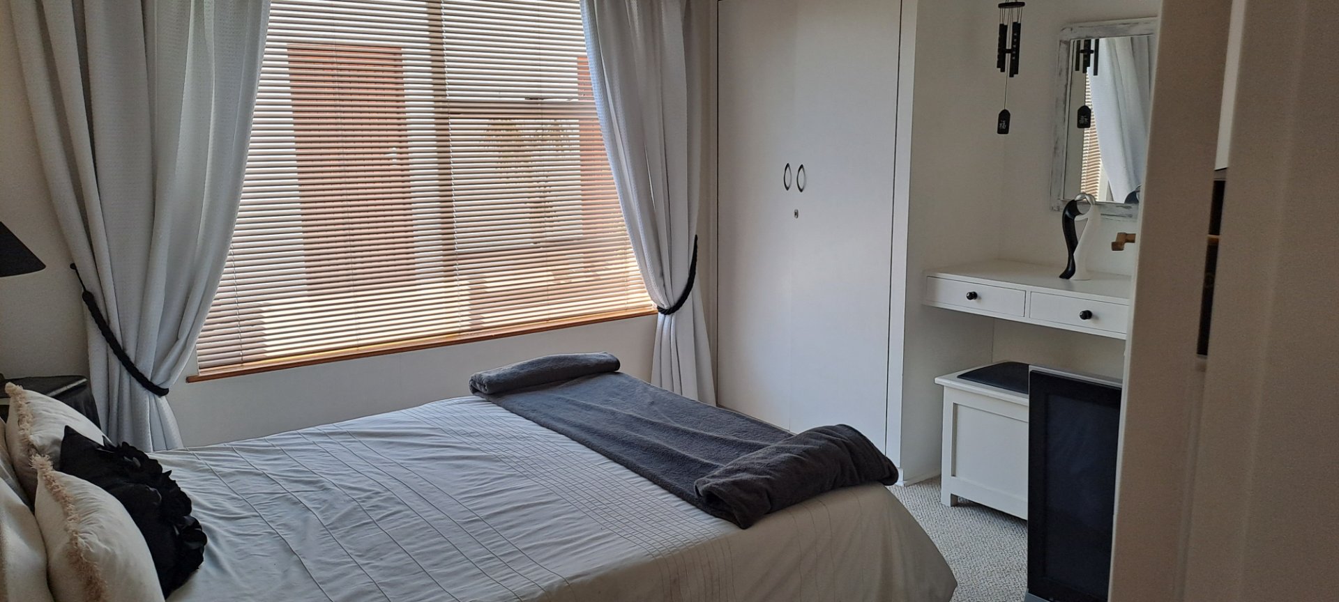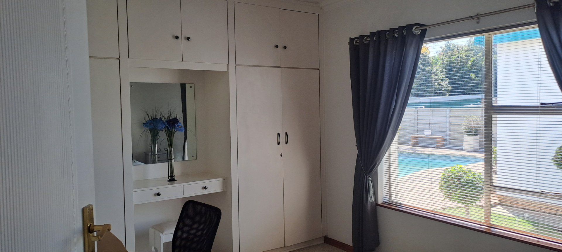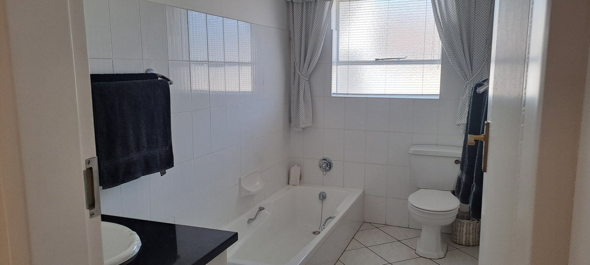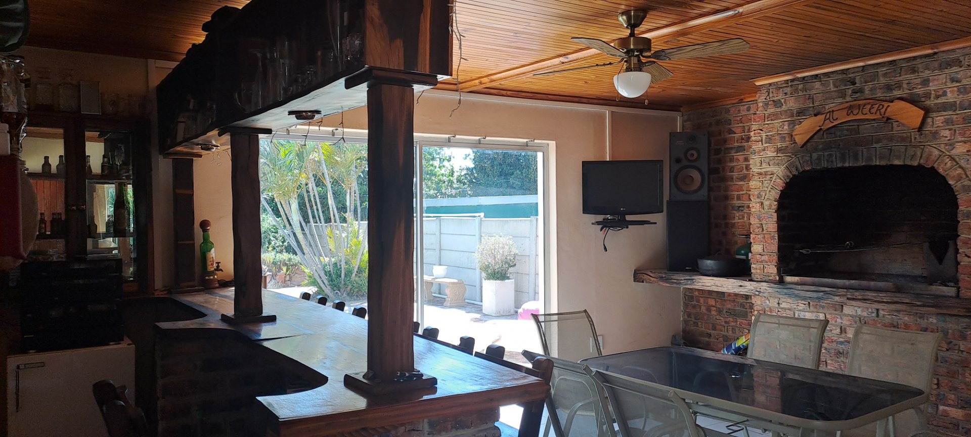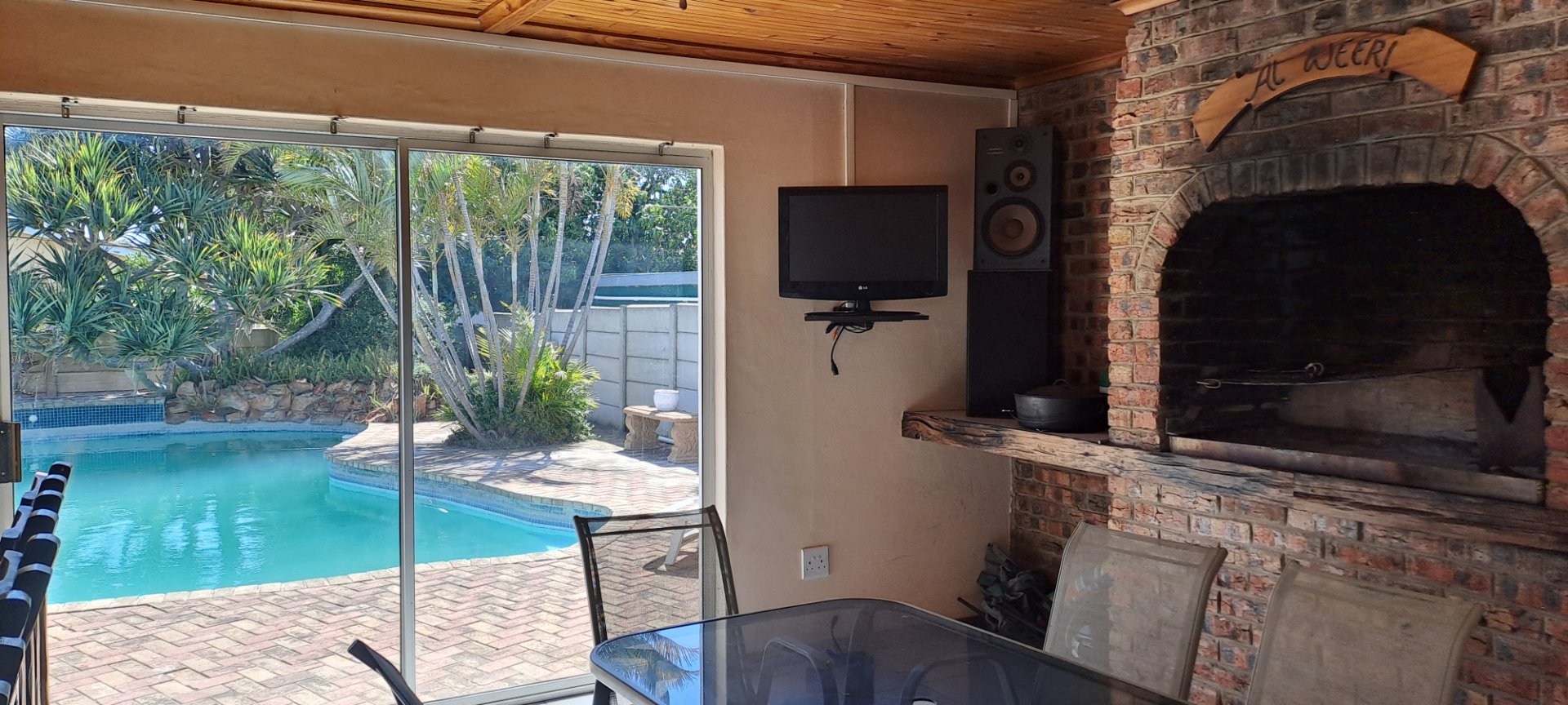 Spacious lounge and dining room, modern kitchen with built-in stove and oven, 3 bedrooms with BIC, 2 bathrooms (main en-suite with aircon). Outdoor entertainment area with built-in braai and bar, overlooking sparkling pool! Plus: outside laundry with toilet, Double garage on remote. Borehole with pump, sprinkler system. Alarm system available for takeover.
