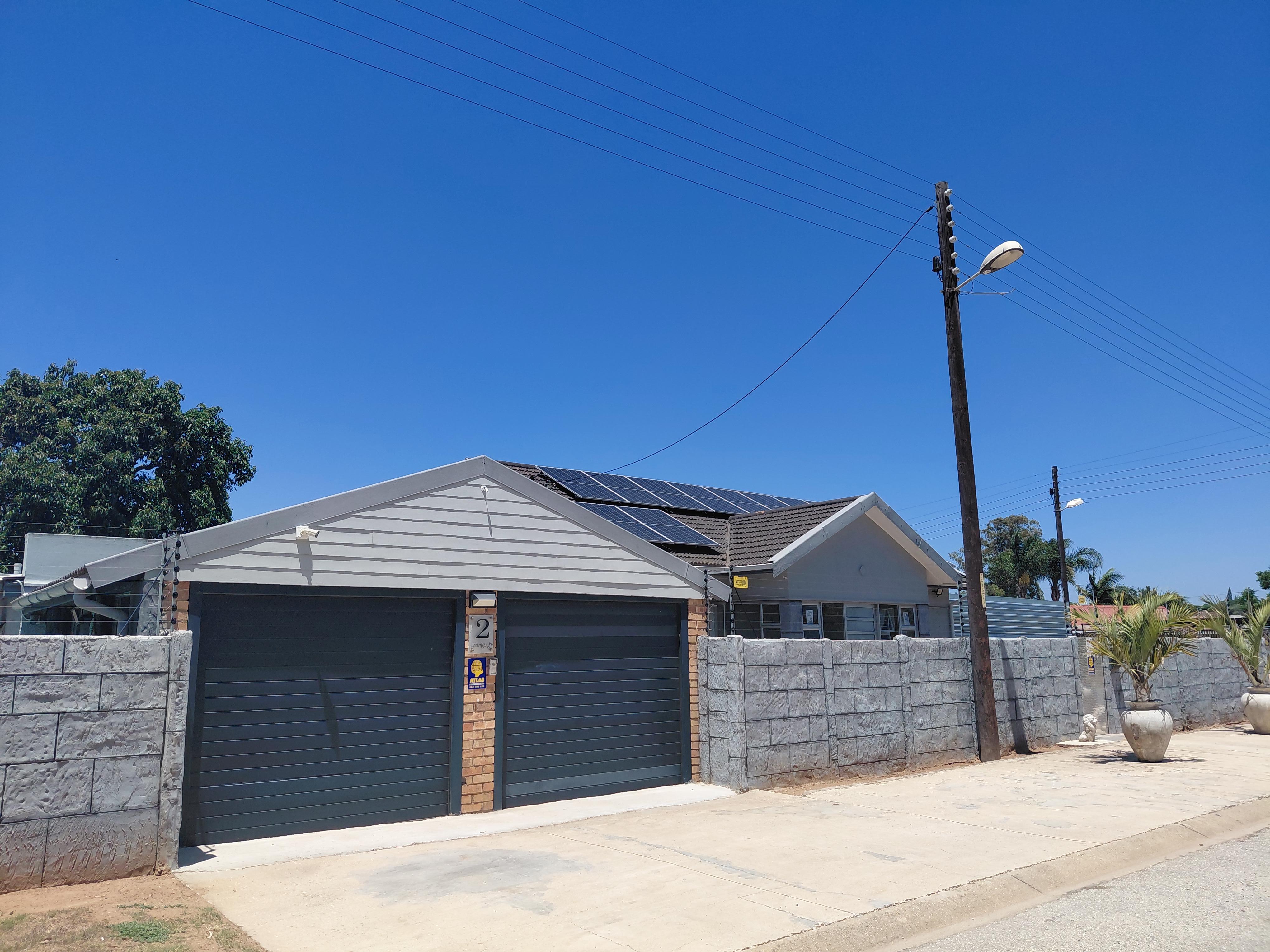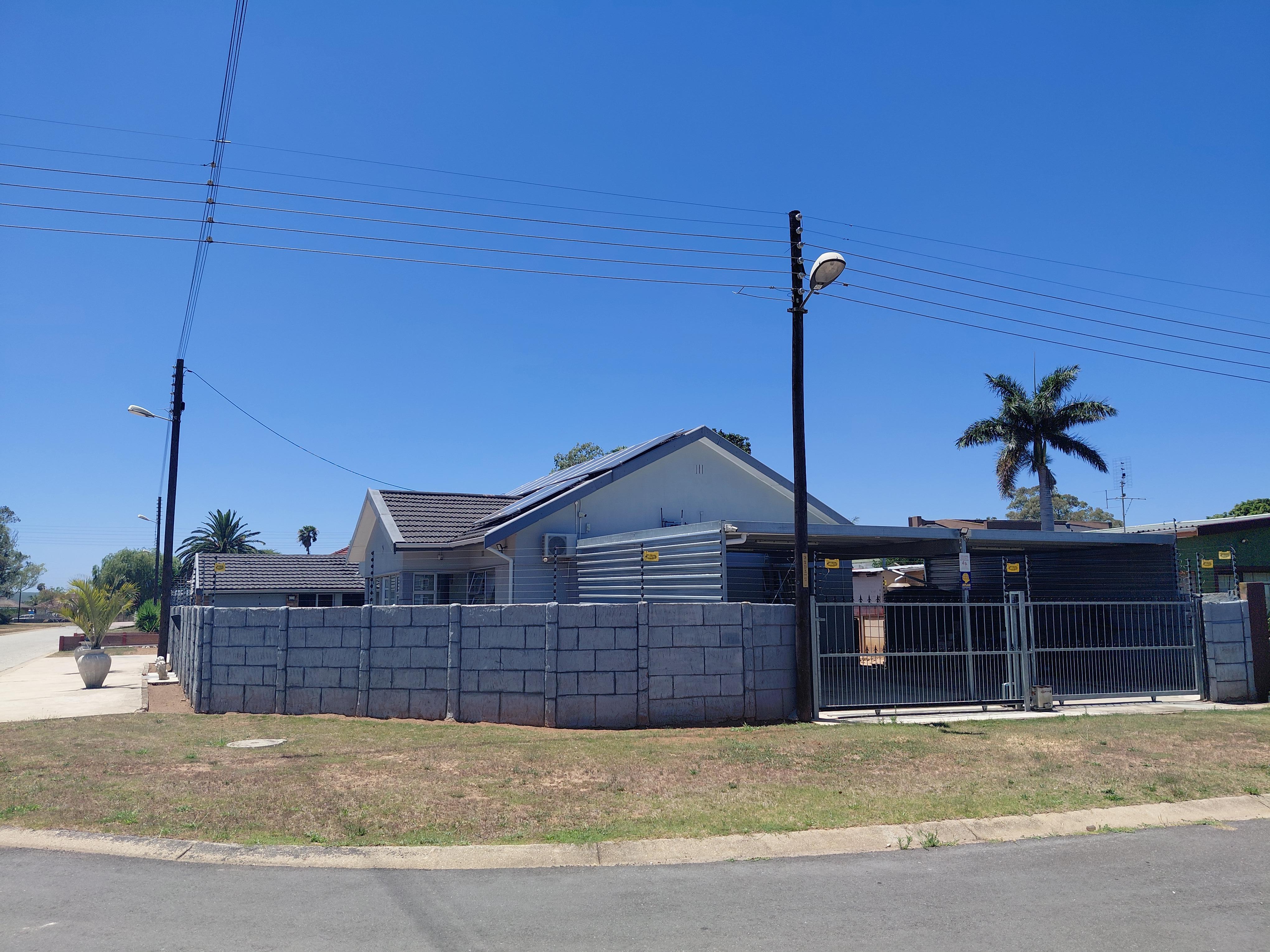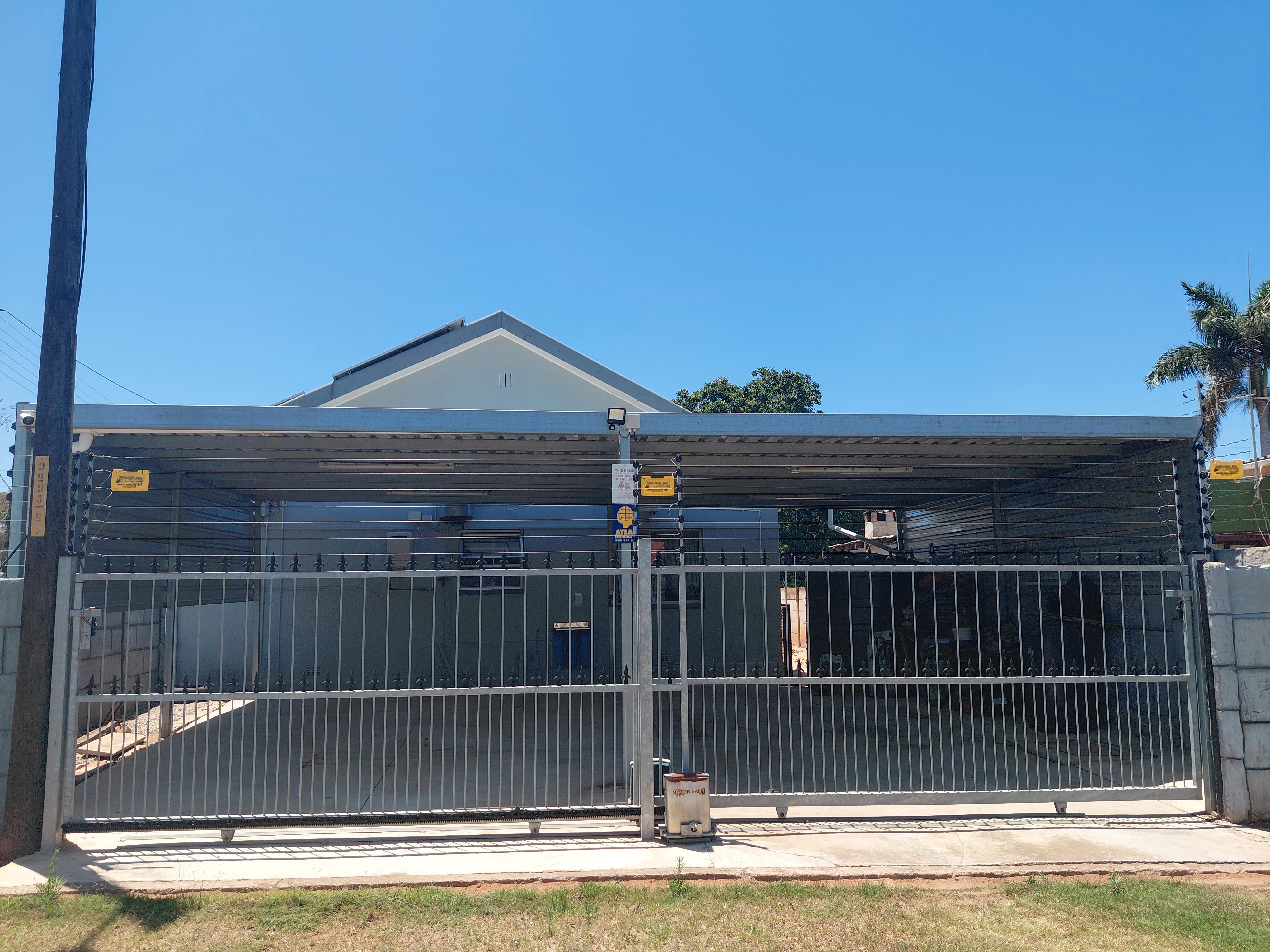 The home features a tiled roof, aluminium window frames, and is fully enclosed with an electric fence, alarm system, 6 cameras, and 3 beams. Energy efficiency is enhanced with 12 solar panels, prepaid electricity, and inverters (included). The property is so efficient that electricity is only purchased every four months.