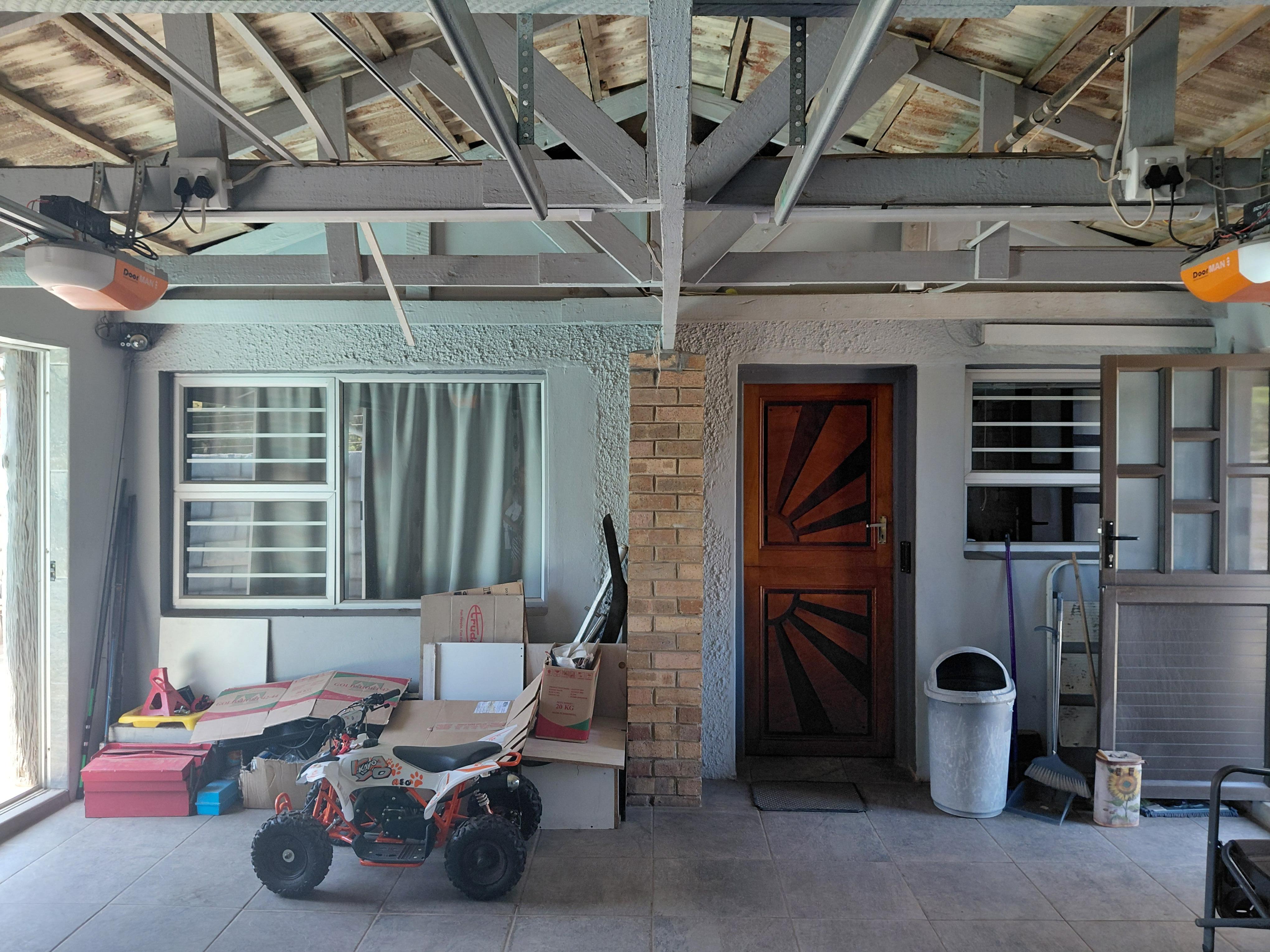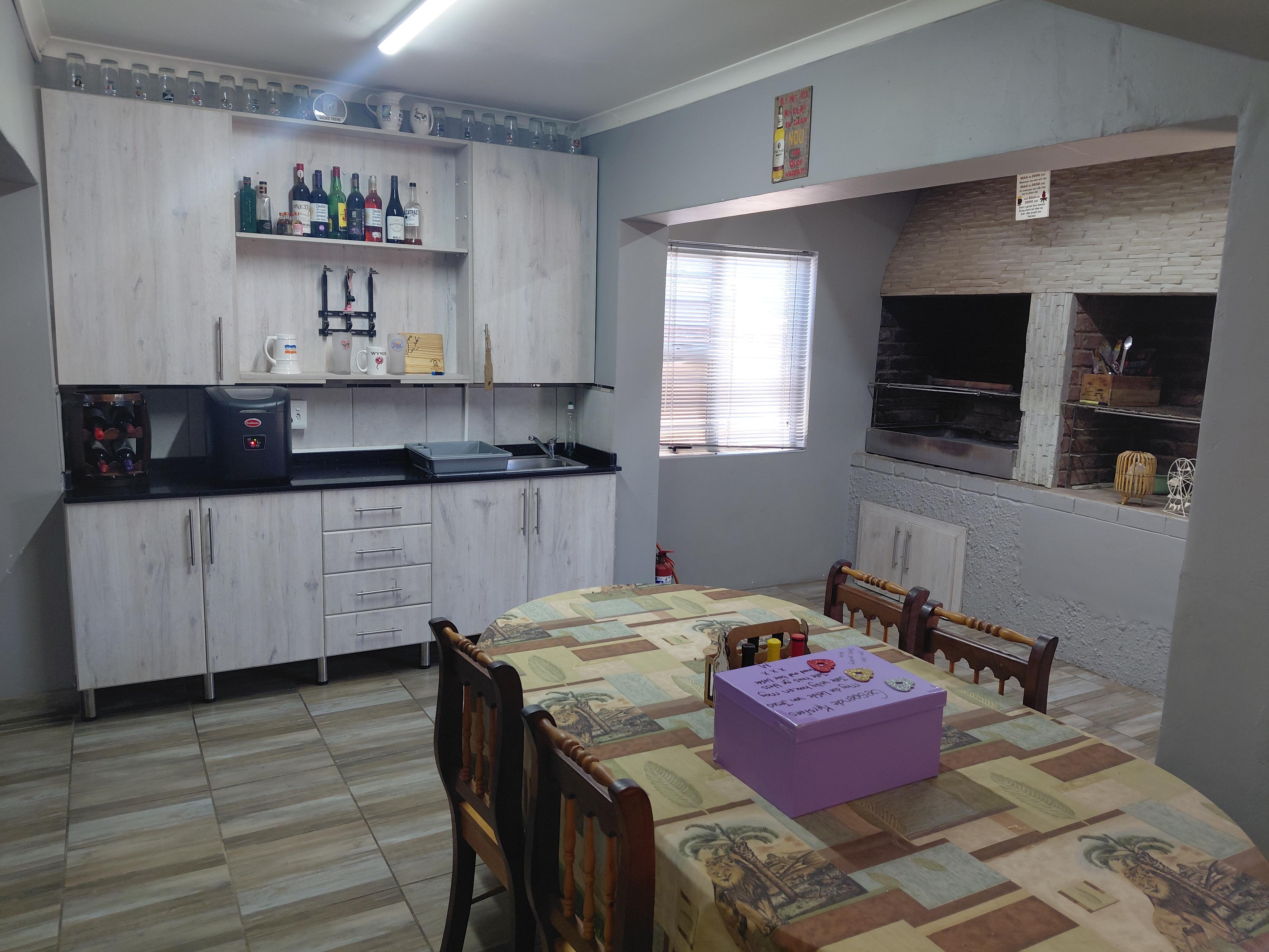 From the study, you enter a spacious under-roof entertainment and braai area, secured with security gates. This area is fully tiled and offers: