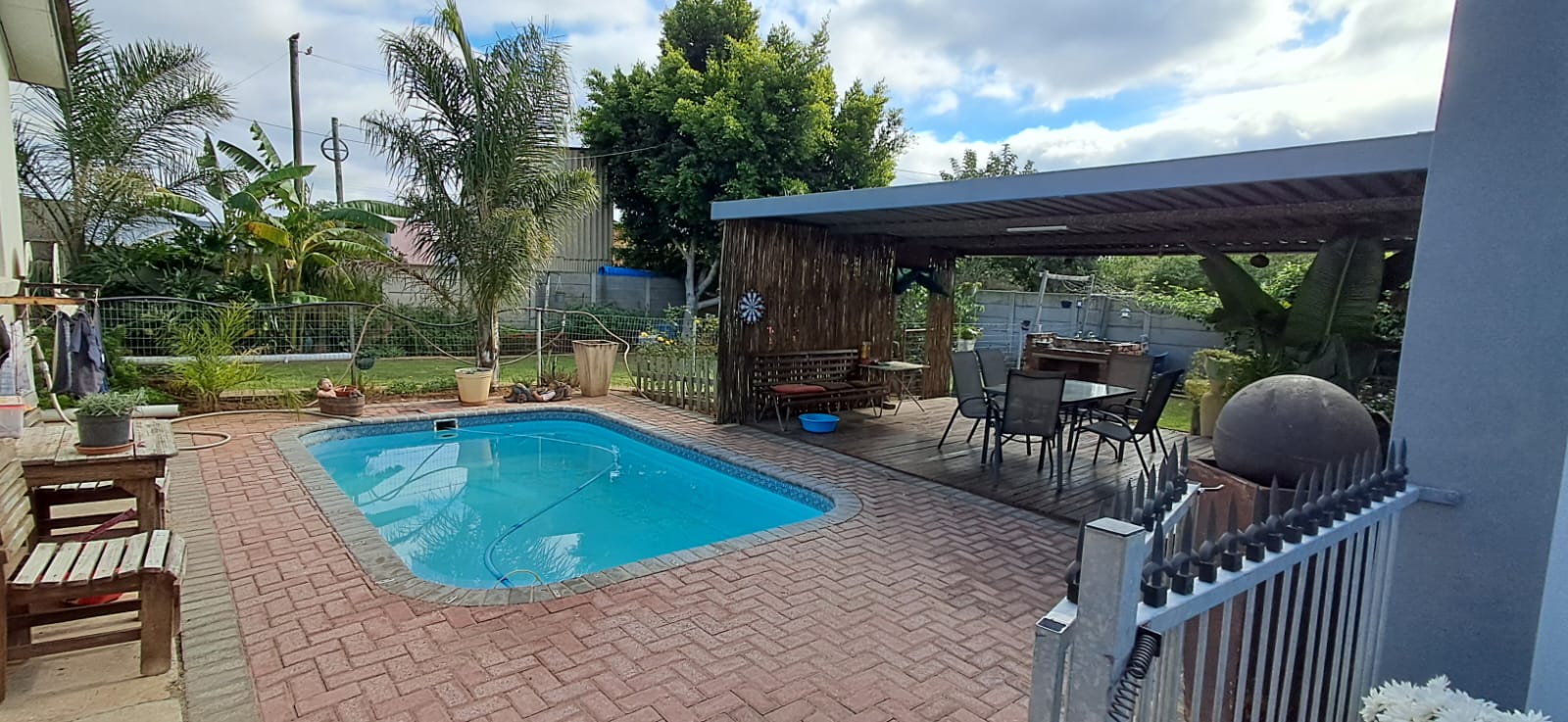 The home boasts an open-plan living area flowing into the kitchen, with a separate laundry for convenience. An under-roof braai area with sliding doors opens onto the swimming pool, making it ideal for entertaining.