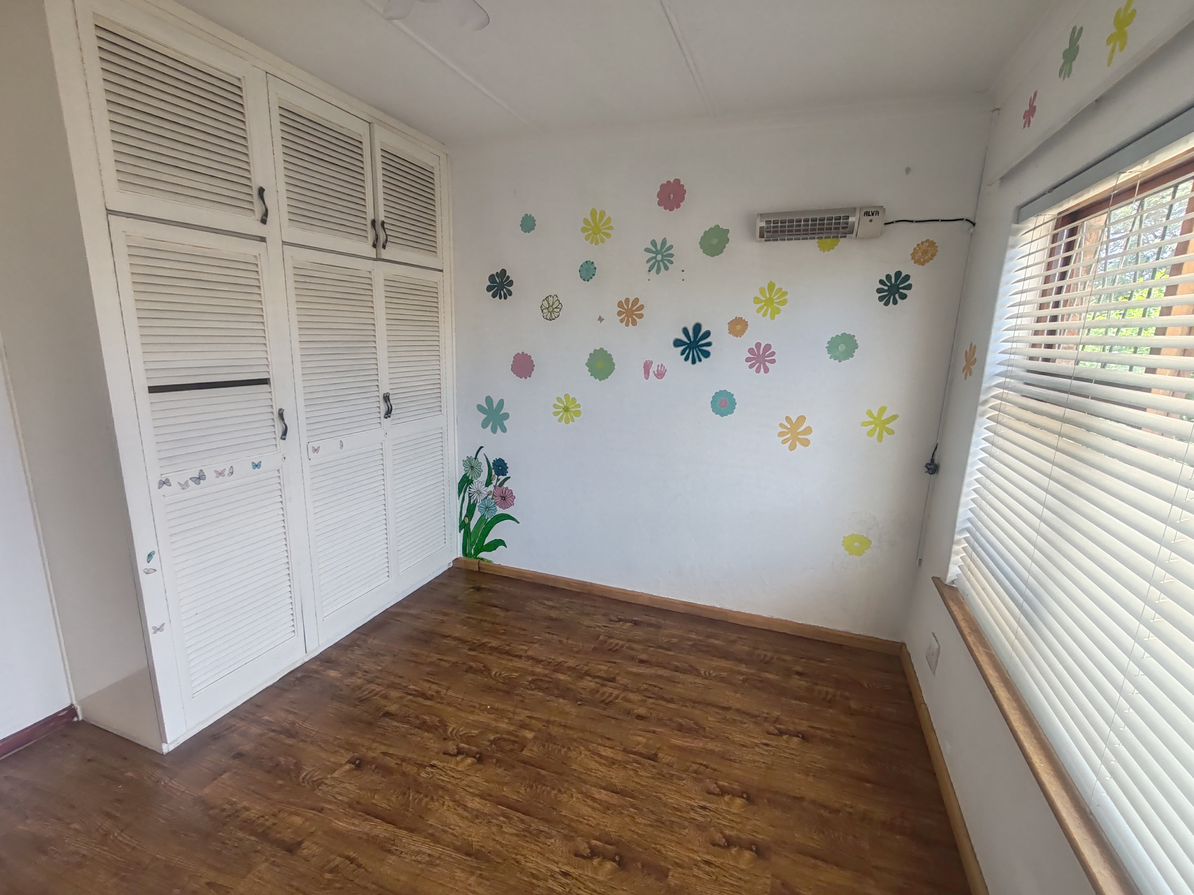 This home offers three well-sized bedrooms, all fitted with built-in cupboards. The main bedroom features a sliding door leading to the pool area, an air conditioner, and a private en-suite bathroom with shower, basin, and toilet.