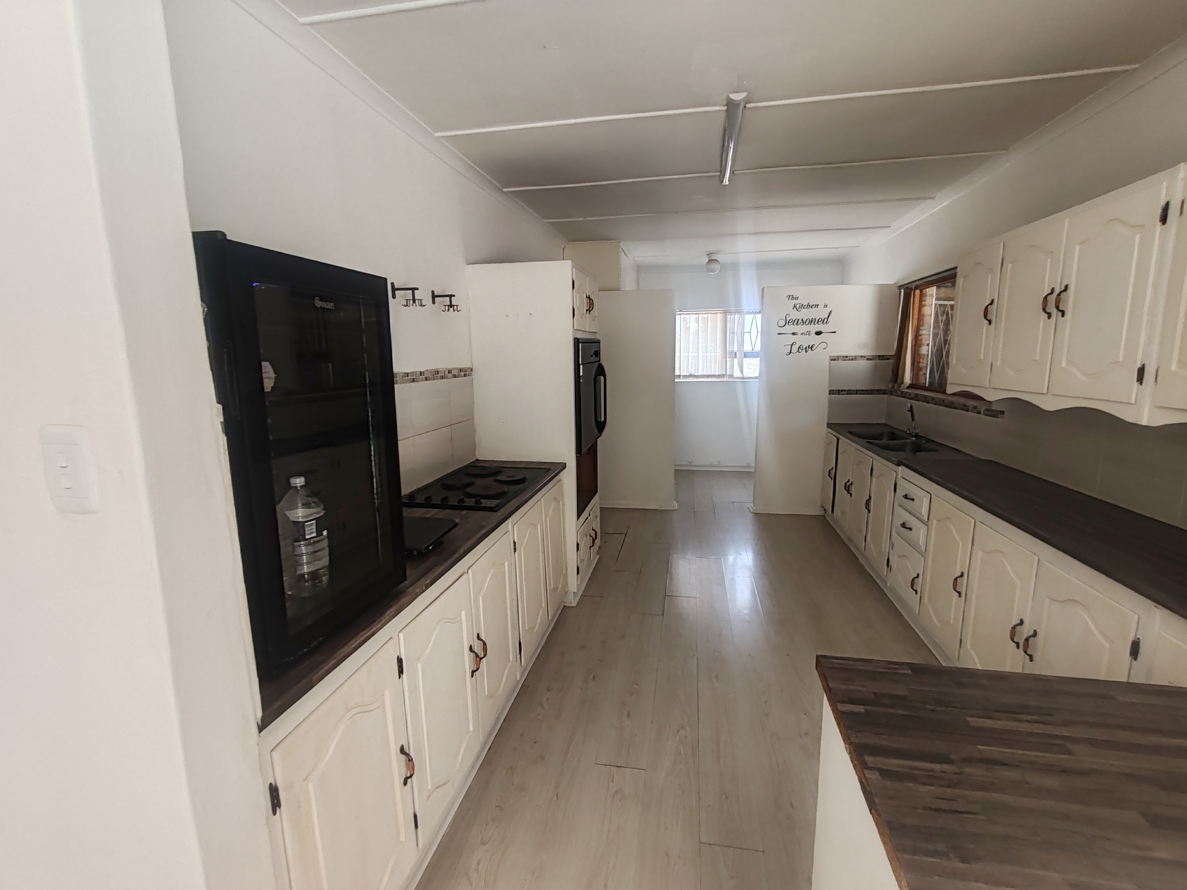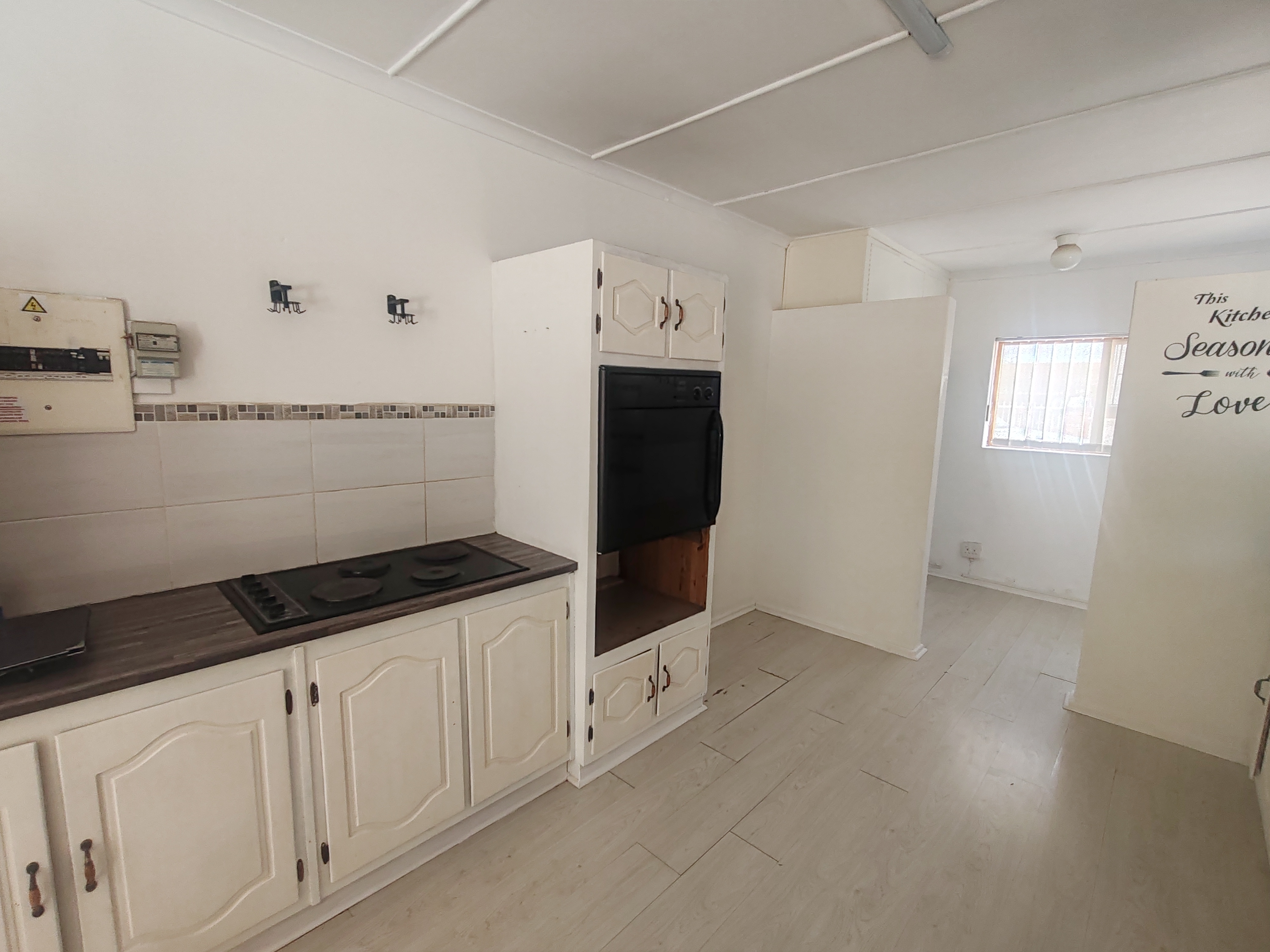 The spacious kitchen is fitted with ample cupboards, an eye-level oven, hob, and includes a conveniently placed laundry area.