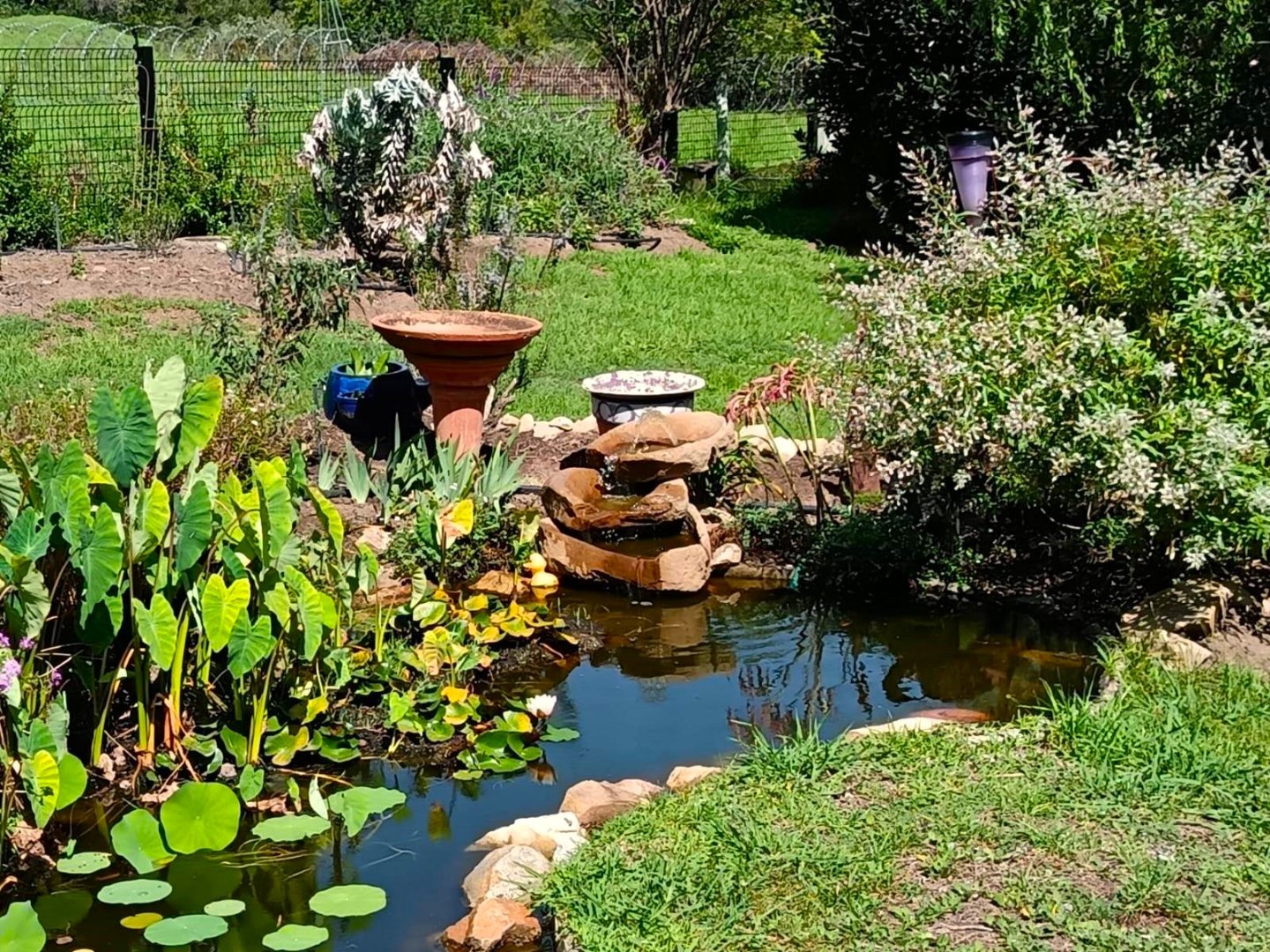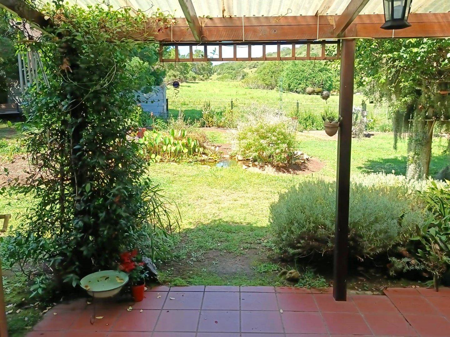 The fully fenced property boasts a large garden with a pond and boarders a farm creating the feeling of open space.
