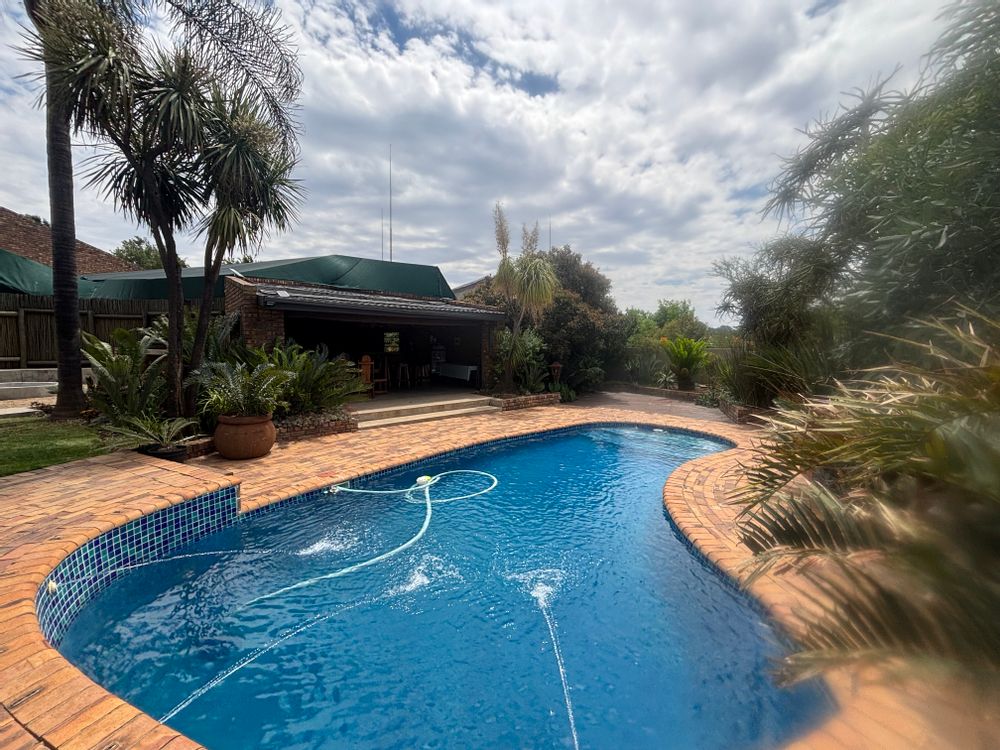 The property includes five bedrooms and two bathrooms, with the master suite featuring a walk-in closet. Outside, you'll find lush gardens, a lapa, a boma, and a stunning swimming pool that create a perfect outdoor retreat.