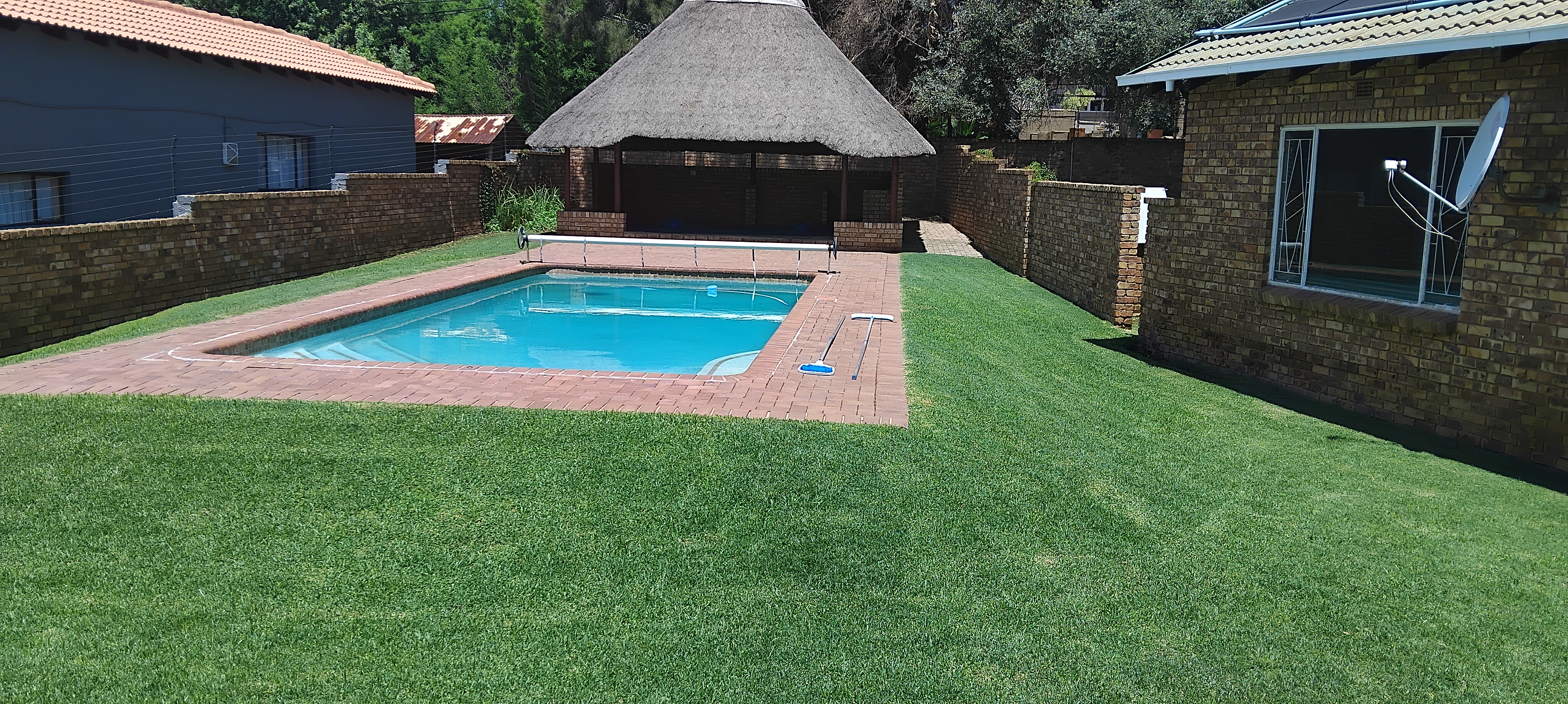 The home consist of 4 bedrooms with a study, 3 bathrooms with 2 guest toilets, a spacious welcoming entrance, 6 automated garages, a huge entertainment area with a bar and chairs, braai area opening to the outside where you find the sparkling heated pool with lapa. The dining area and leaving room are spacious. The kitchen with scullery has just been fitted with a new oven and a build in microwave. All windows are fitted with Blinds.
