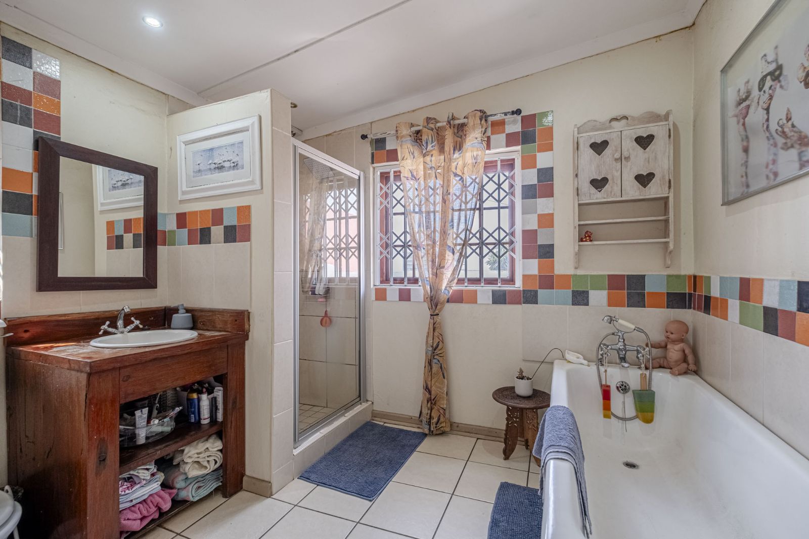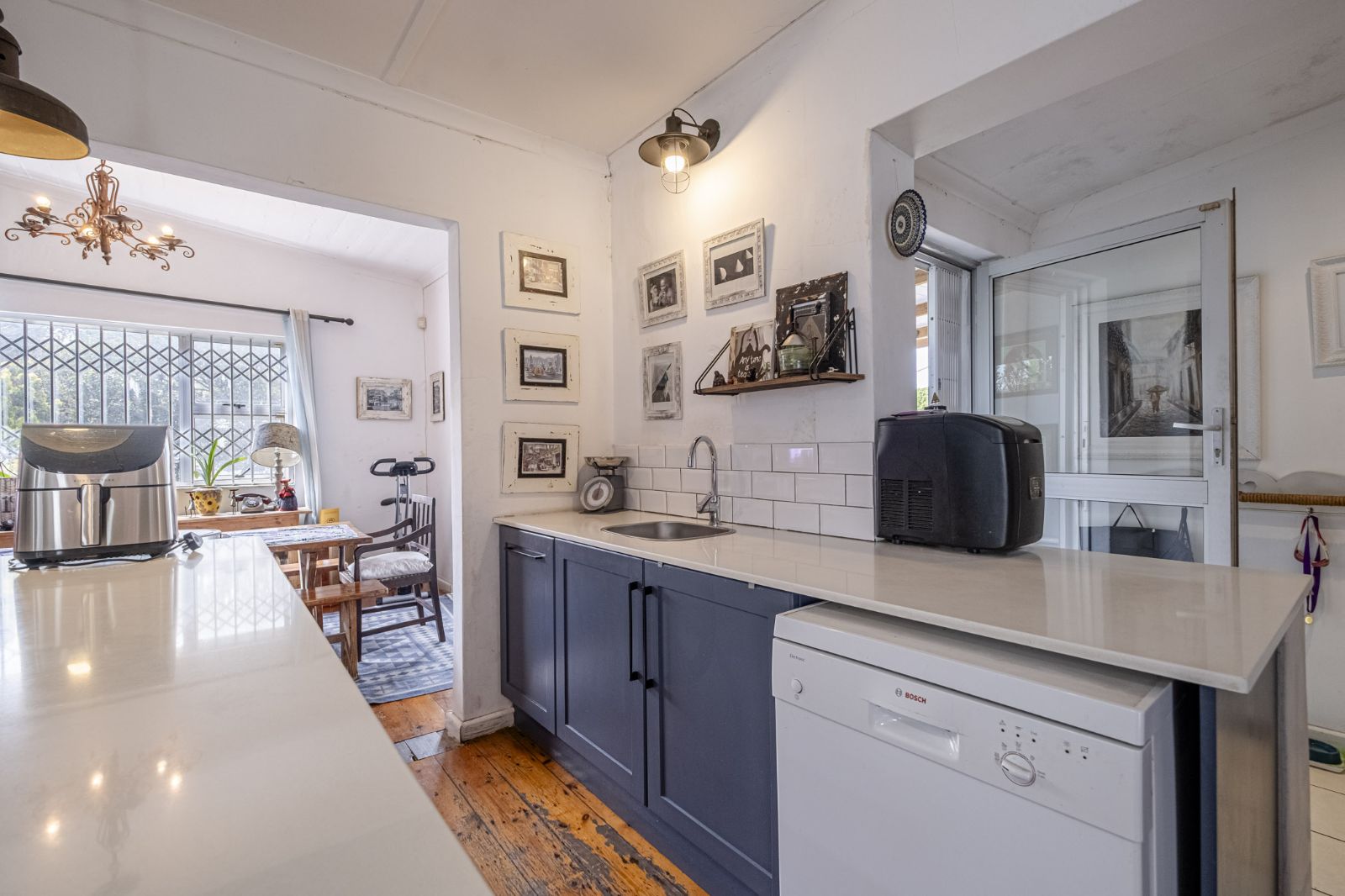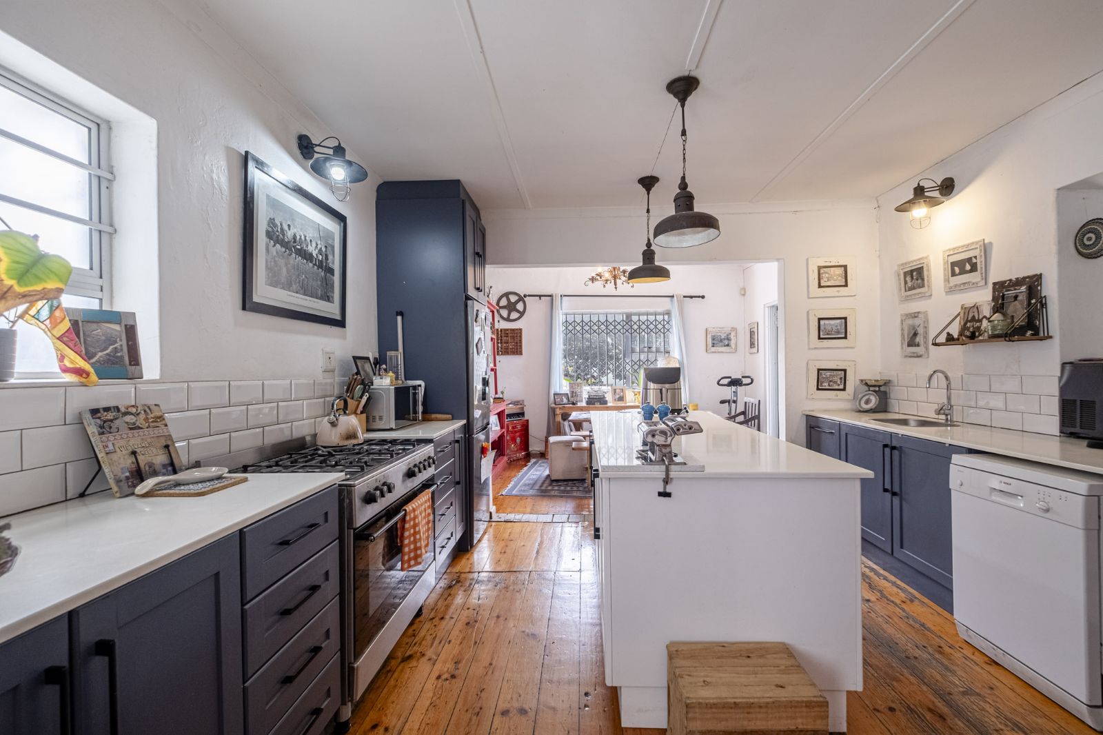 The kitchen gleams with quartz countertops and features a freestanding oven and gas hob, marrying timeless style with practical functionality. For safety and peace of mind, the home is equipped with burglar bars, an alarm system, and security gates. A rare find in the area, the tandem garage provides generous vehicle and storage options.