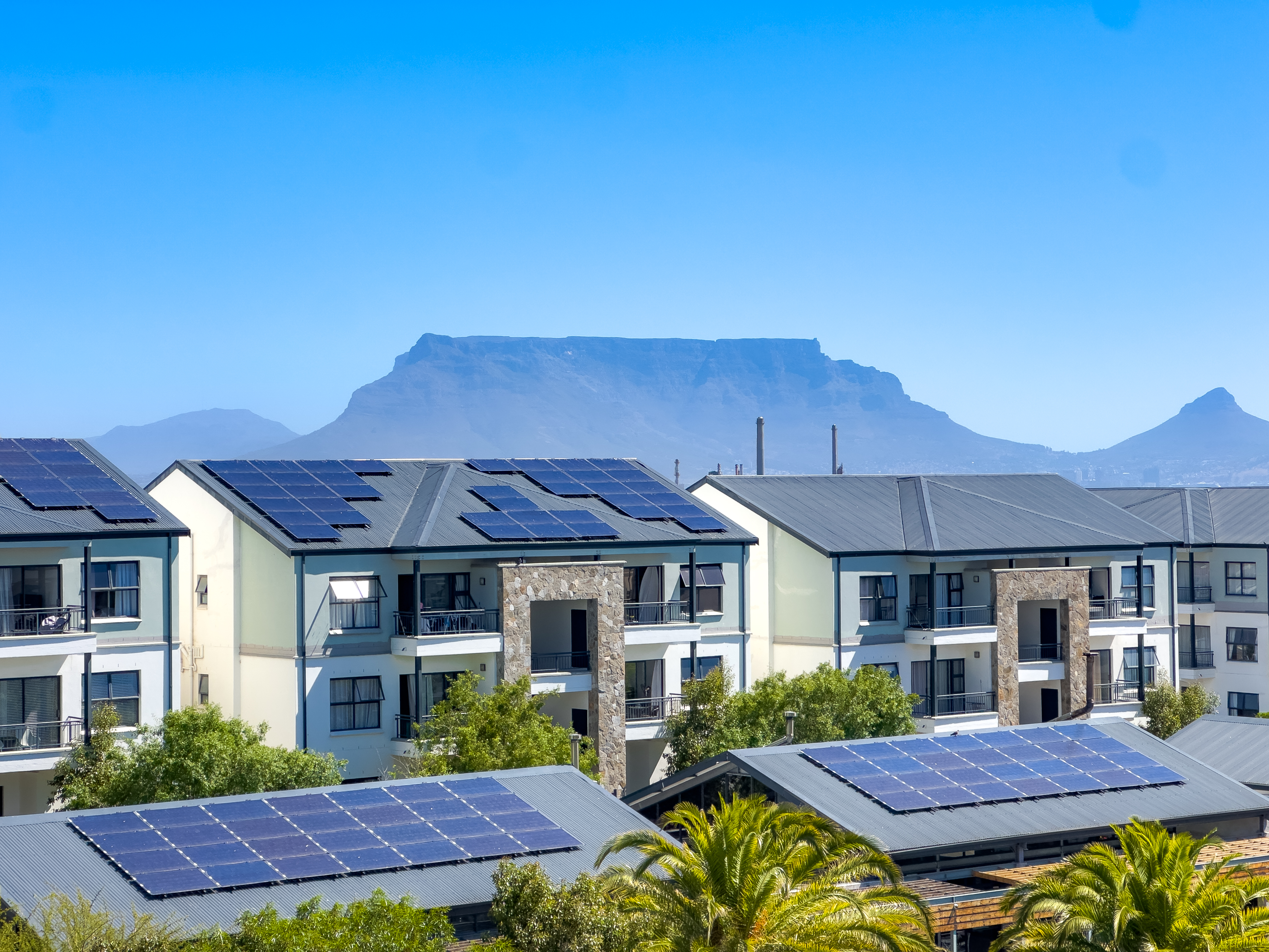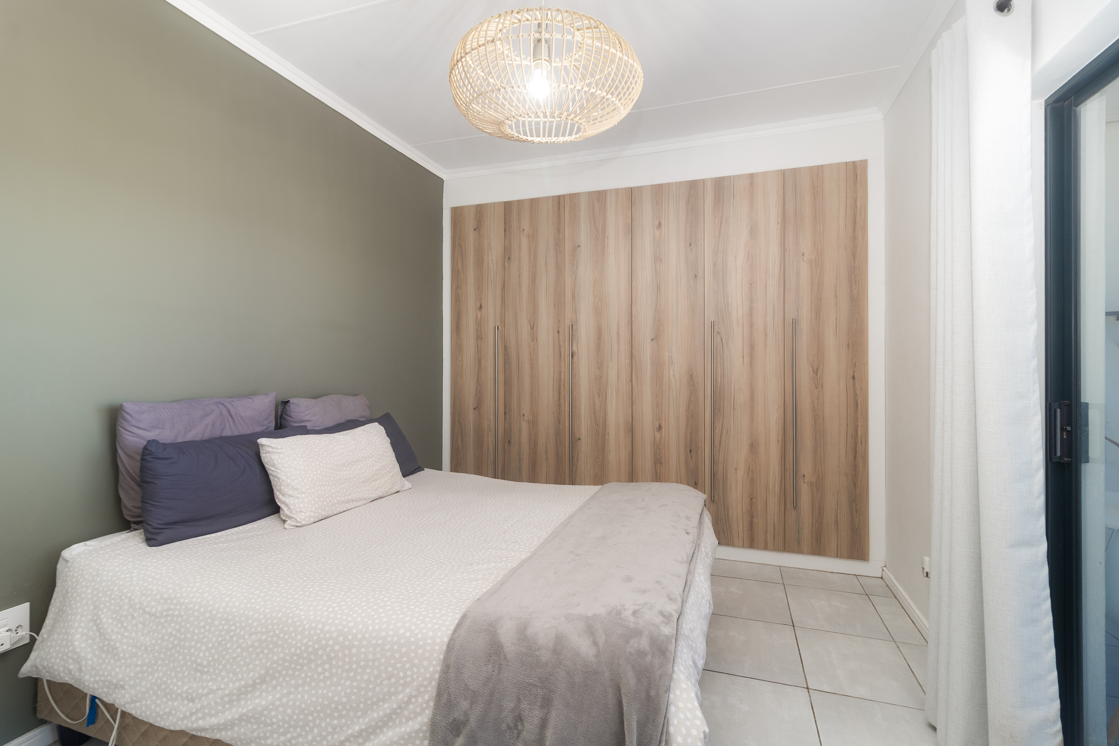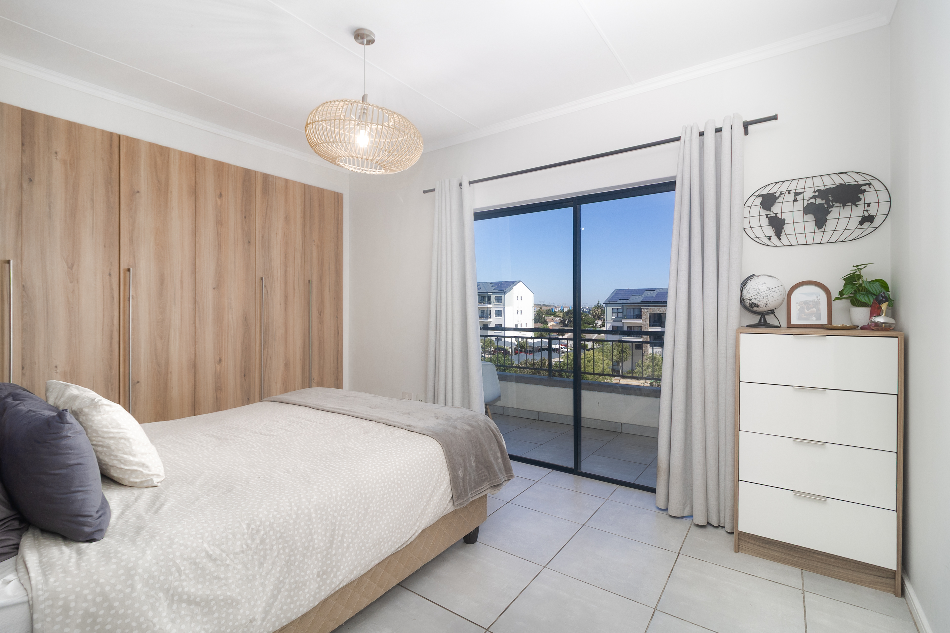 The spacious bedroom easily fits a queen or king-size bed and offers generous cupboard space. Doors from both the bedroom and living area open onto the balcony—your perfect spot to unwind, soak up the sunshine, and watch the sunset over Table Mountain.