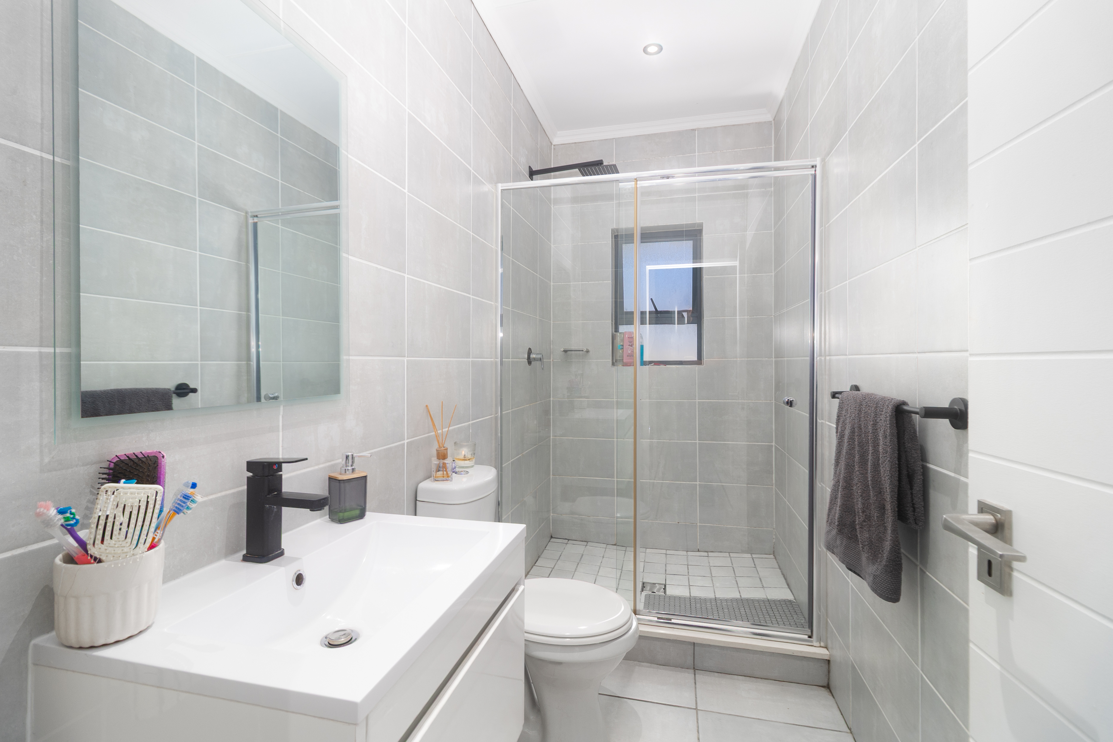 The bathroom is sleek and modern, fitted with a large shower, toilet, and basin, offering both comfort and style.