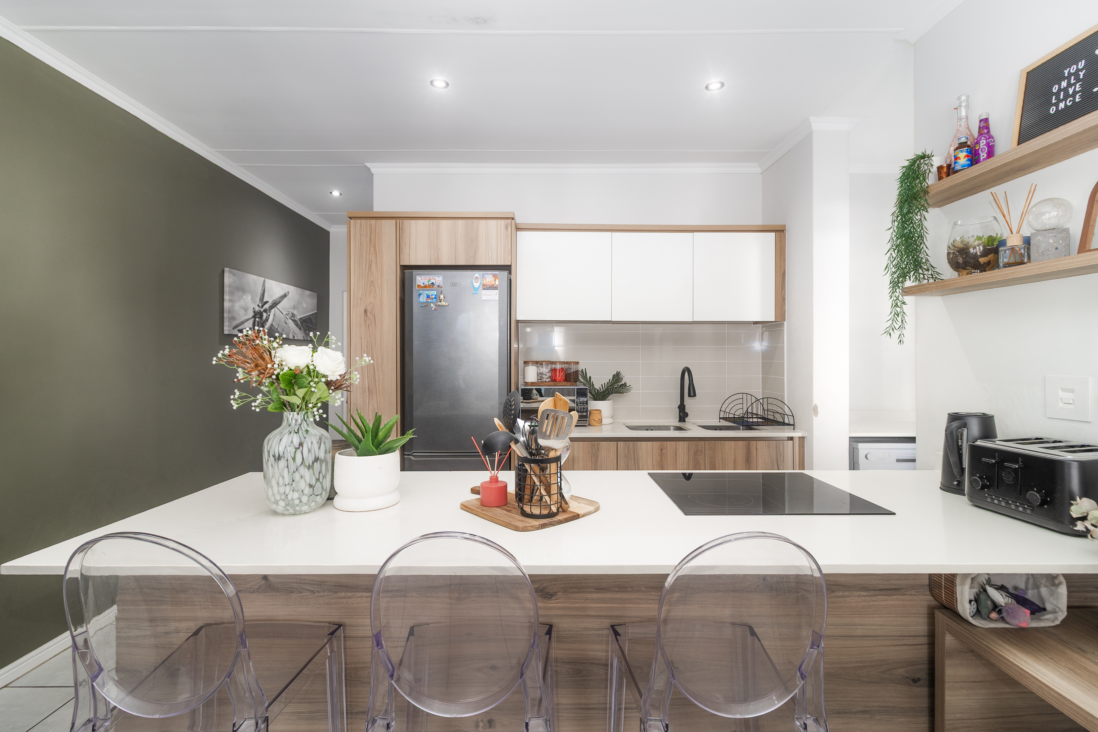 Step inside and you’re greeted by a bright, open-plan kitchen and living area filled with natural light. Large windows frame the mountain views, giving the apartment an uplifting, serene atmosphere. The kitchen is modern and practical, with ample storage and an extended countertop ideal for cooking, enjoying a meal, or entertaining loved ones.