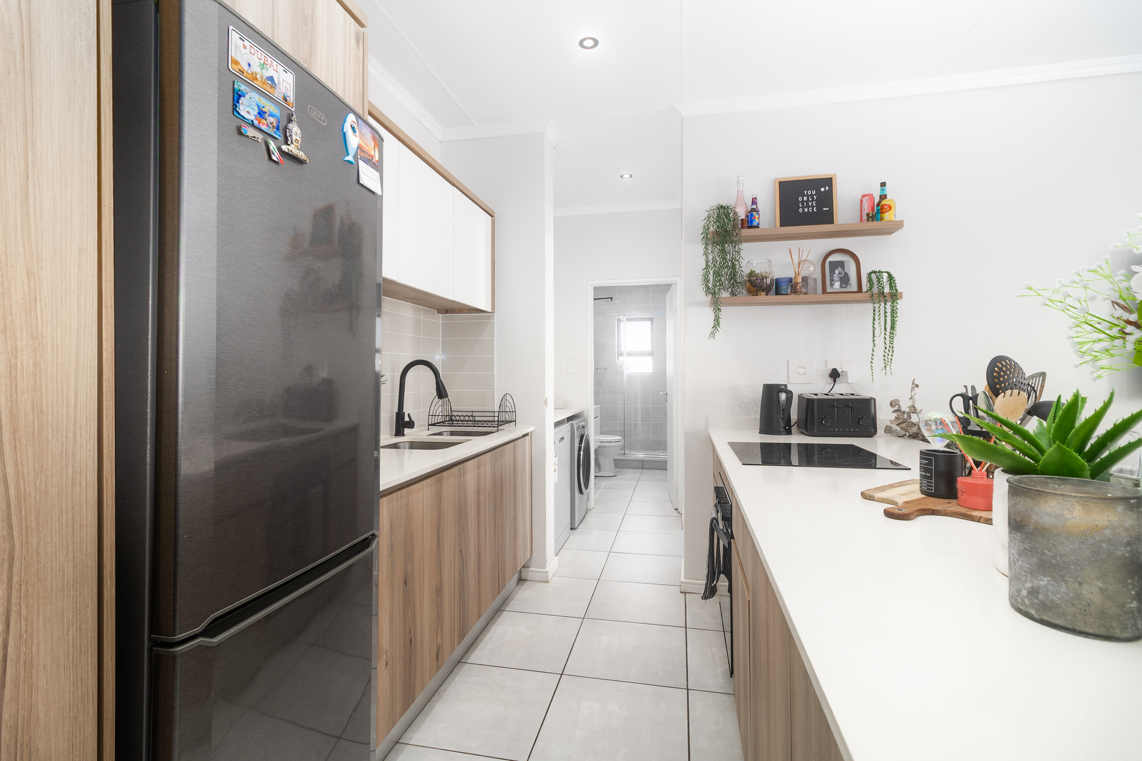 L-shaped couch • TV cabinet • Curtains (living room & bedroom) • Fridge • Dishwasher • Washing machine/dryer combo.