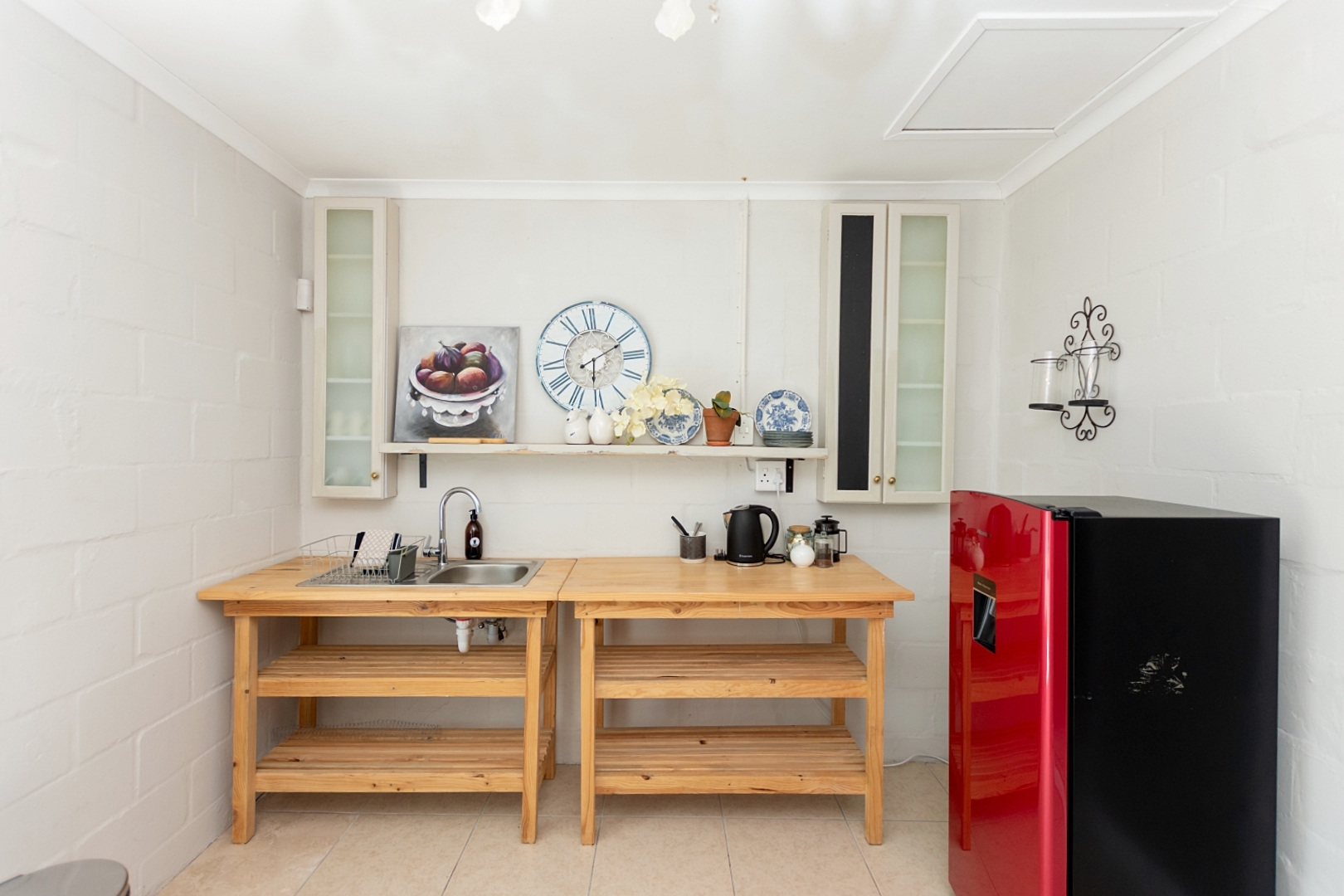 The country-style kitchen is both charming and practical, offering abundant cabinetry, generous workspace, and captivating views of fruit trees and the majestic Riebeek Mountains.