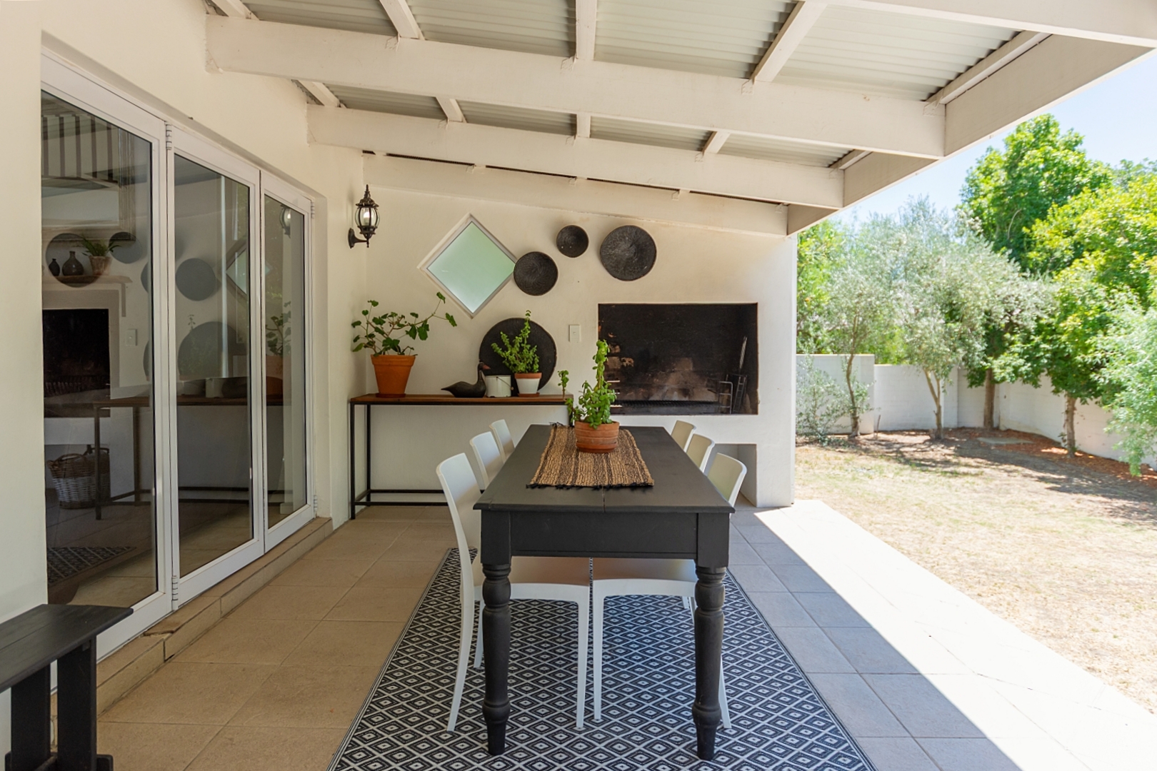 Stretching the full length of the home, this patio is truly the heart of outdoor living — an idyllic stage for long, lazy lunches, laughter-filled family gatherings, and evenings by the built-in braai. From here, gaze out over rolling green lawn and mature boundary trees that cocoon the home in privacy and serenity.