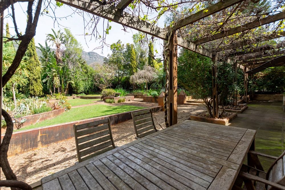 Outdoors, the property is equally impressive: a beautifully landscaped garden frames a sparkling plunge pool, with large trees creating shady, tranquil spaces for relaxation. A dedicated braai area makes entertaining a pleasure, while an enclosed vegetable garden allows for homegrown produce. An outside room provides additional flexibility, ideal for tool storage or use as a laundry room, while a reliable borehole ensures water security.