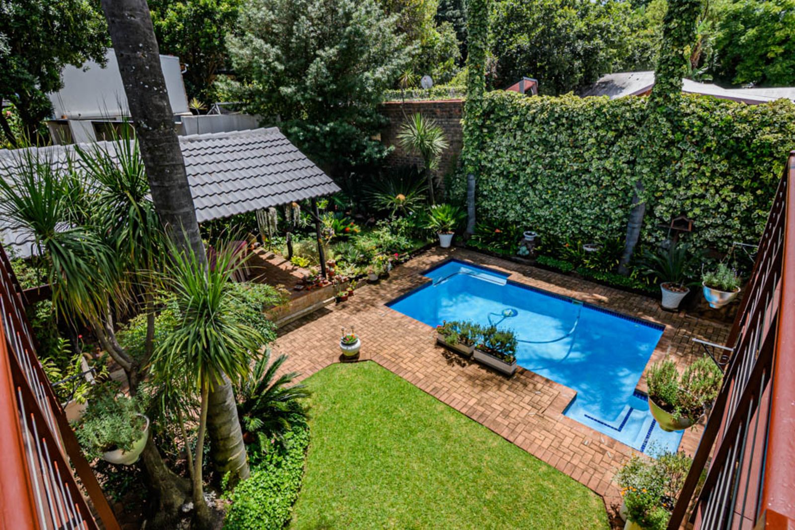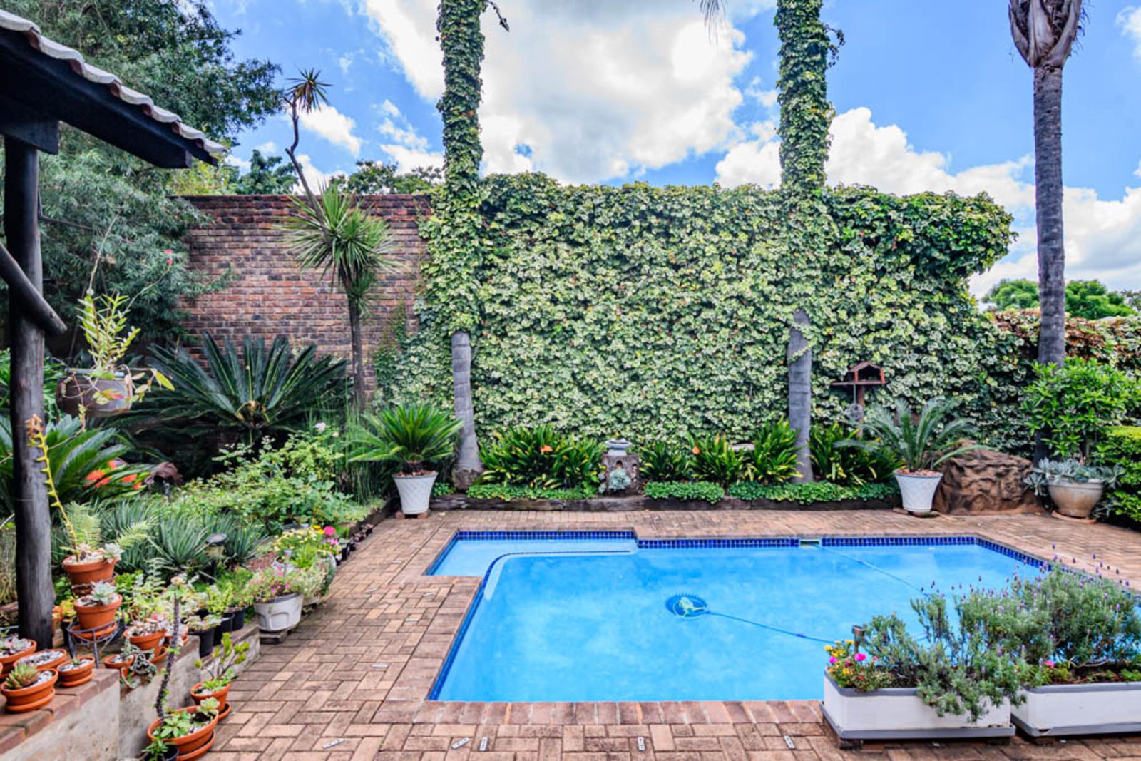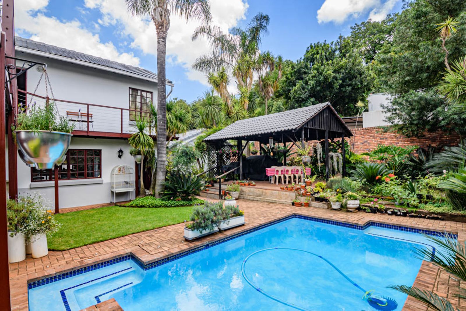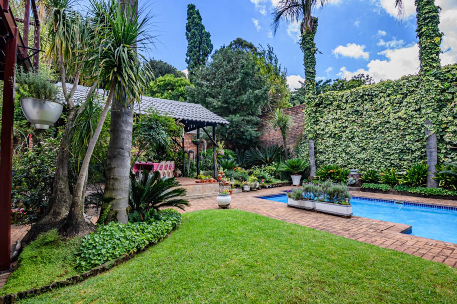 Landscaped garden with established plants, sparkling swimming pool, vegetable garden and irrigation.