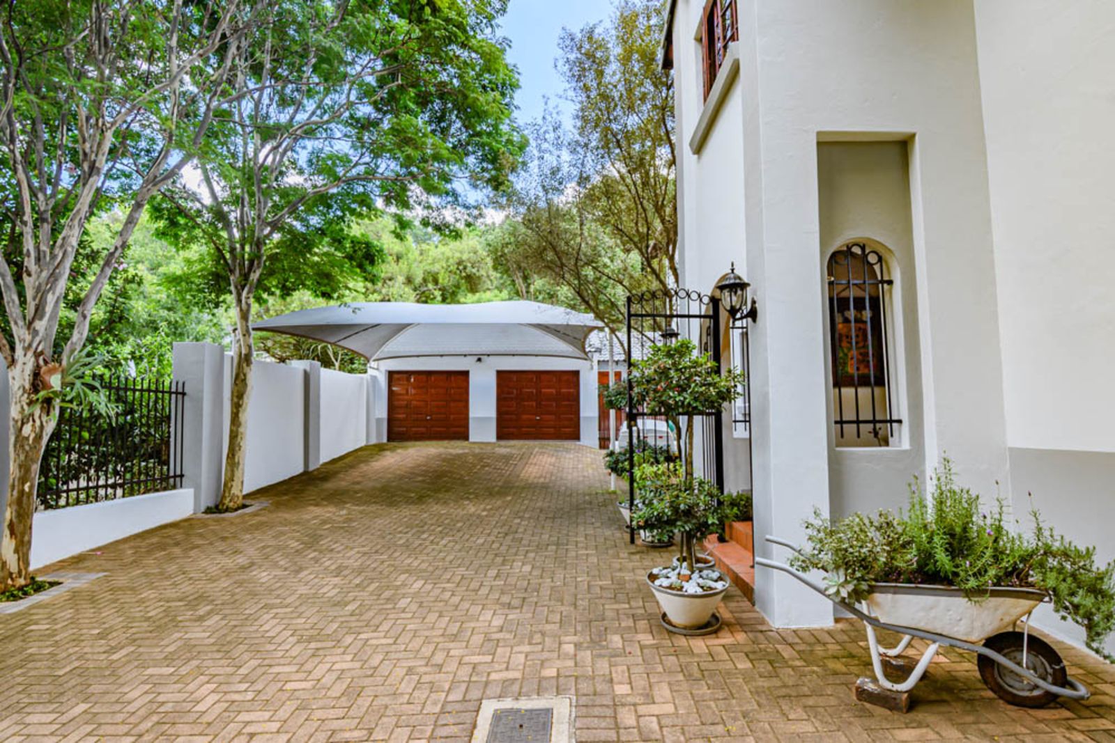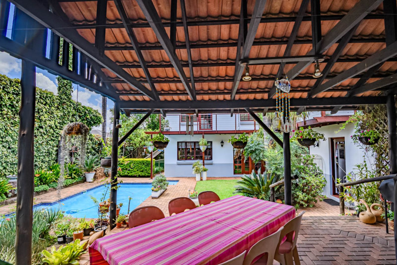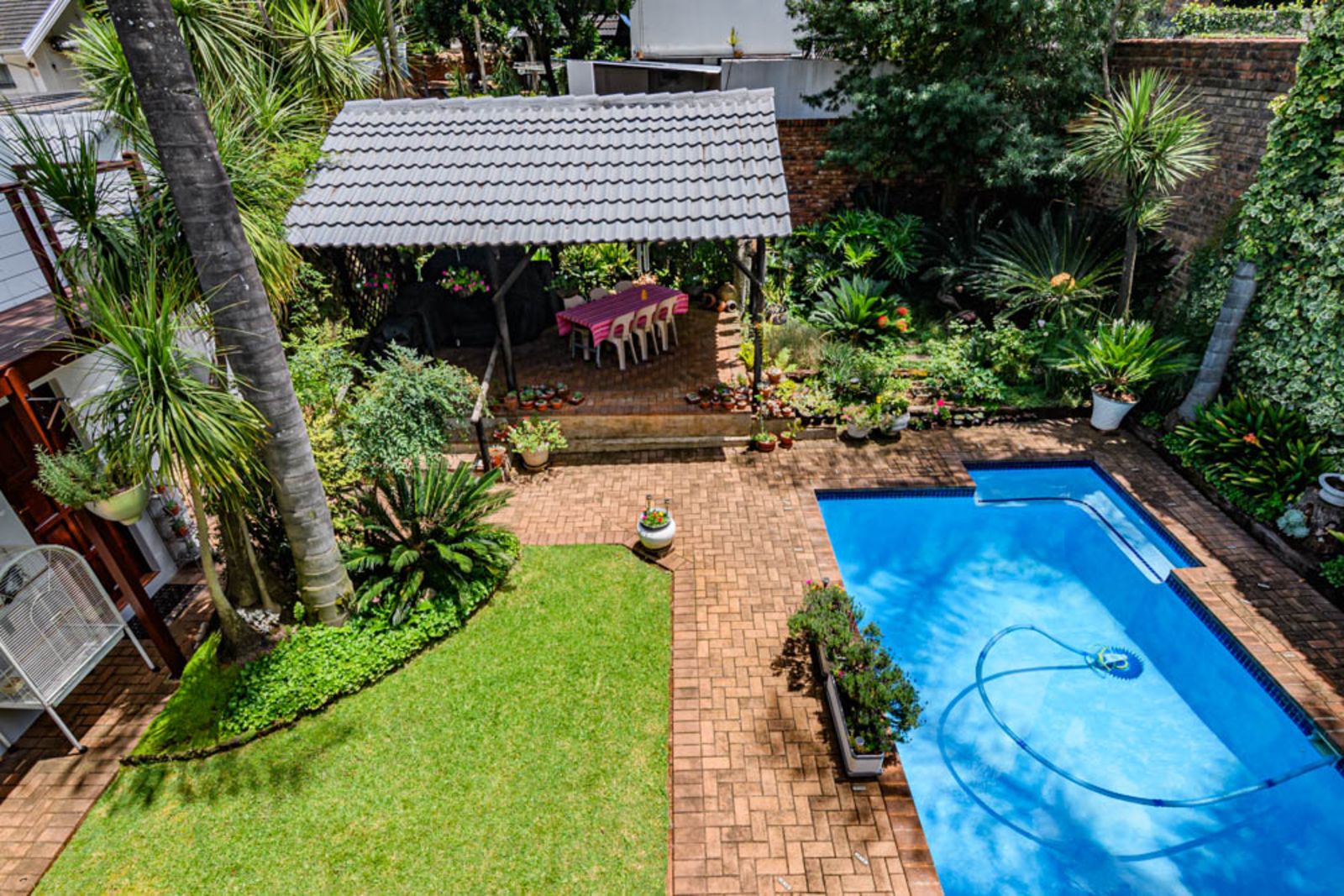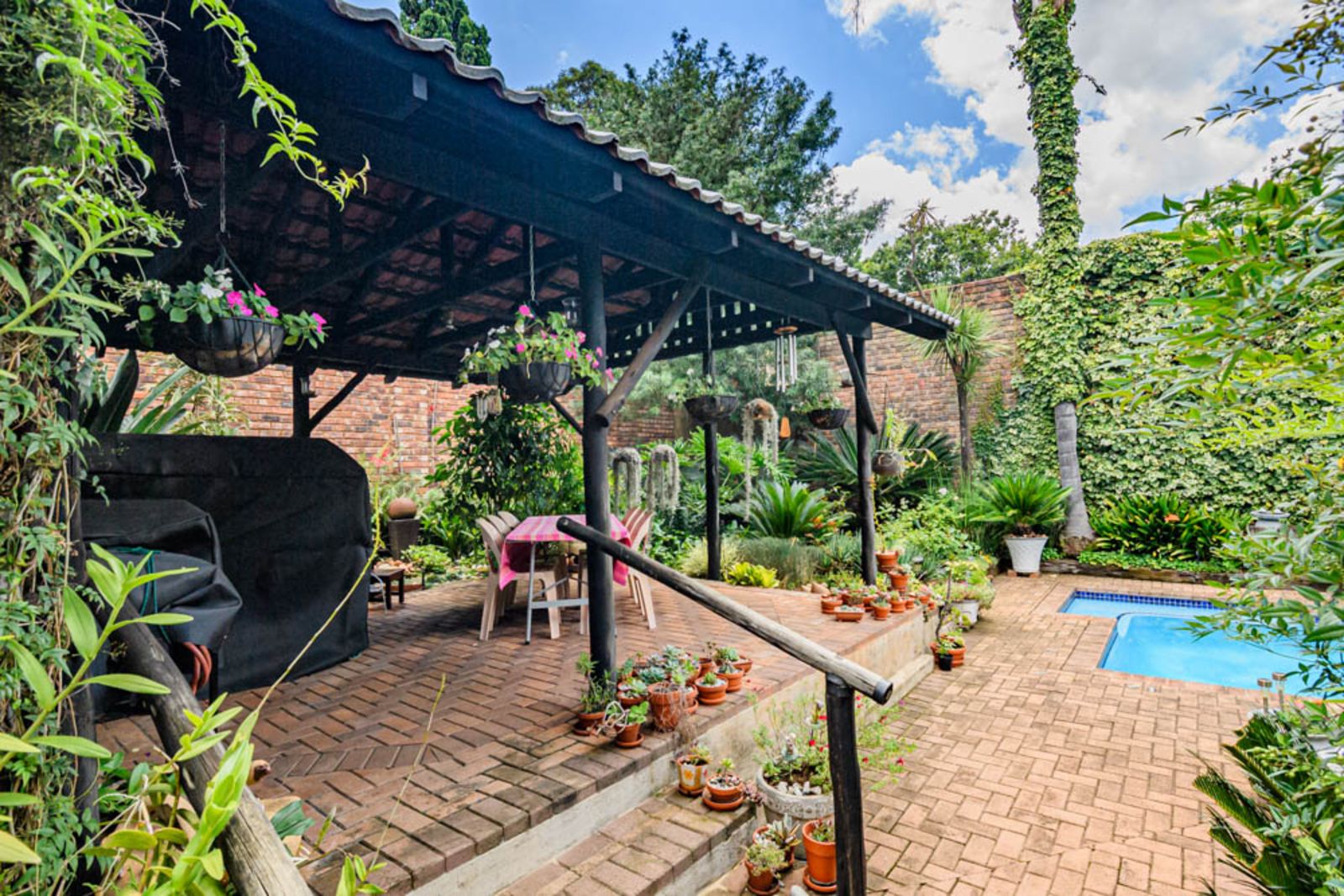 Landscaped garden with established plants, sparkling swimming pool, vegetable garden and irrigation.