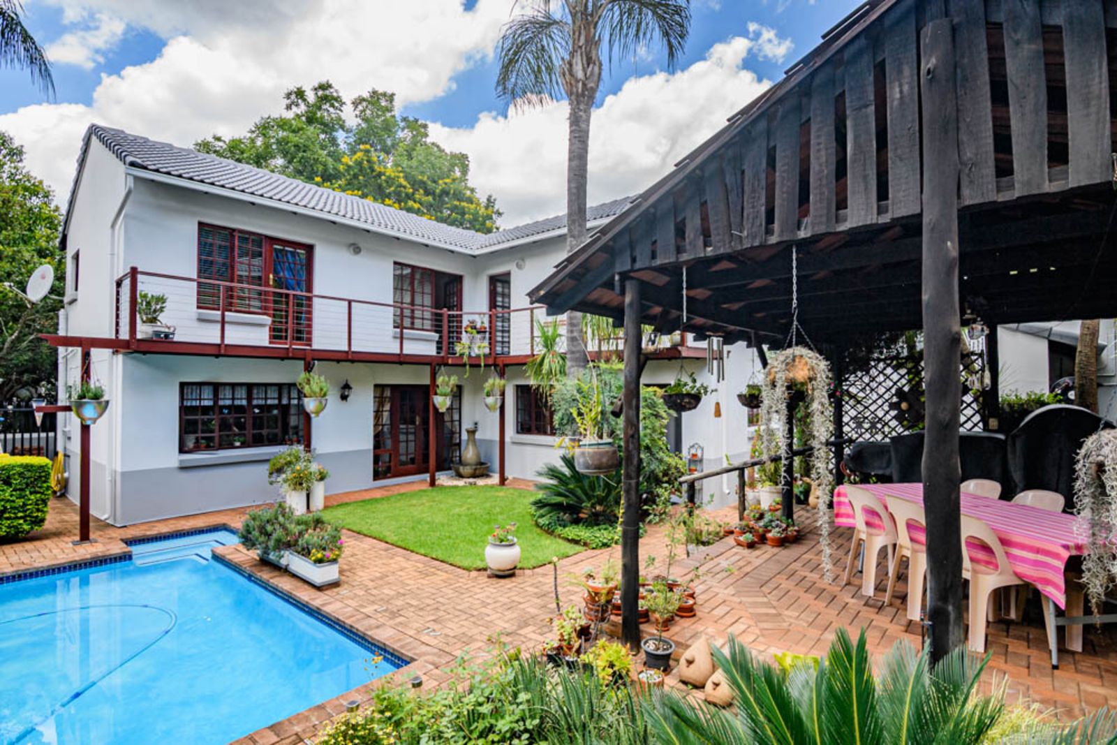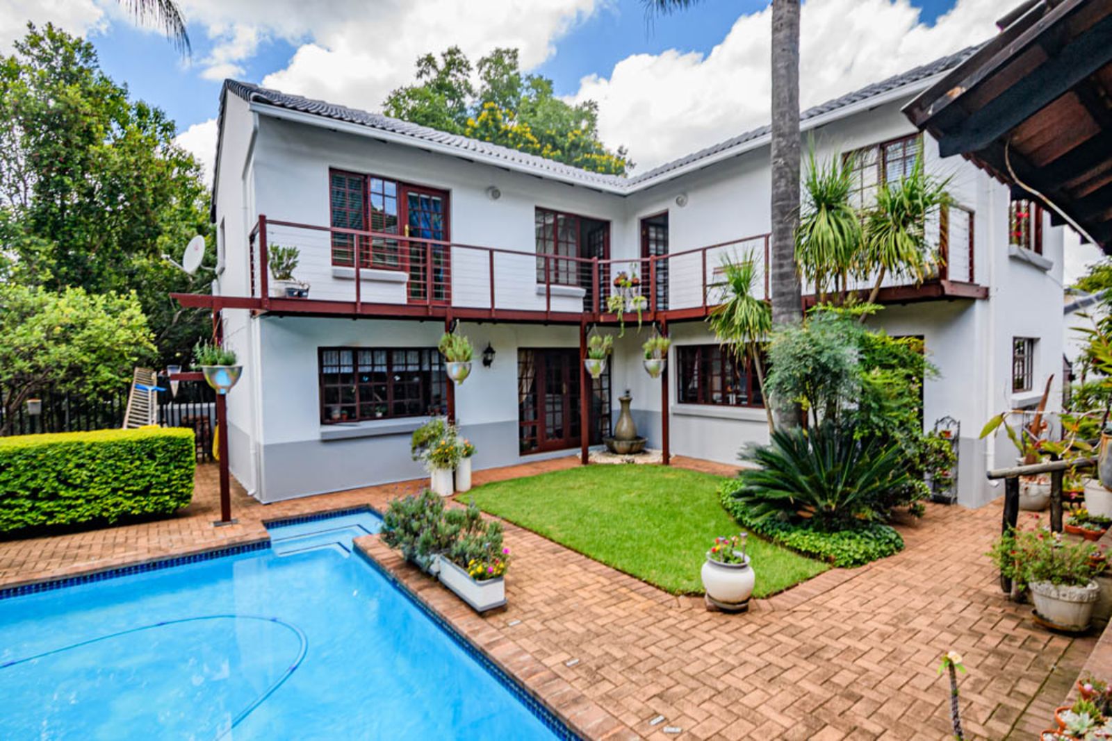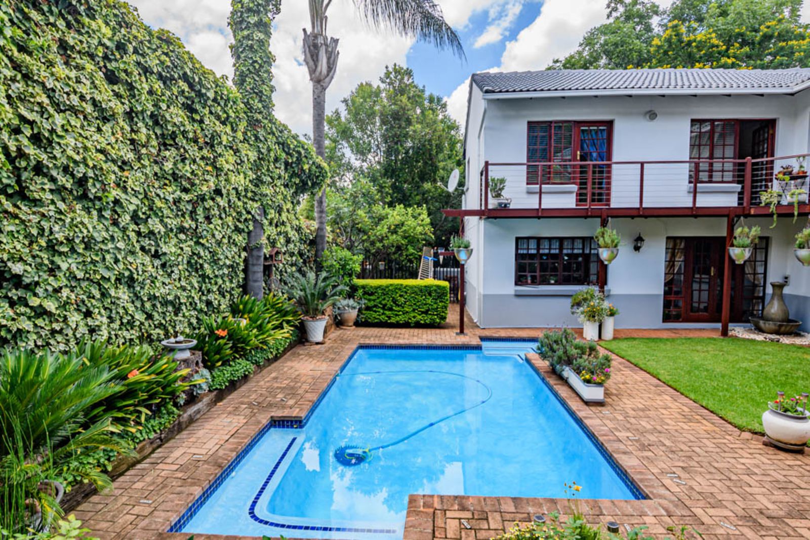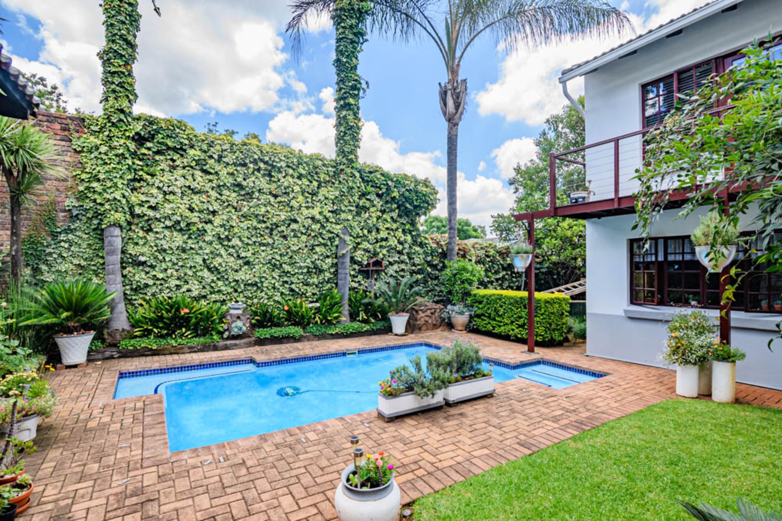 All the bedrooms walk out on a small balcony overlooking the private garden and swimming pool area. All the windows upstairs come with high-quality installed blinds – move-in ready!